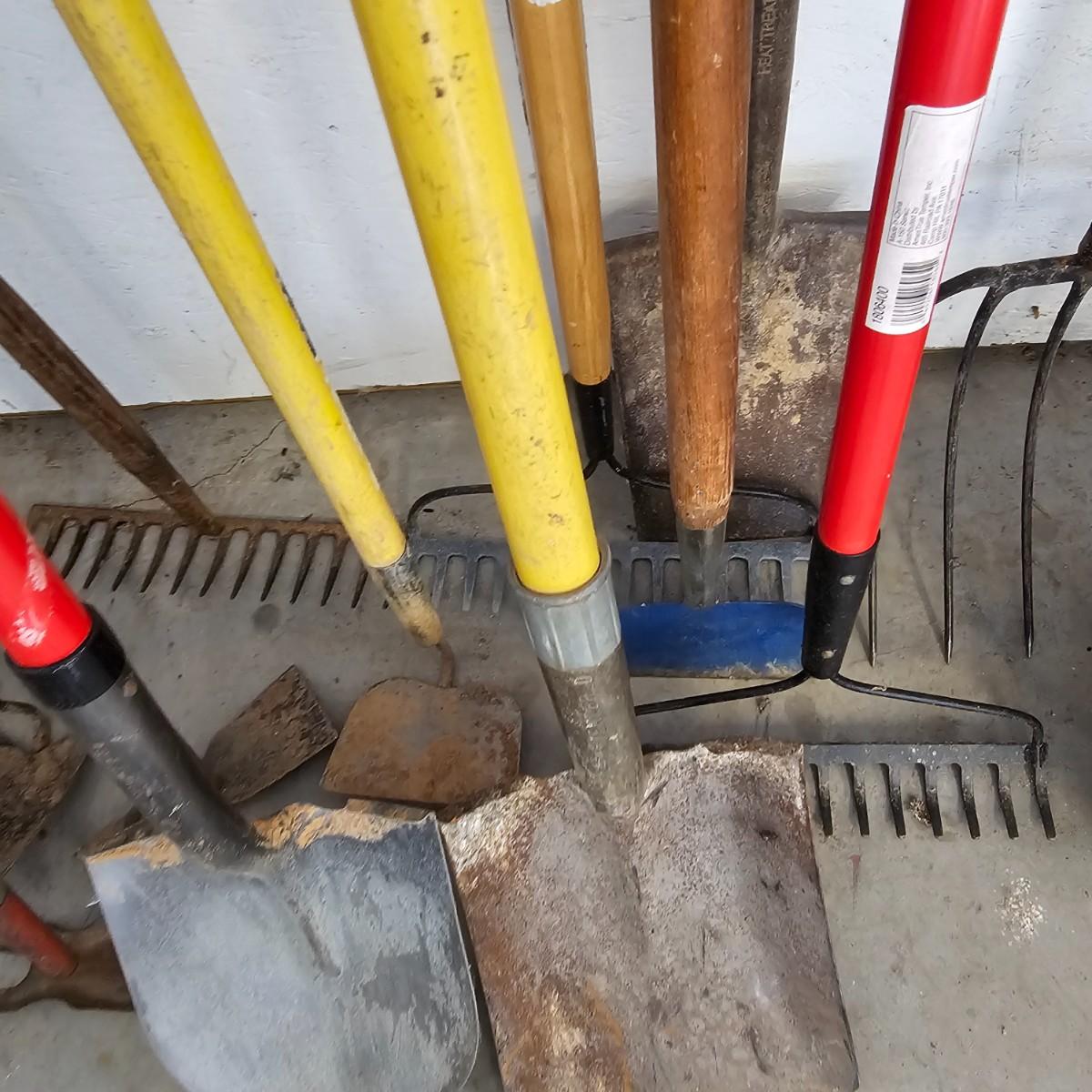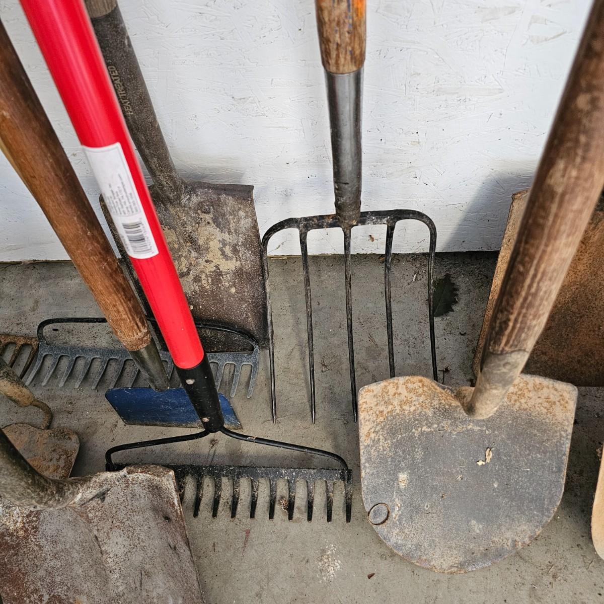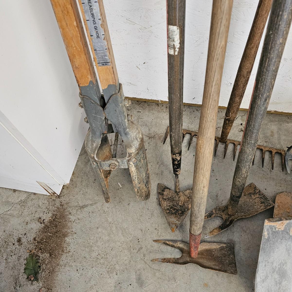 Large collection of long handle garden tools and more. Metal rakes, hoes and posthole diggers. Round point and square shovels in different sizes. Longest item measures 67", shortest shovel is 27". All items used. See photos for details. Local pickup only.