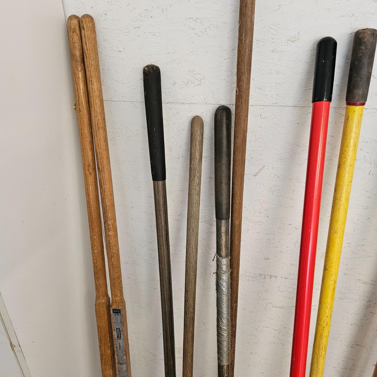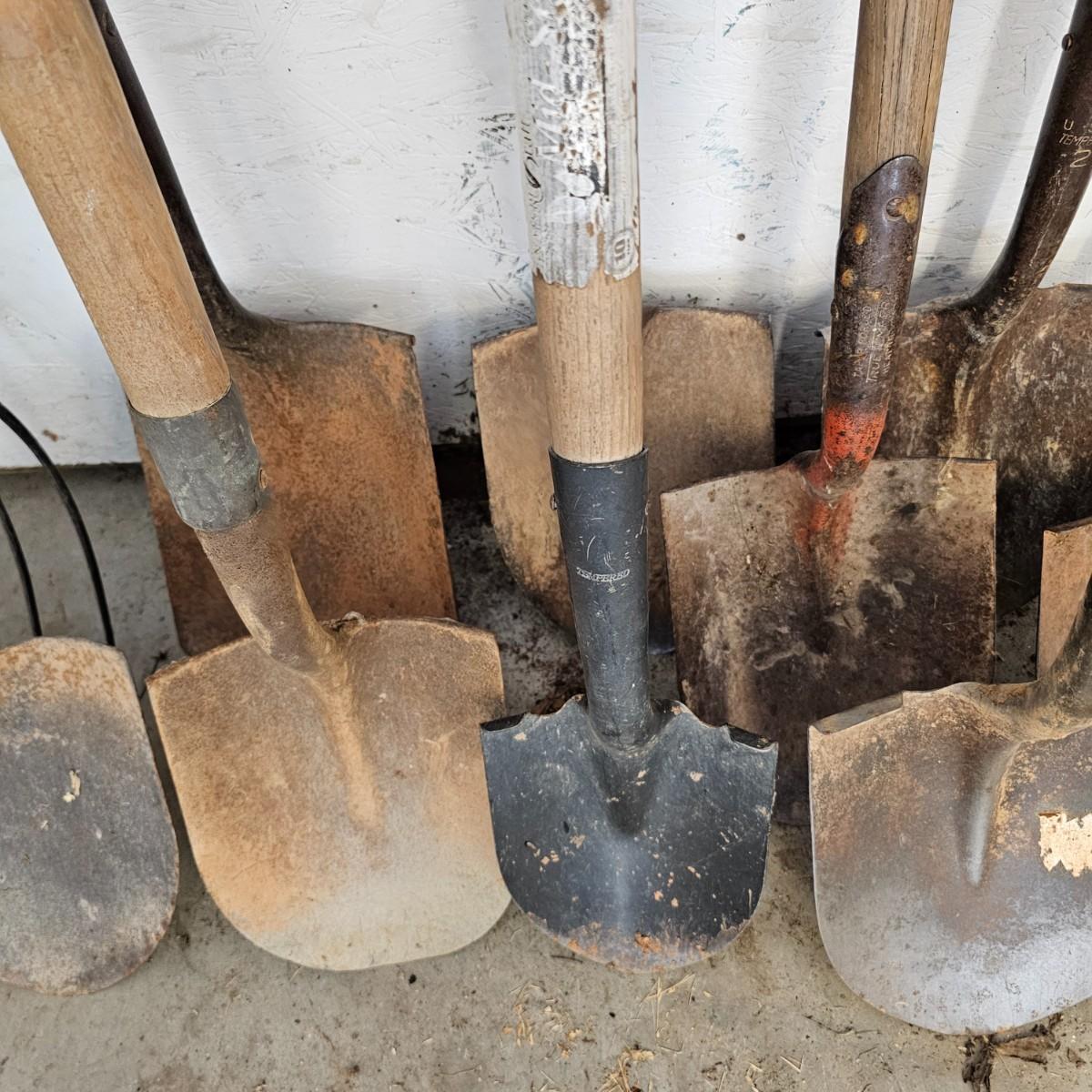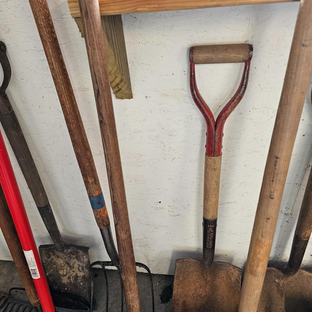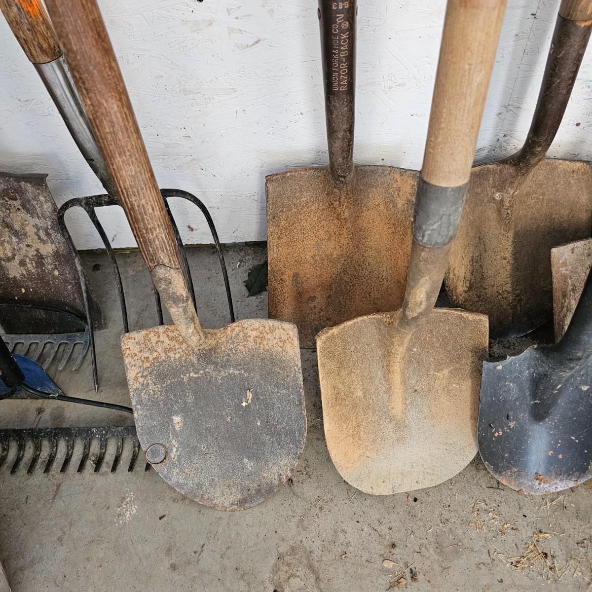 Large collection of long handle garden tools and more. Metal rakes, hoes and posthole diggers. Round point and square shovels in different sizes. Longest item measures 67", shortest shovel is 27". All items used. See photos for details. Local pickup only.