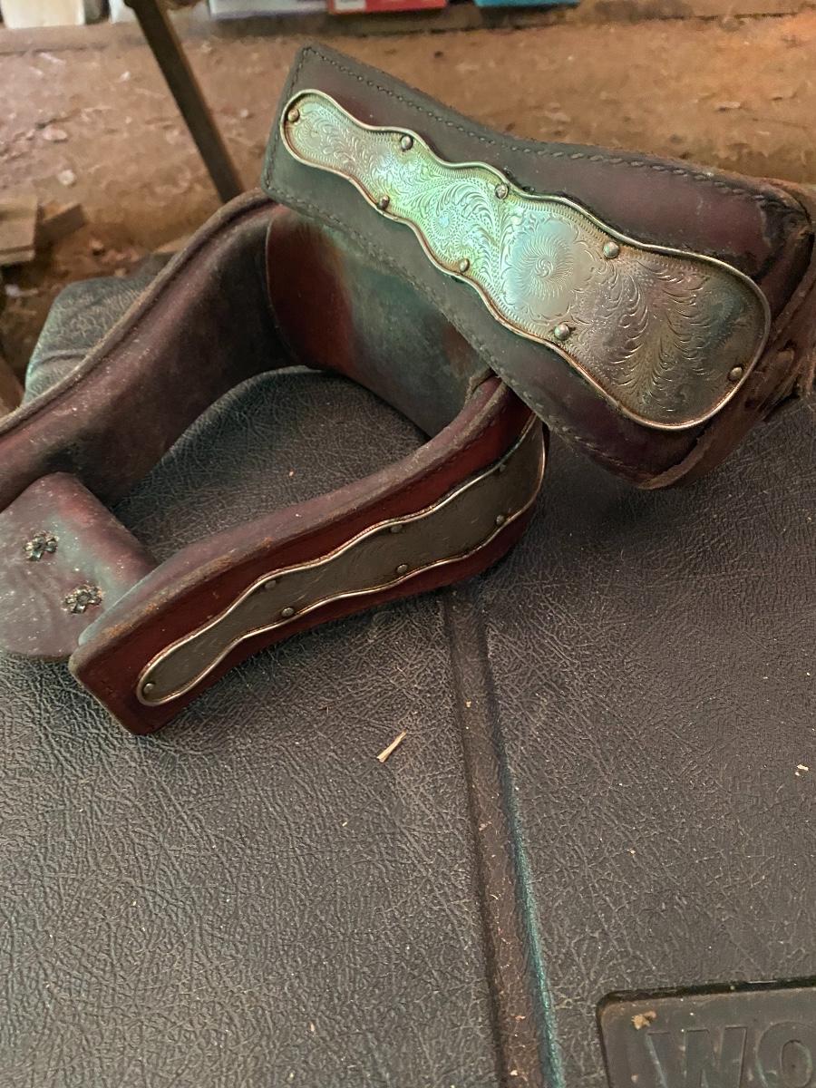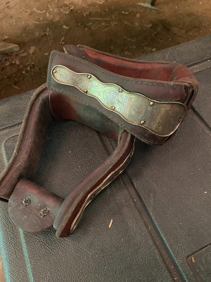 Beautiful heavy carved wooden stirrups leather wrapped silver trimmed