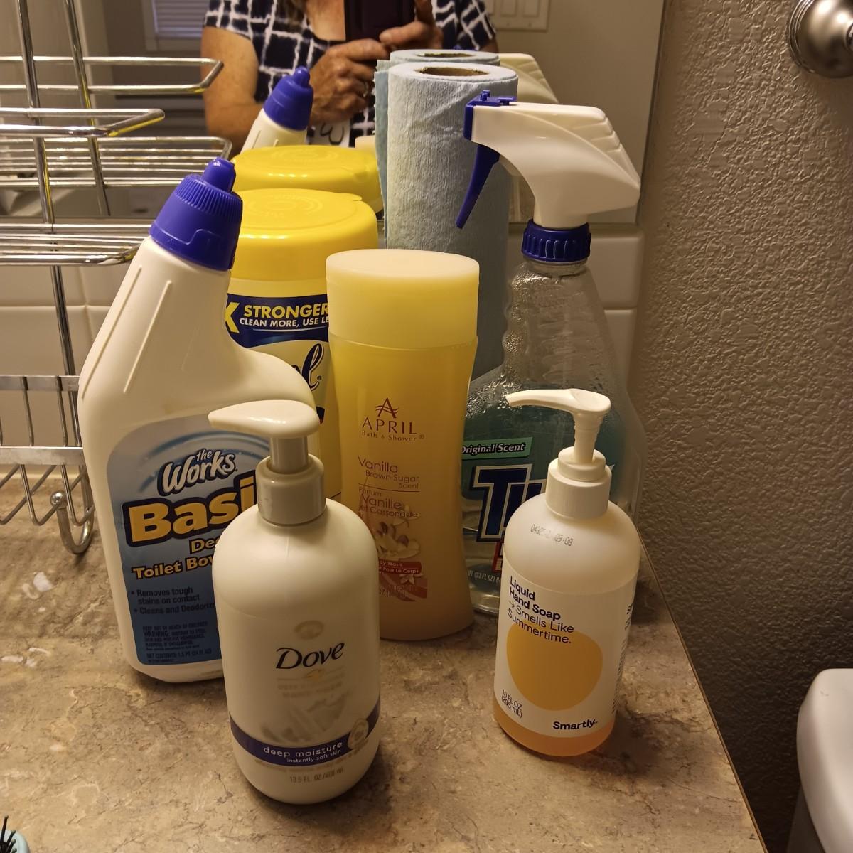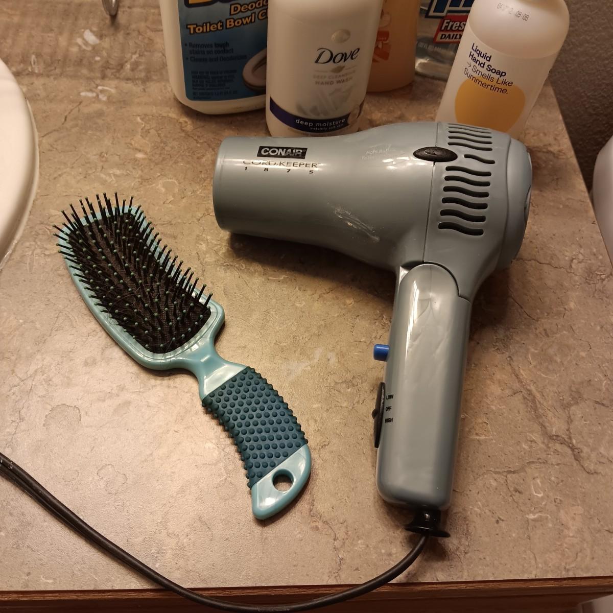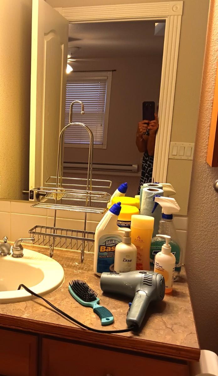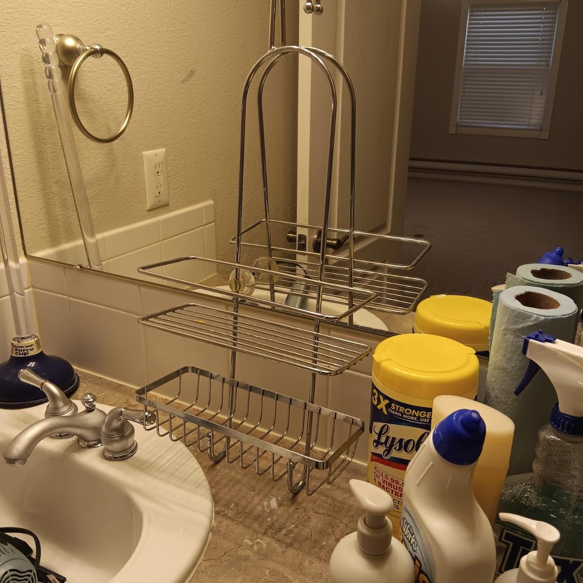 SHOWER CADDY, CLEANERS AND HAIR DRYER