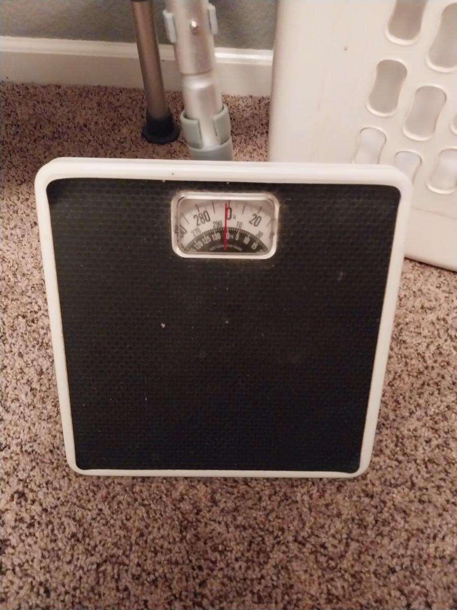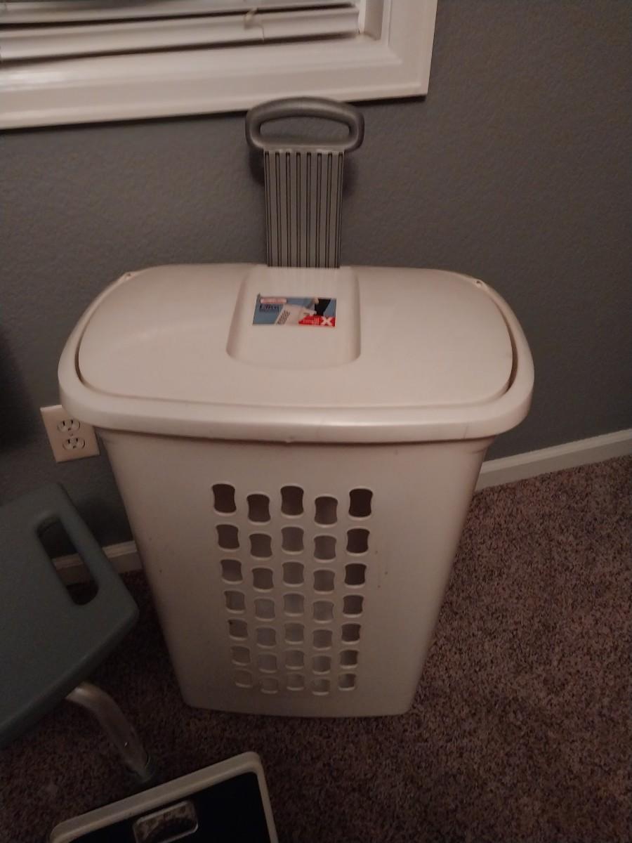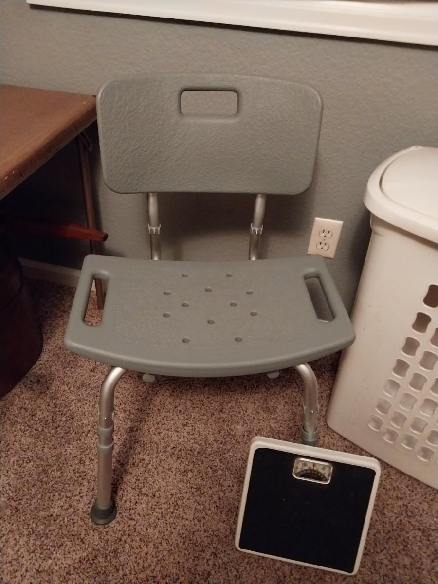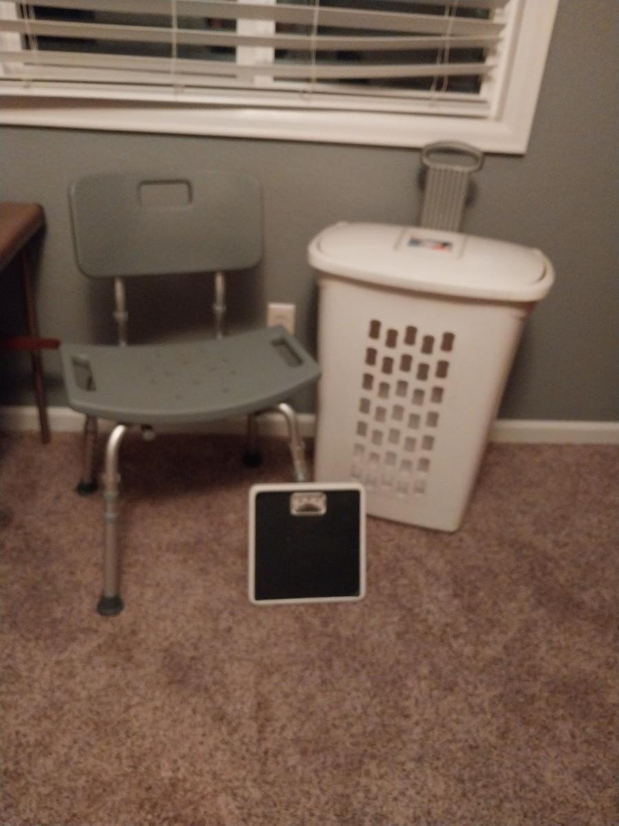 SHOWER CHAIR, BATH SCALE AND A LAUNDRY BASKET ON WHEELS