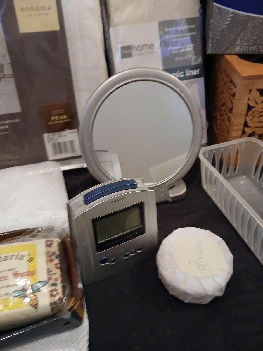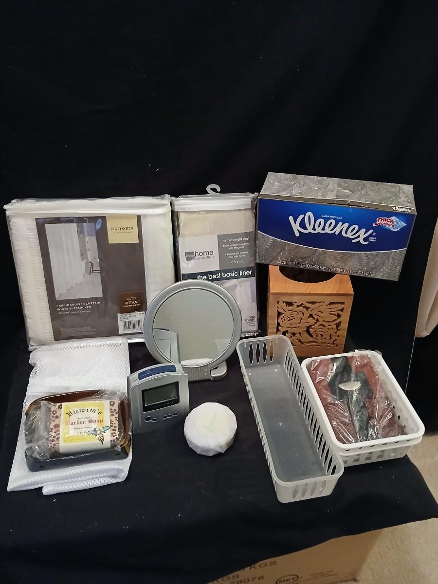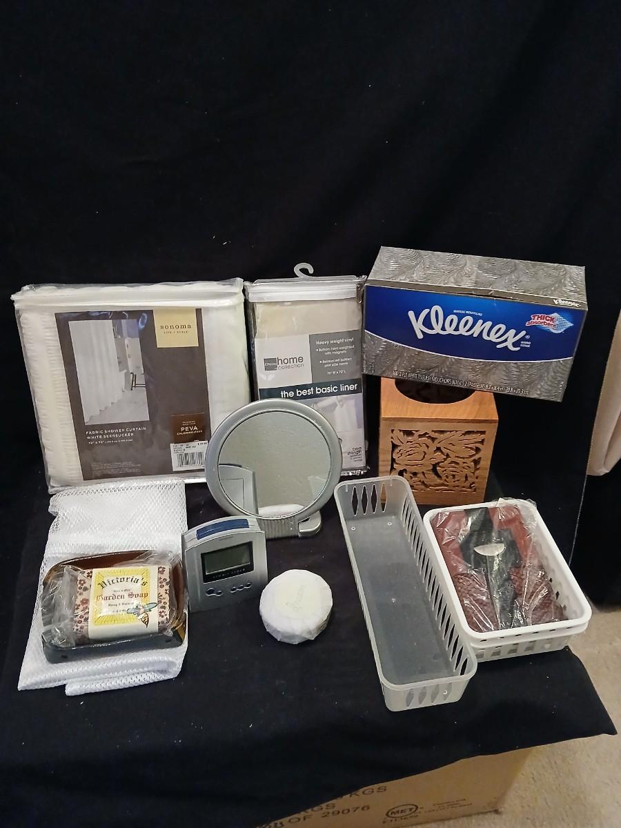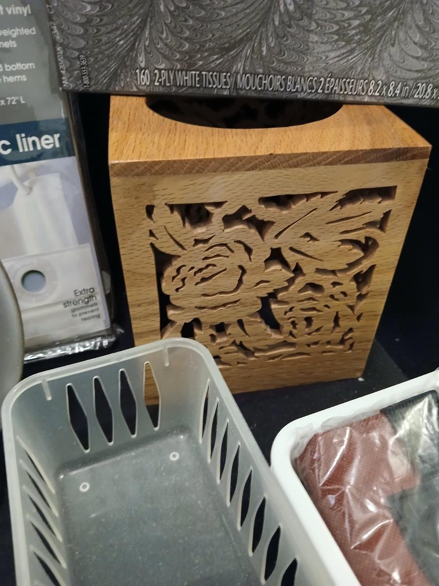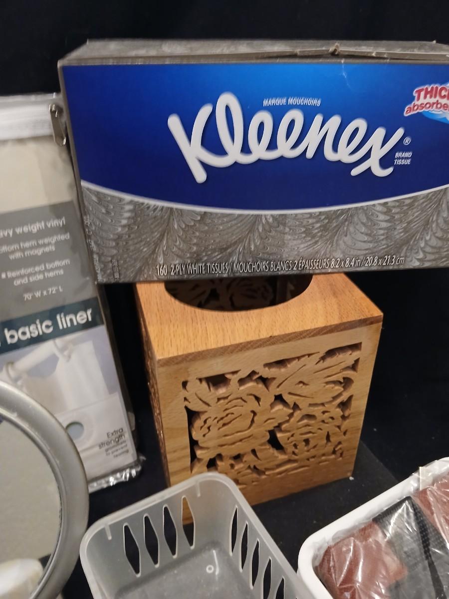 Shower curtain hand mirror, Kleenex wooden laser art Kleenex box and more