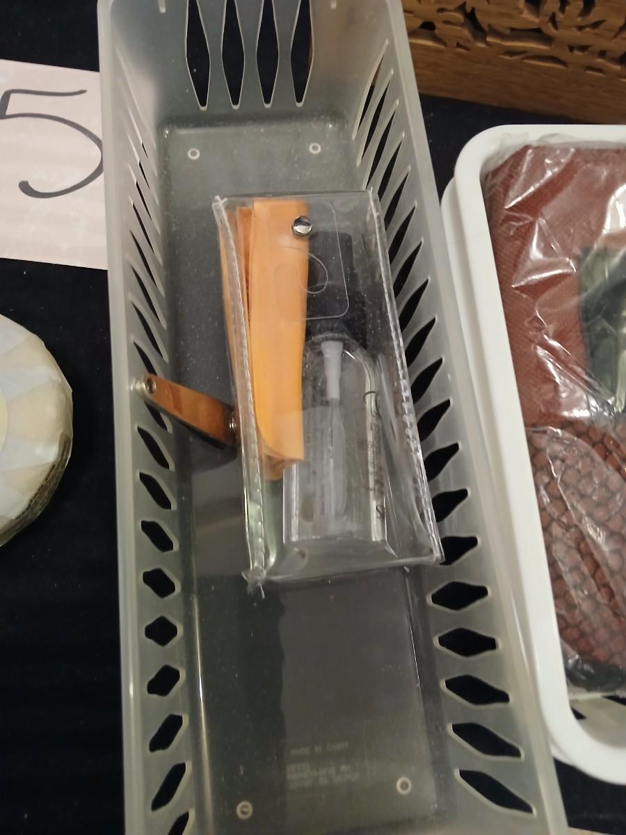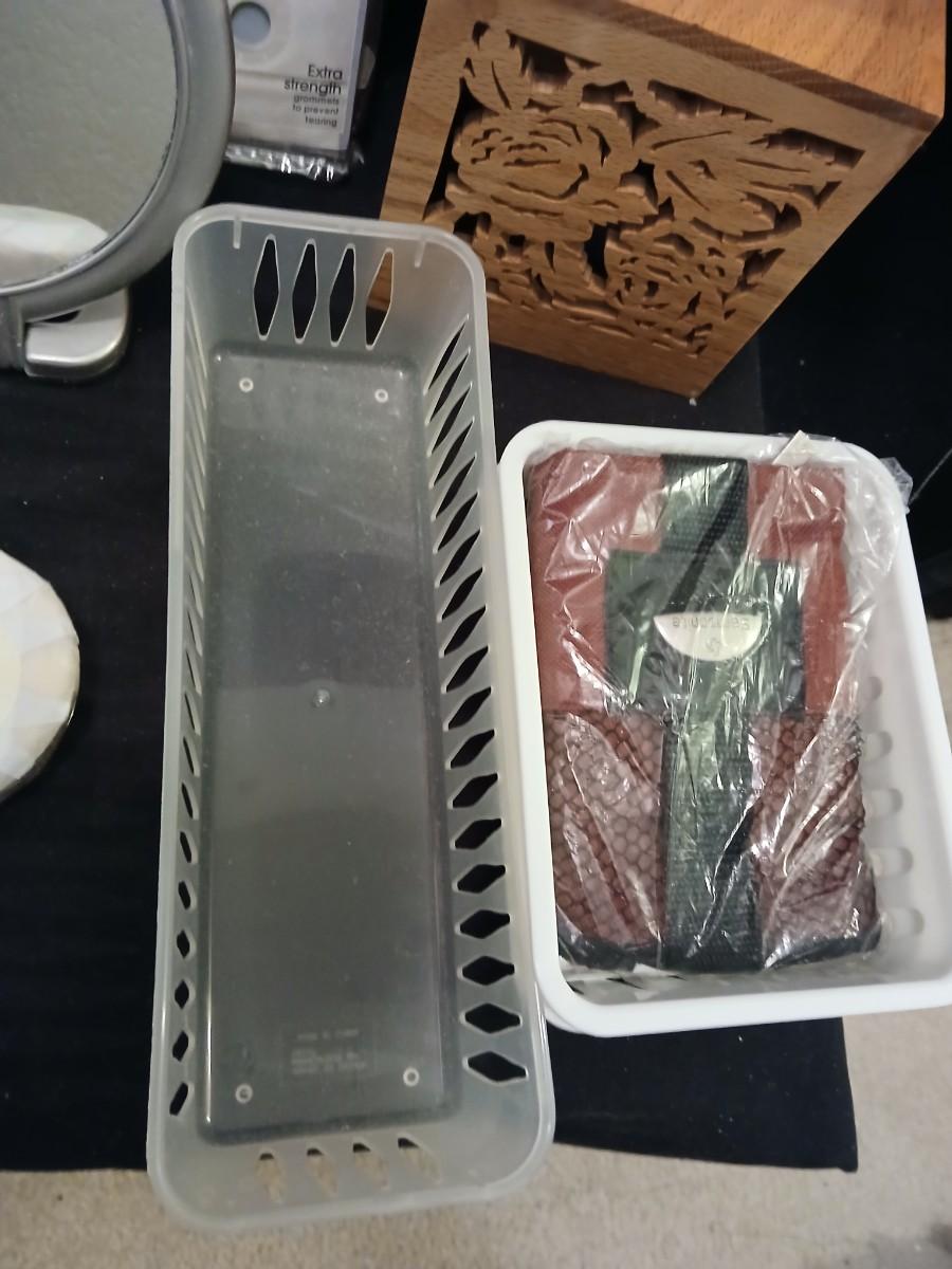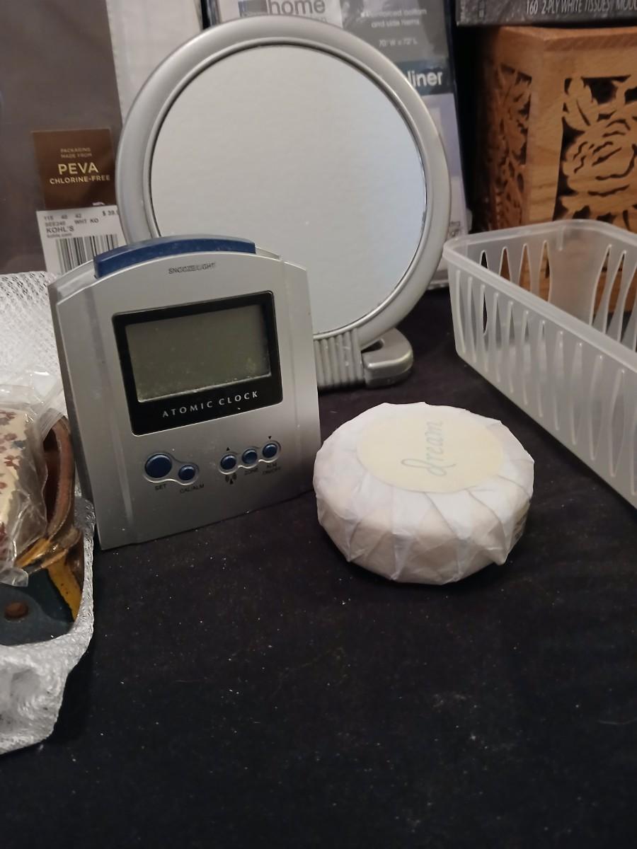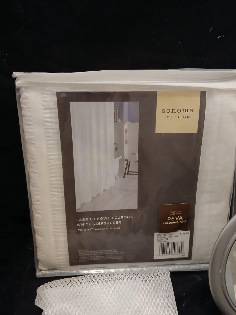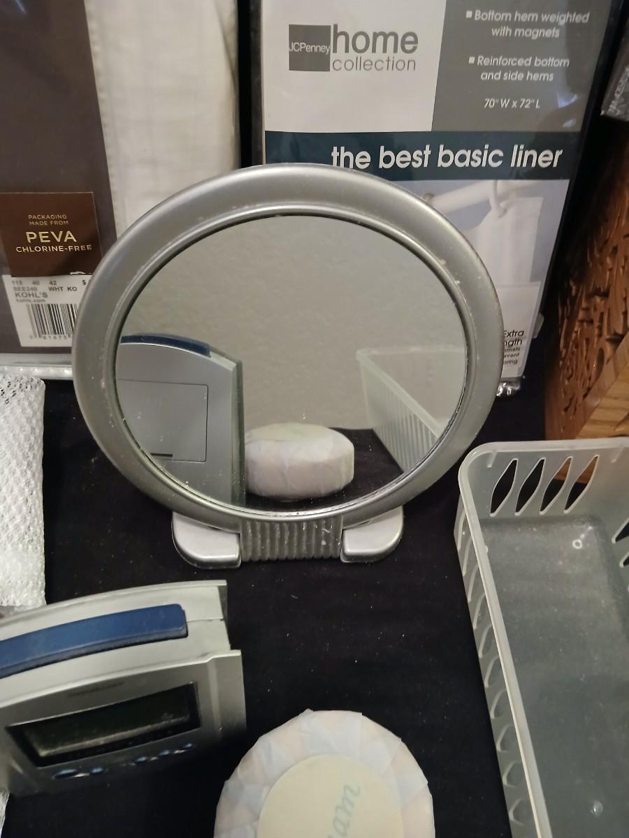 Shower curtain hand mirror, Kleenex wooden laser art Kleenex box and more