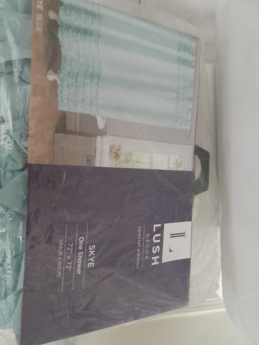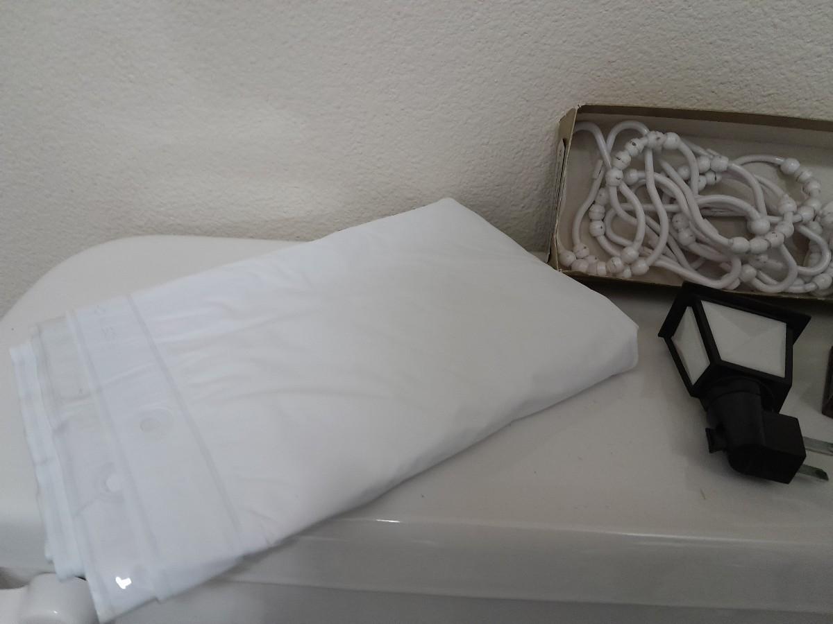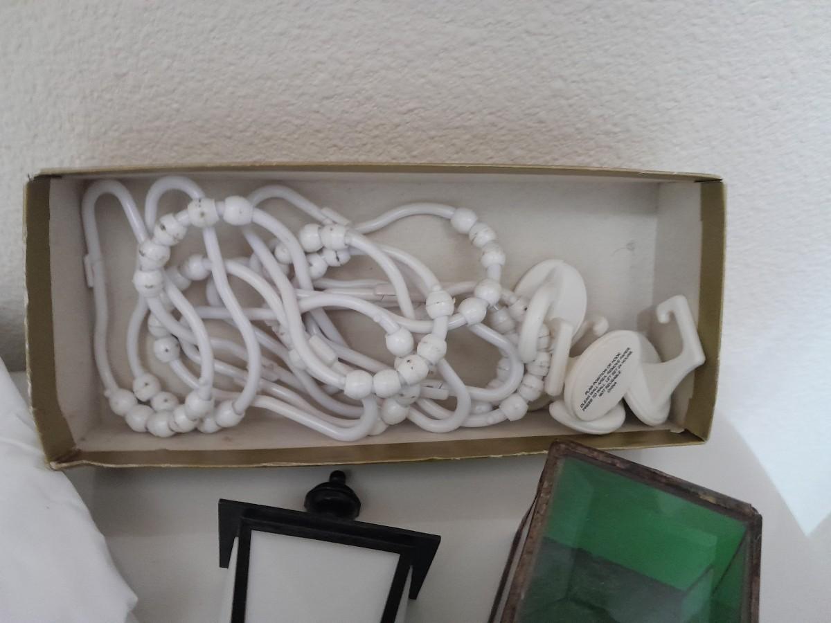 SHOWER CURTAIN, LINER, HOOKS AND OVER THE DOOR TOWEL HOLDER