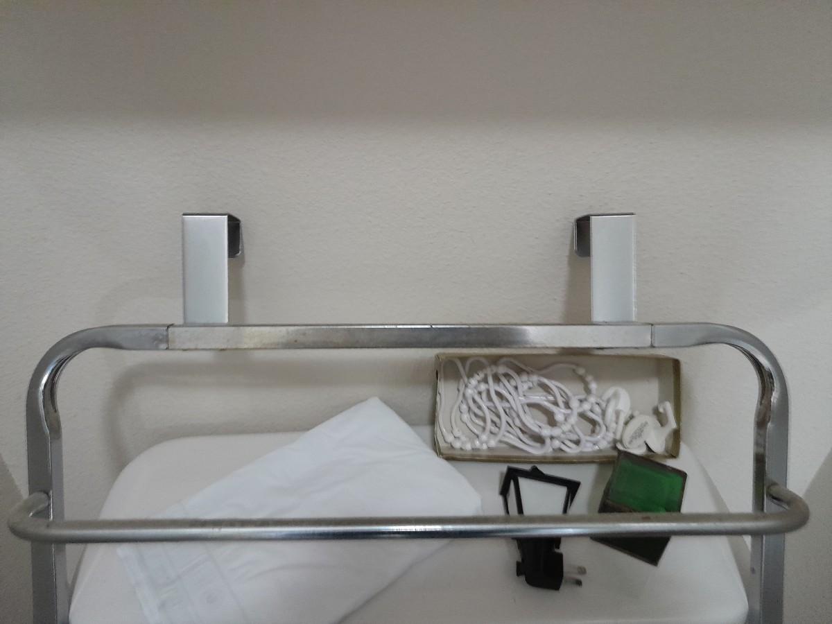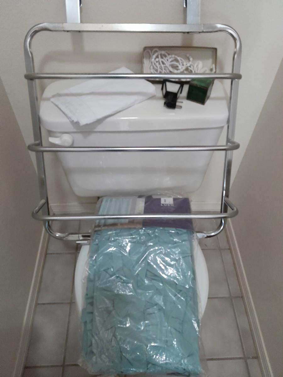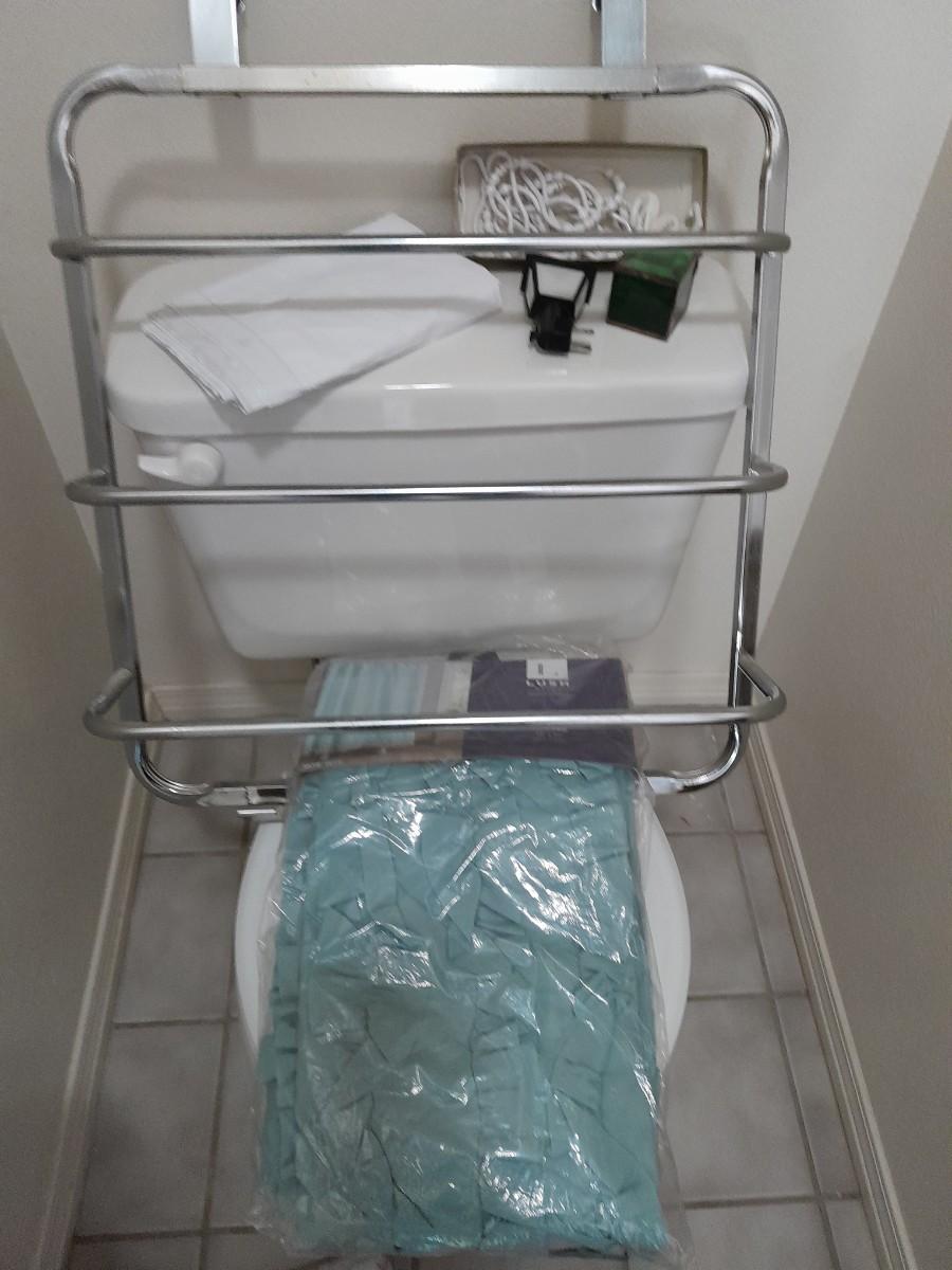 SHOWER CURTAIN, LINER, HOOKS AND OVER THE DOOR TOWEL HOLDER