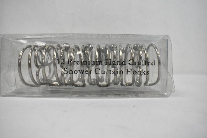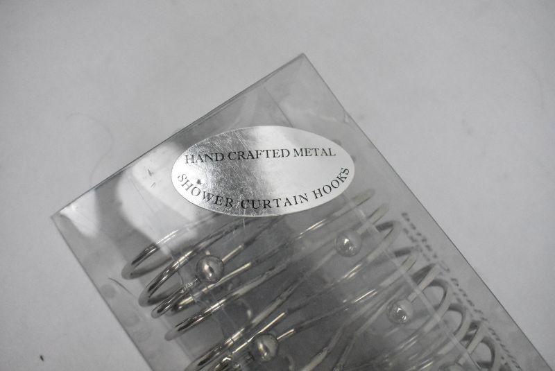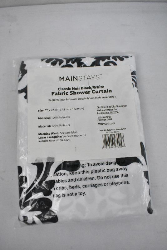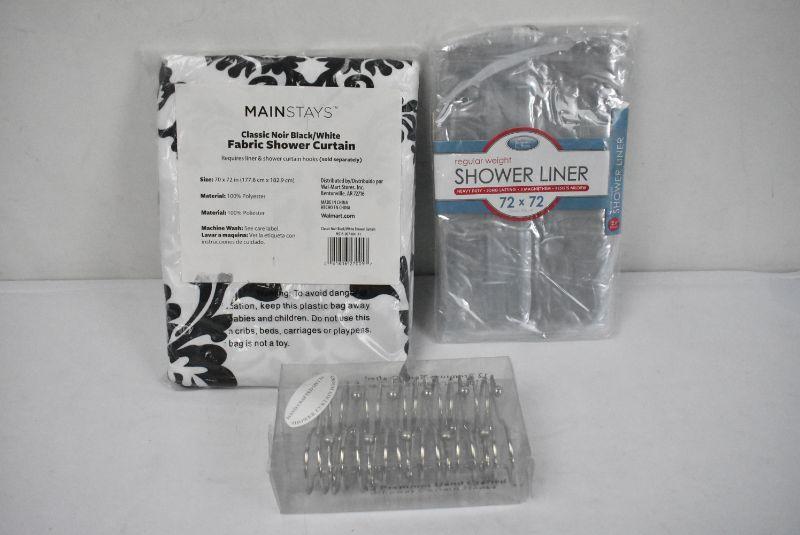 Shower Curtain Lot: Mainstays Classic Noir Black/White Fabric Shower Curtain, Kennedy's Home Collection Regular Weight Shower Liner 72" x 72", and 12 Premium Hand Crafted Shower Curtain Hooks