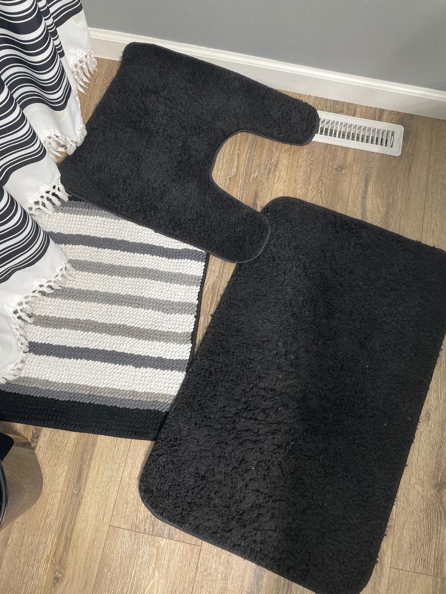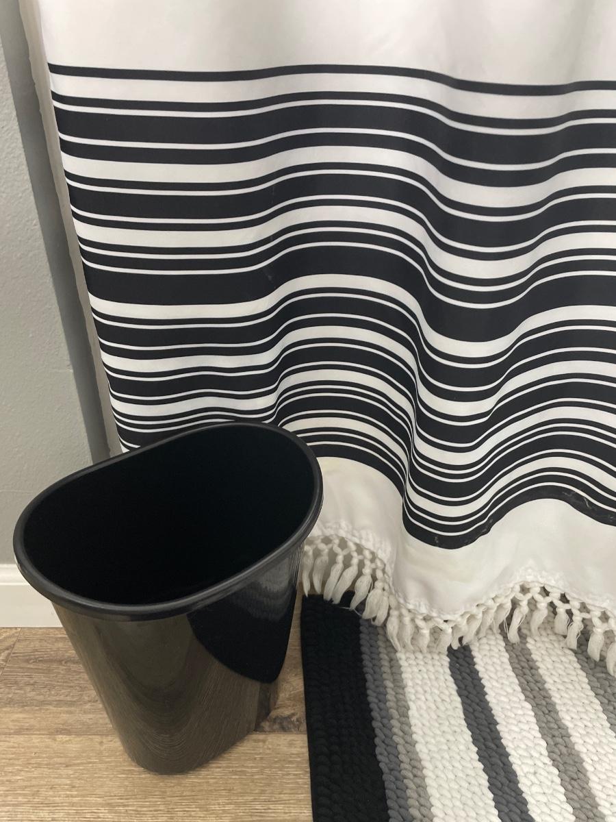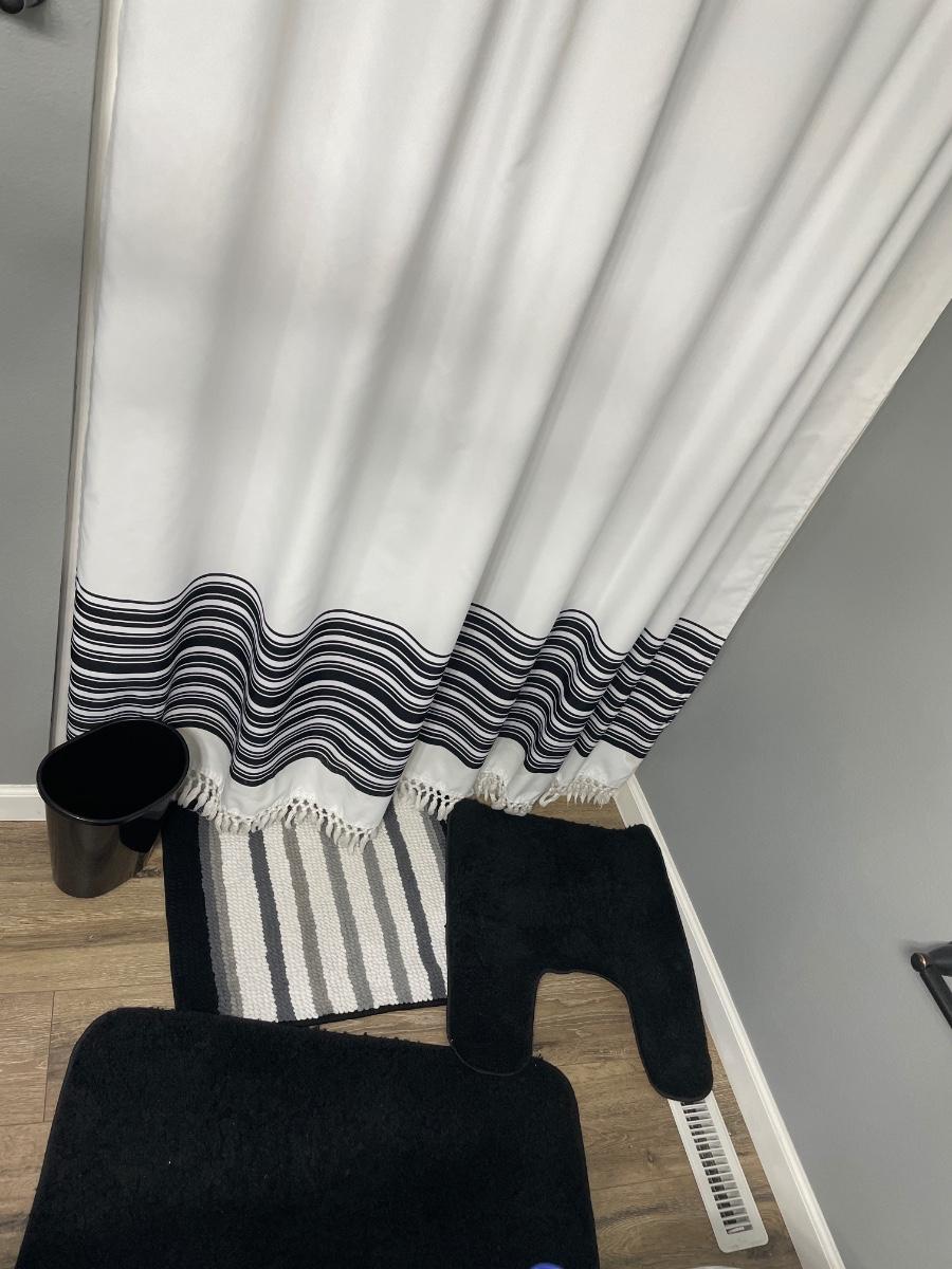 Curtain only, not hooks rod or liner. Plus trashcan and three bath rugs.