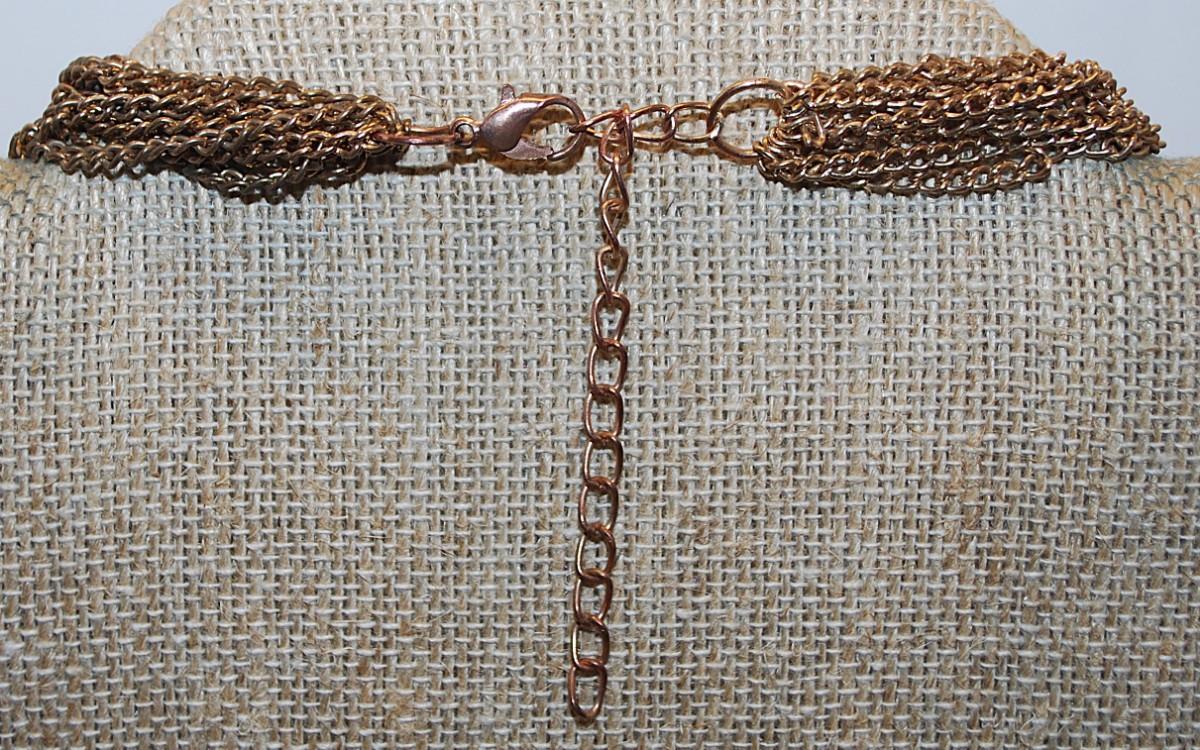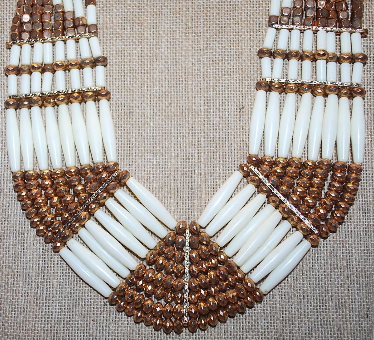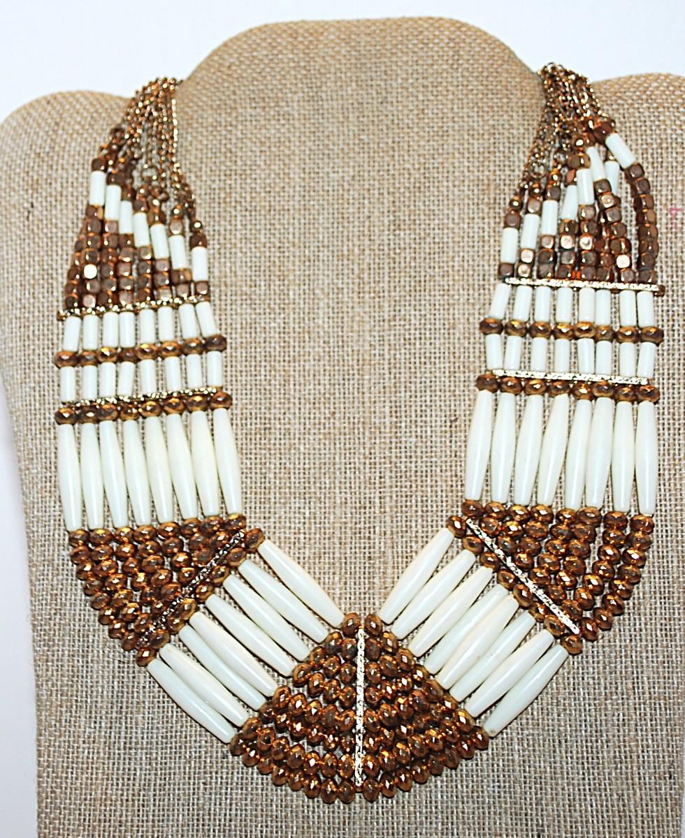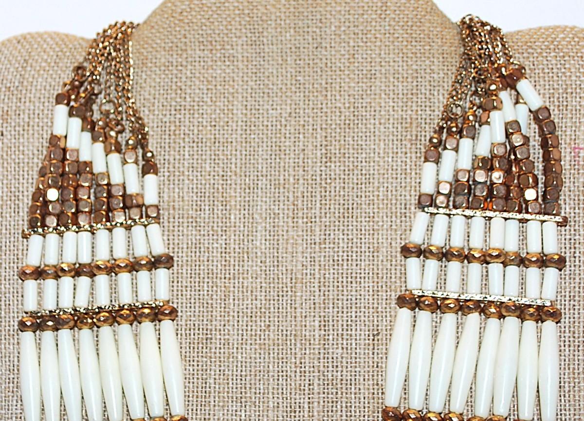 Showy "CLEOPATRA" CHOKER NECKLACE with White Tube-Style & "Rose Gold" Tone Cube + Prism Beads with a Dark Gold Tone Necklace Chain & Lobster Clasp 17" L