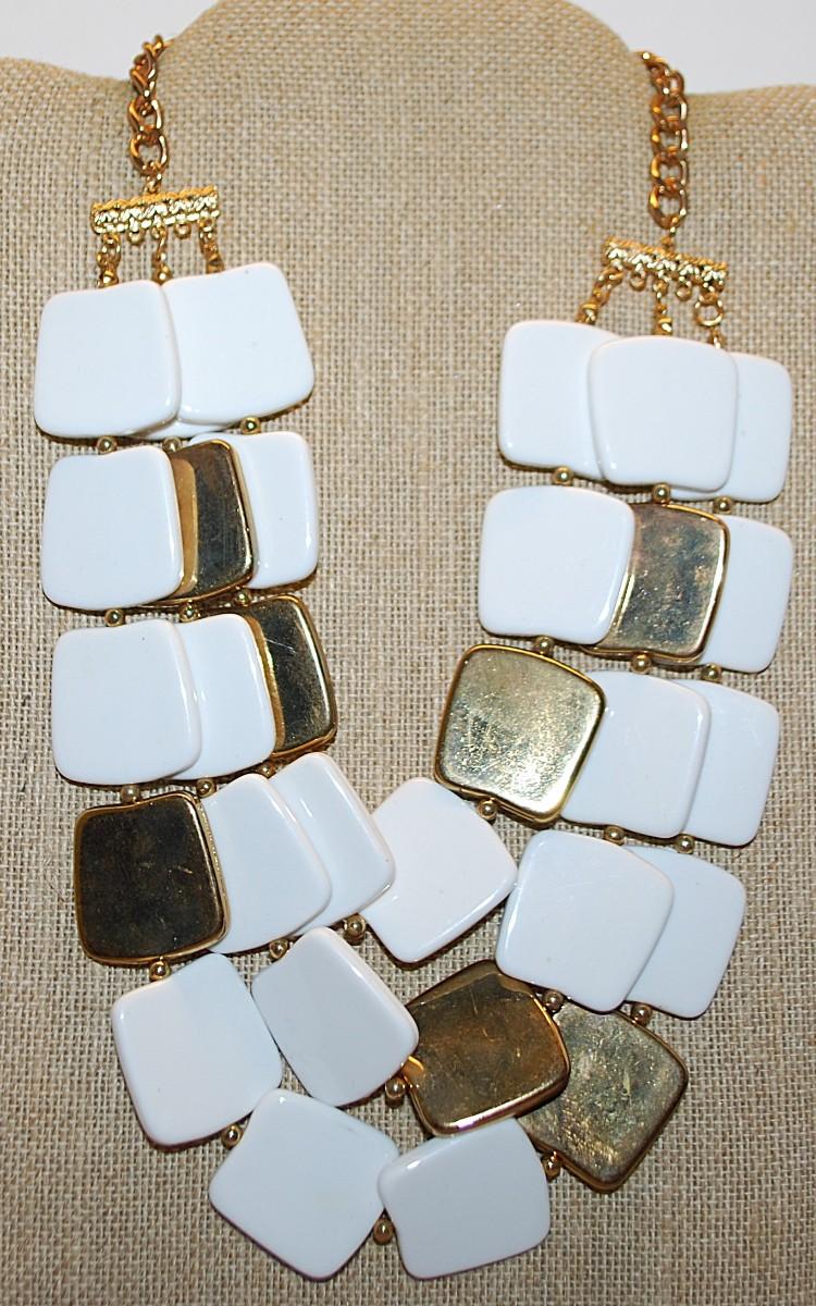 Showy Gold & White Colored TILE NECKLACE with Double Strand Holders on a Gold Tone Chain 18" L