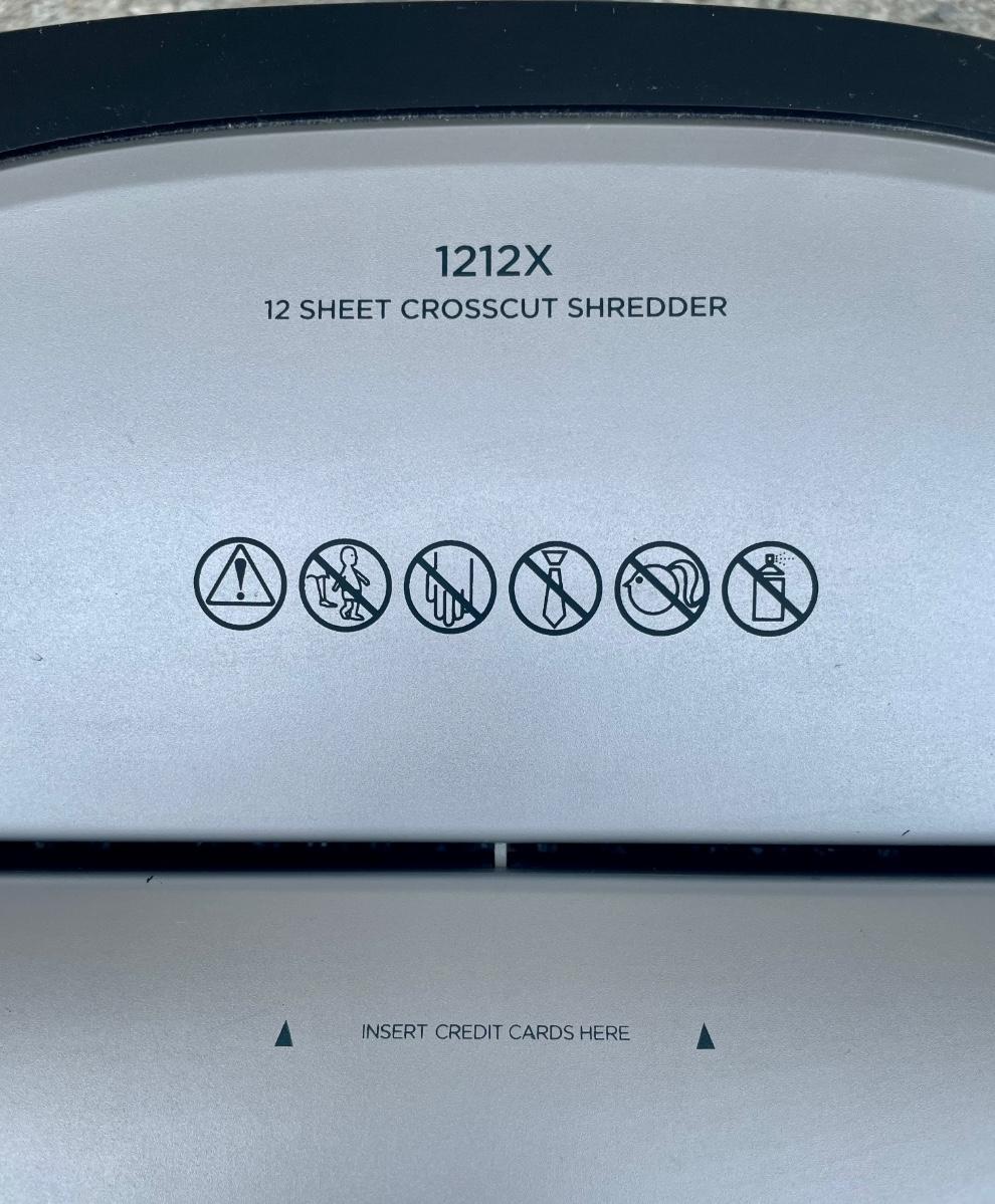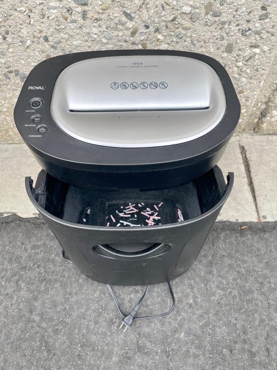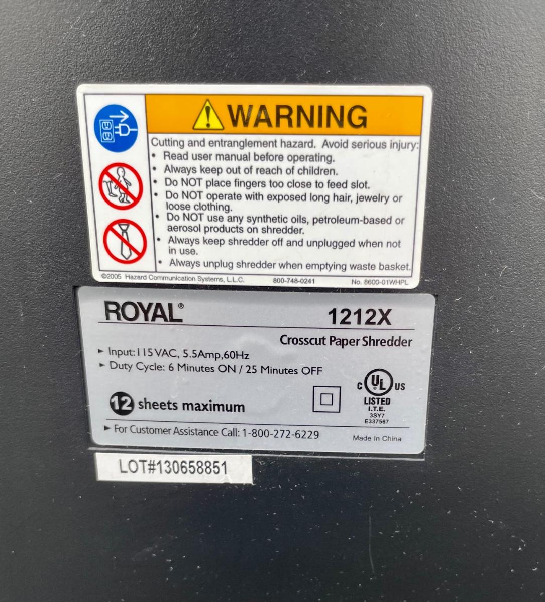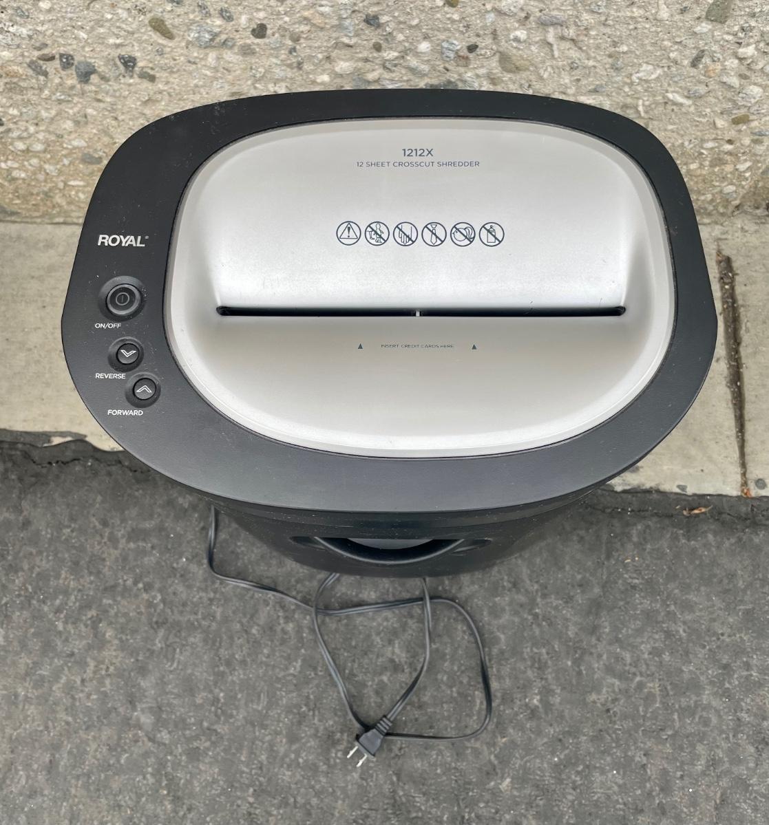 Royal Shredder model 1212X, crosscut shredder can do up to 12 sheets at a time. Can also shred credit cards. Tested, works as expected.