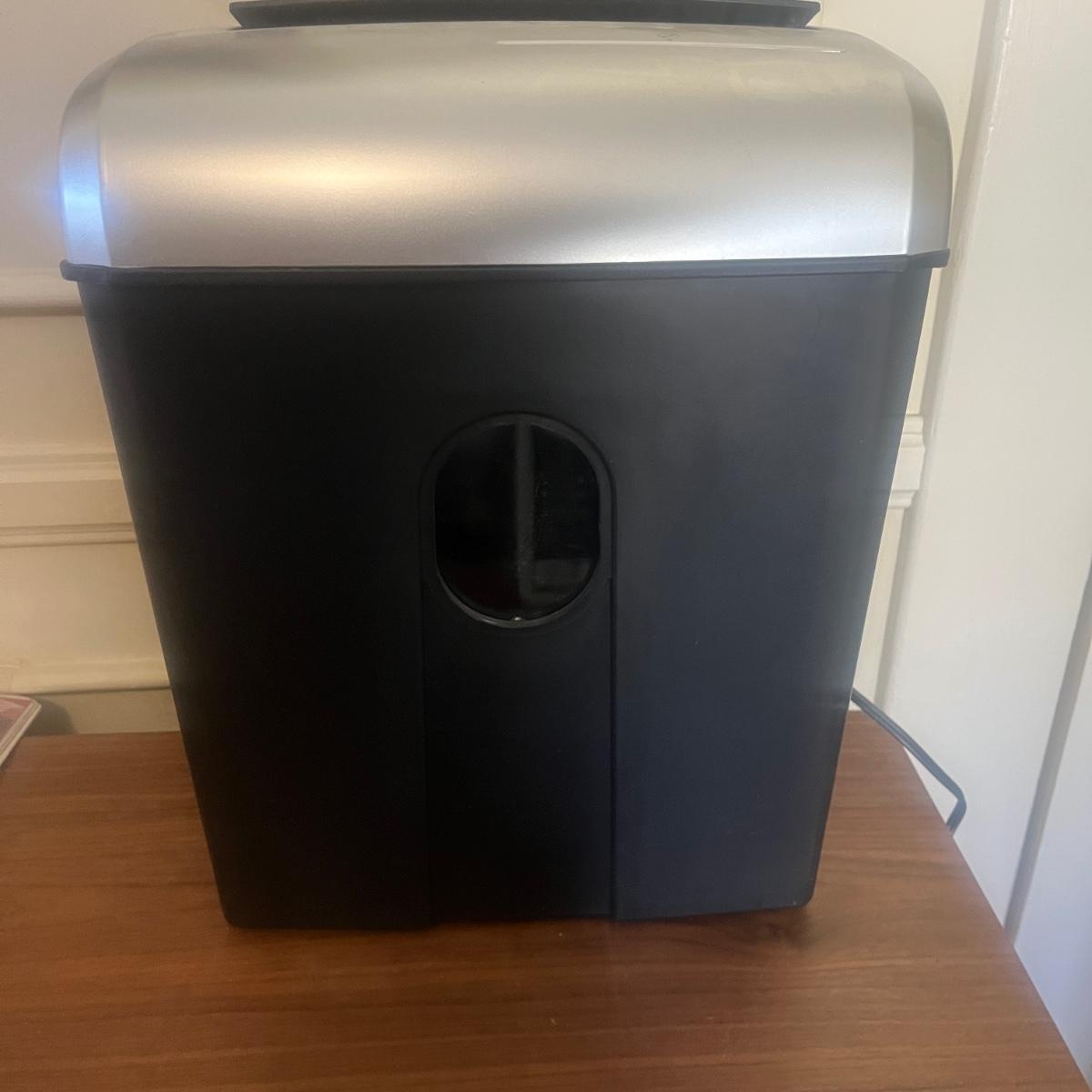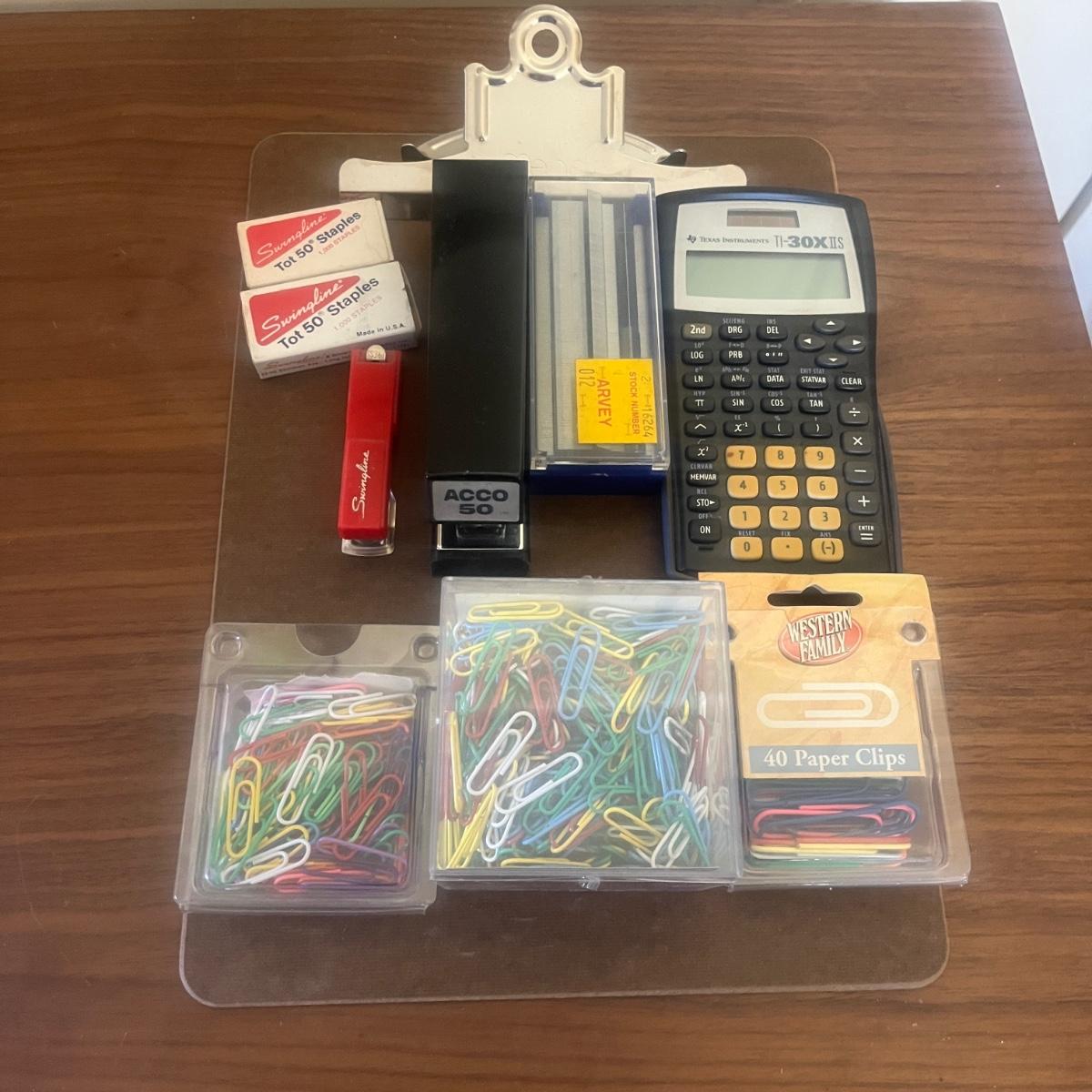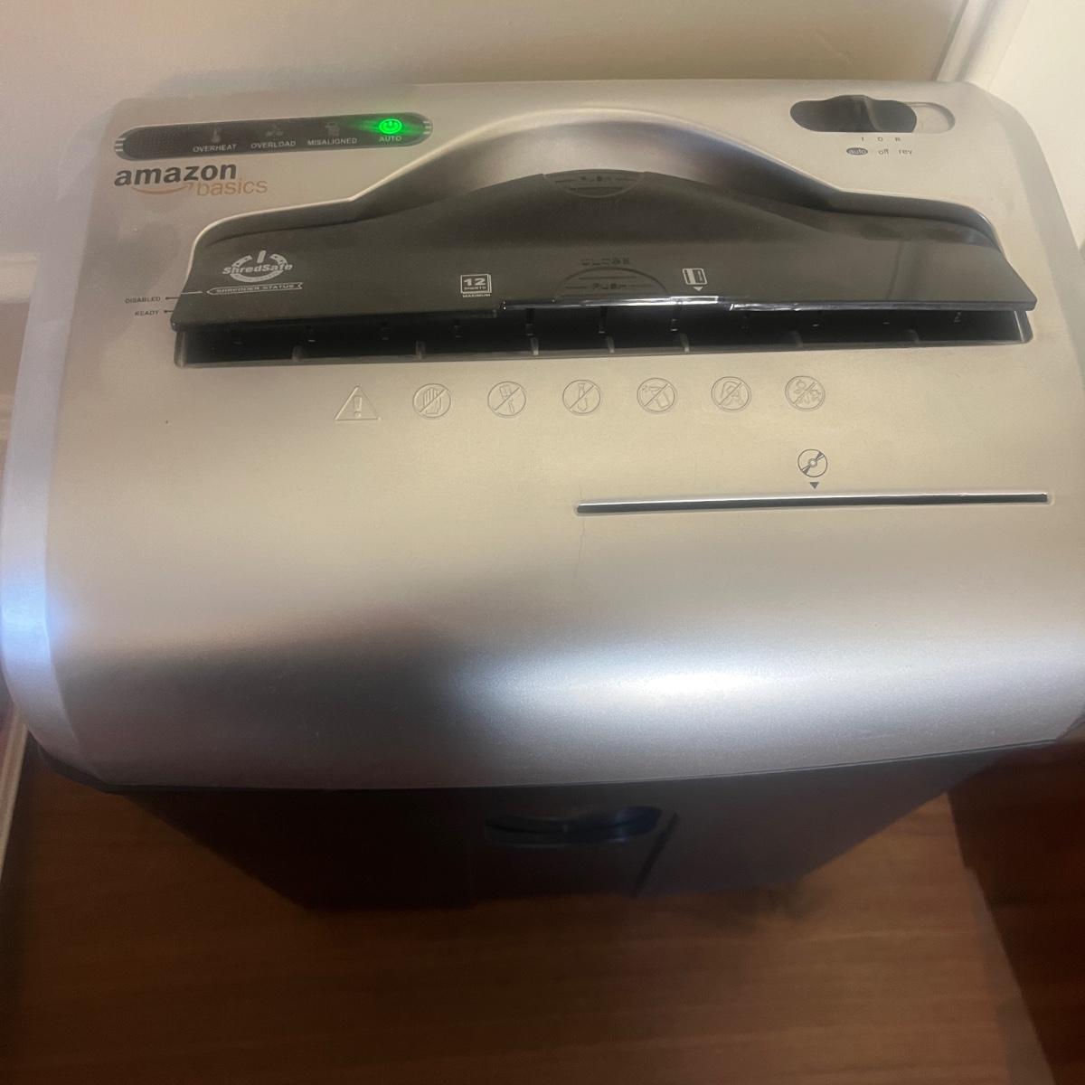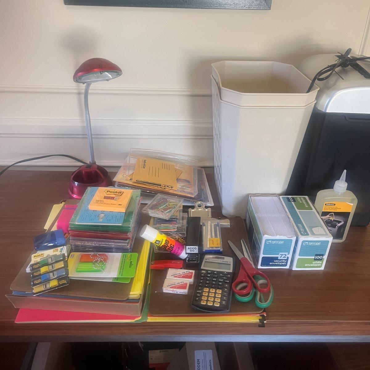Lot includes an Amazon paper shredder, gooseneck light, envelopes, folders, staplers, clipboards, paper clips and more. Shredder measures 12” x 19” x 16”.
