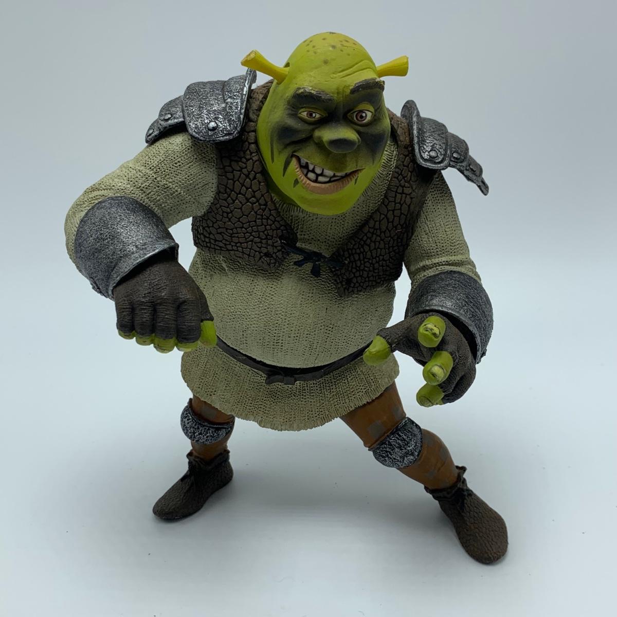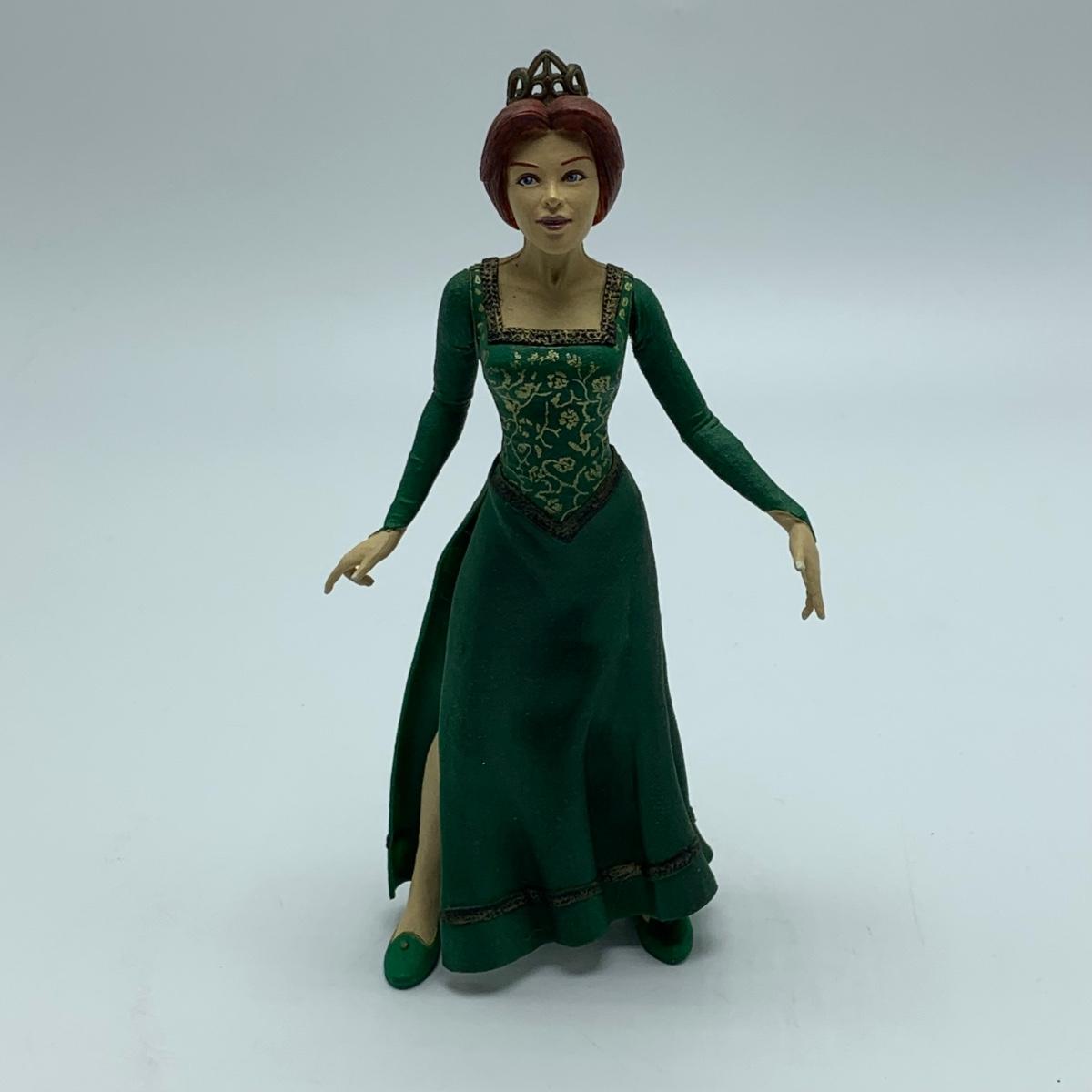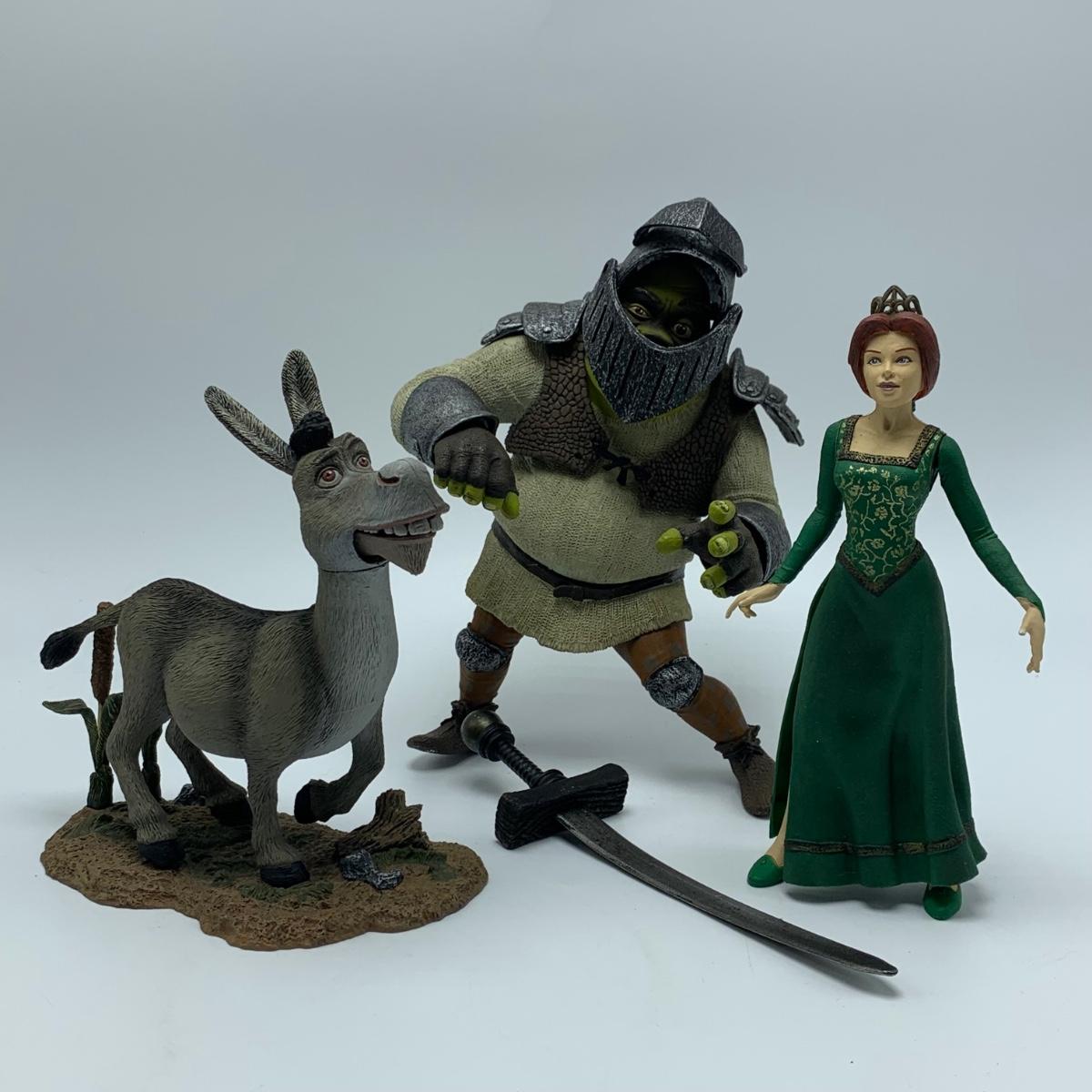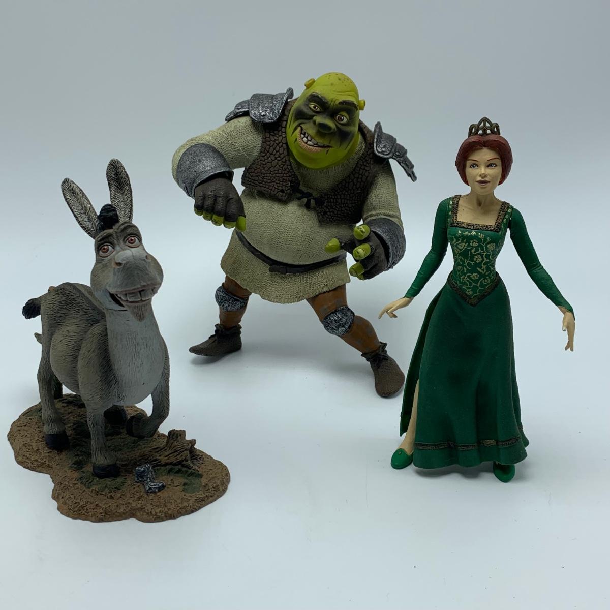 Three plastic figurines from Shrek, including Shrek, Donkey, and Princess Fiona. For reference, Fiona is about 6” tall. Shrek’s helmet doesn’t stay on his head easily. Donkey is attached to a base. It is removable. Each figurine has parts that move.