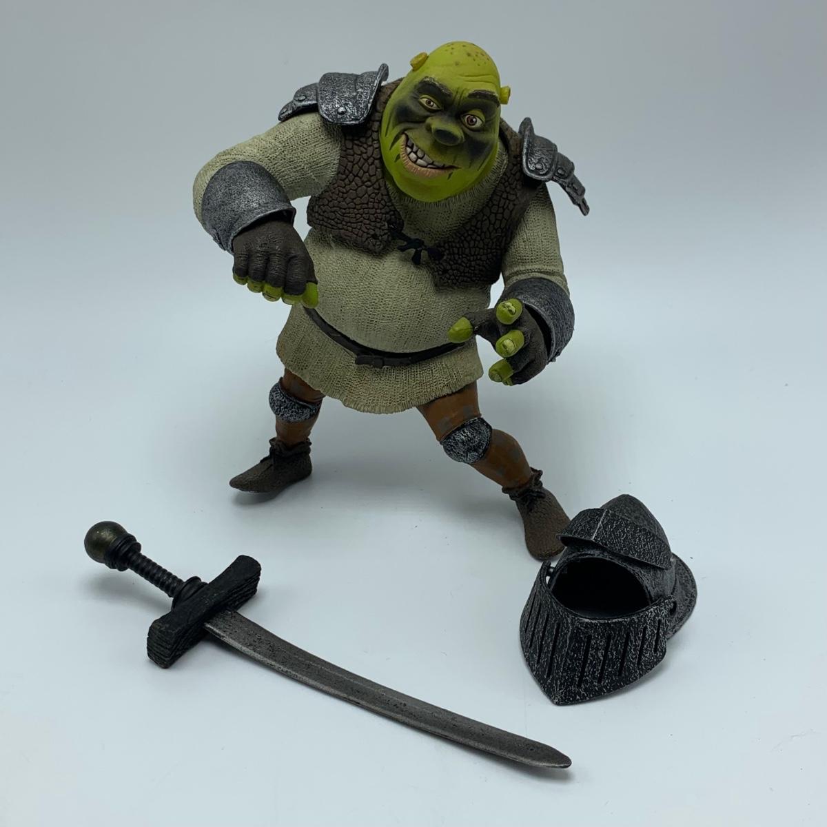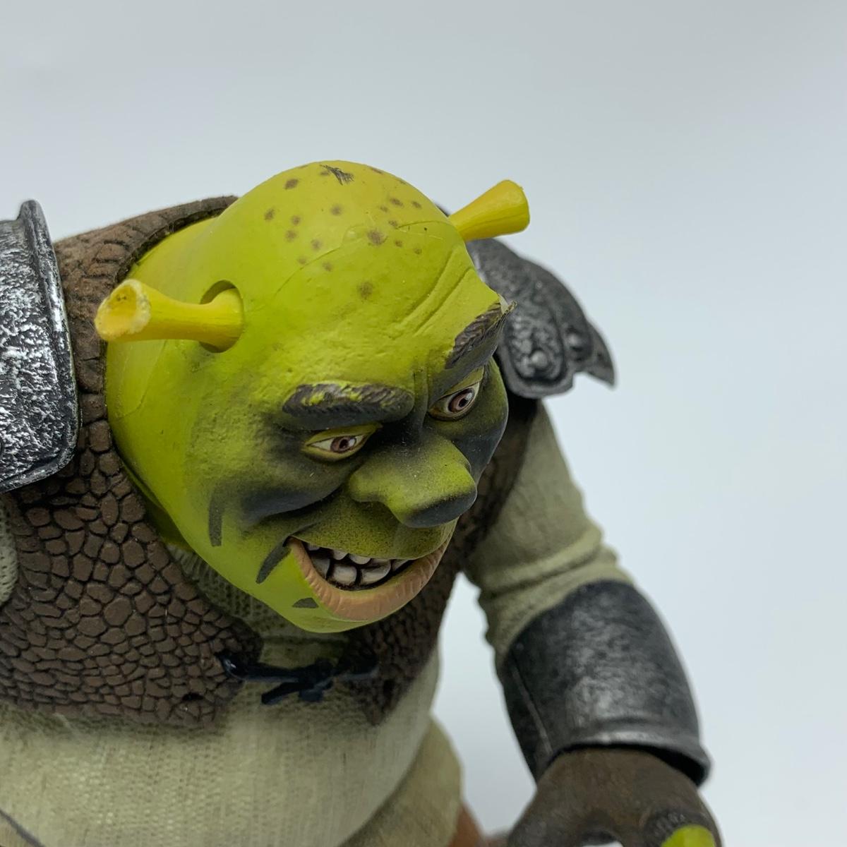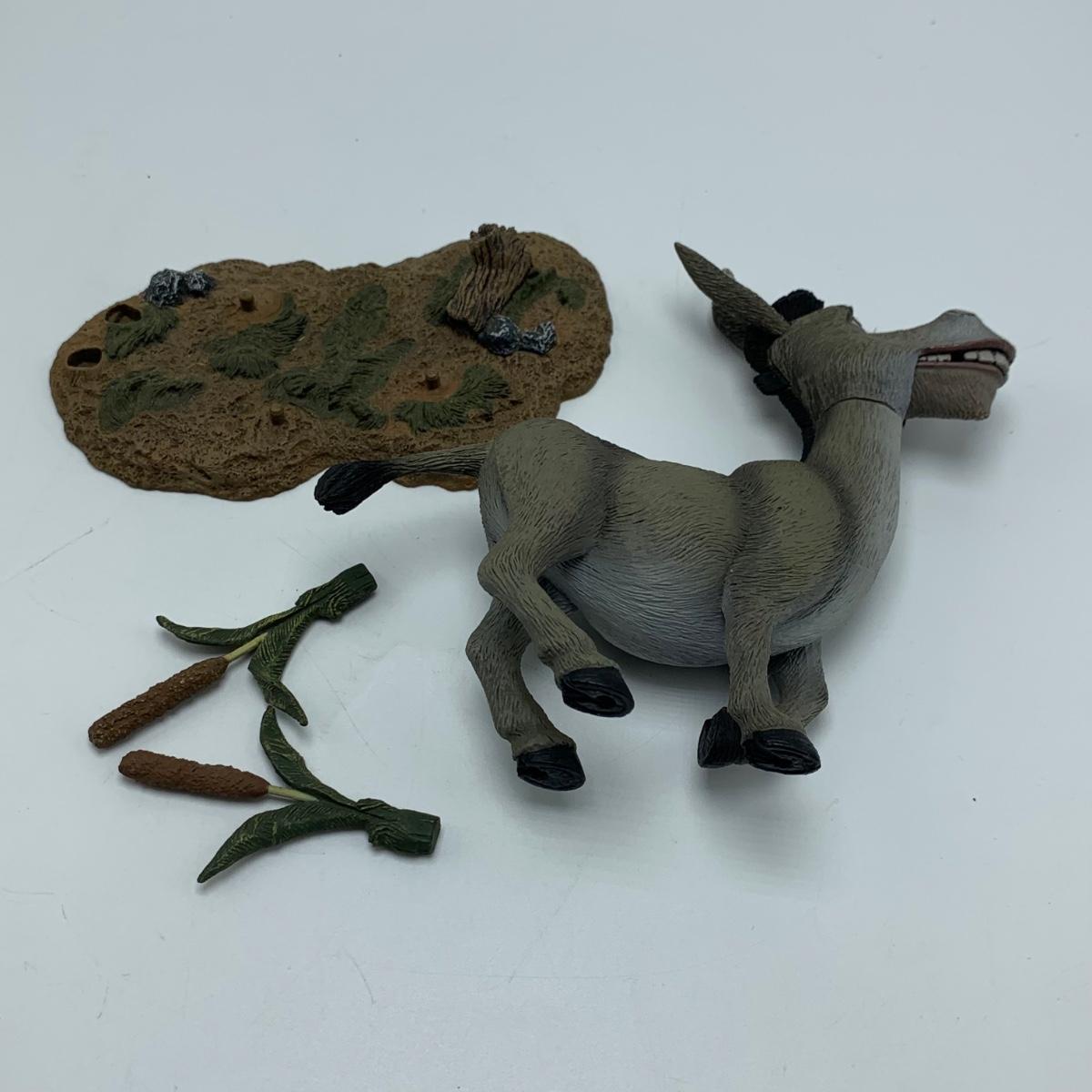 Three plastic figurines from Shrek, including Shrek, Donkey, and Princess Fiona. For reference, Fiona is about 6” tall. Shrek’s helmet doesn’t stay on his head easily. Donkey is attached to a base. It is removable. Each figurine has parts that move.