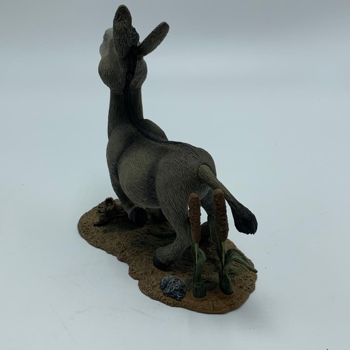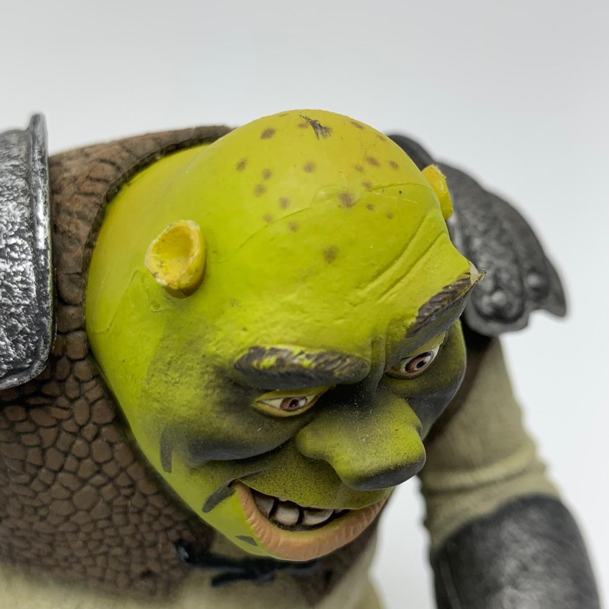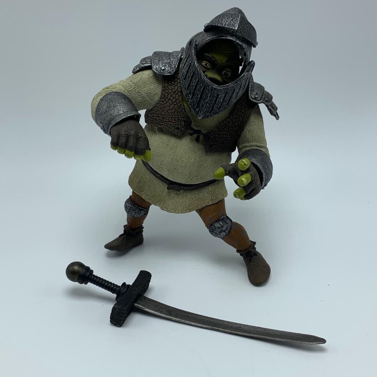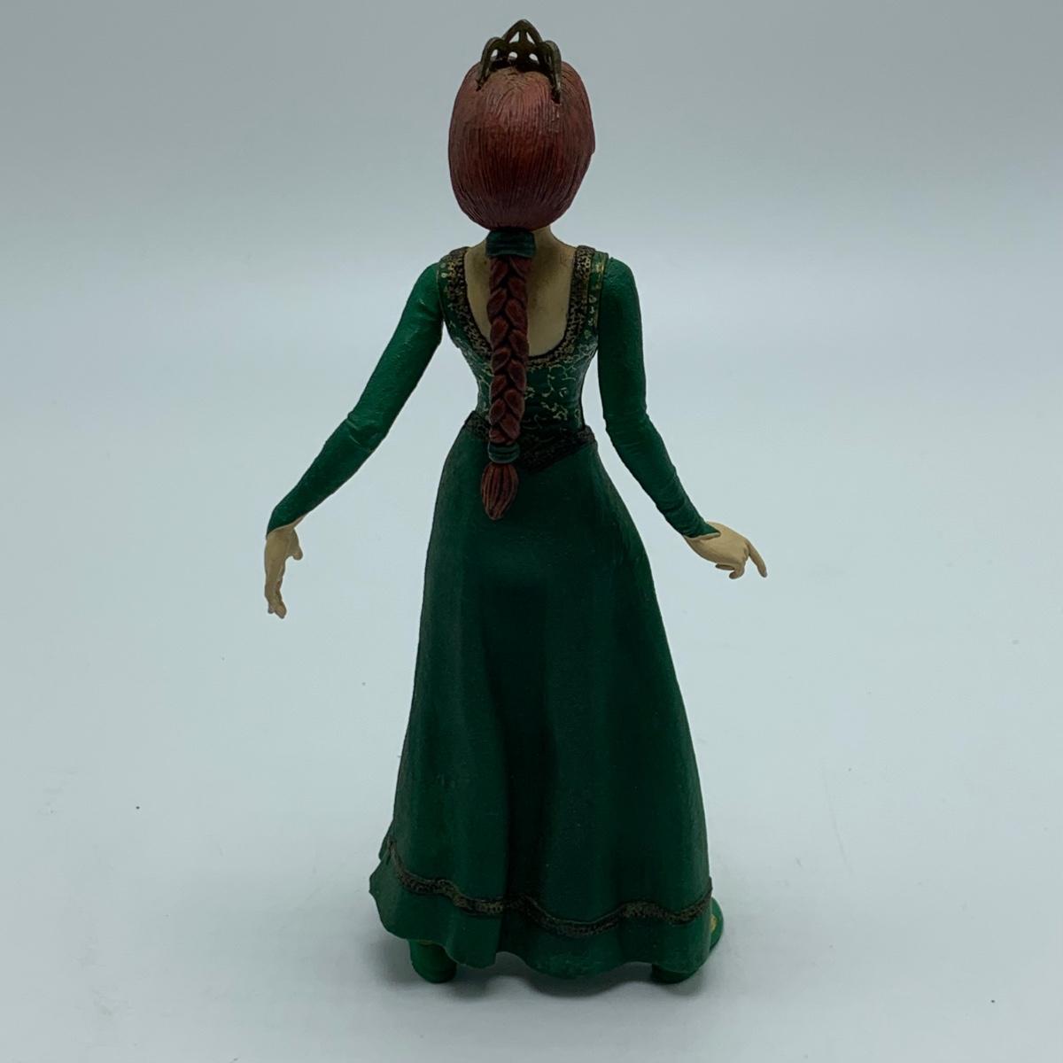 Three plastic figurines from Shrek, including Shrek, Donkey, and Princess Fiona. For reference, Fiona is about 6” tall. Shrek’s helmet doesn’t stay on his head easily. Donkey is attached to a base. It is removable. Each figurine has parts that move.
