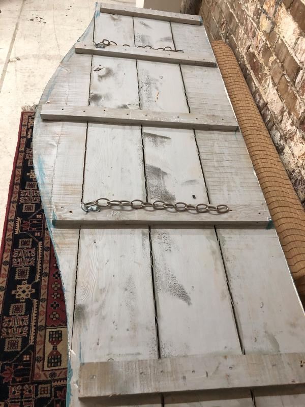 Reproduction antique shrimp boat sign 66" by 27". Wood construction.