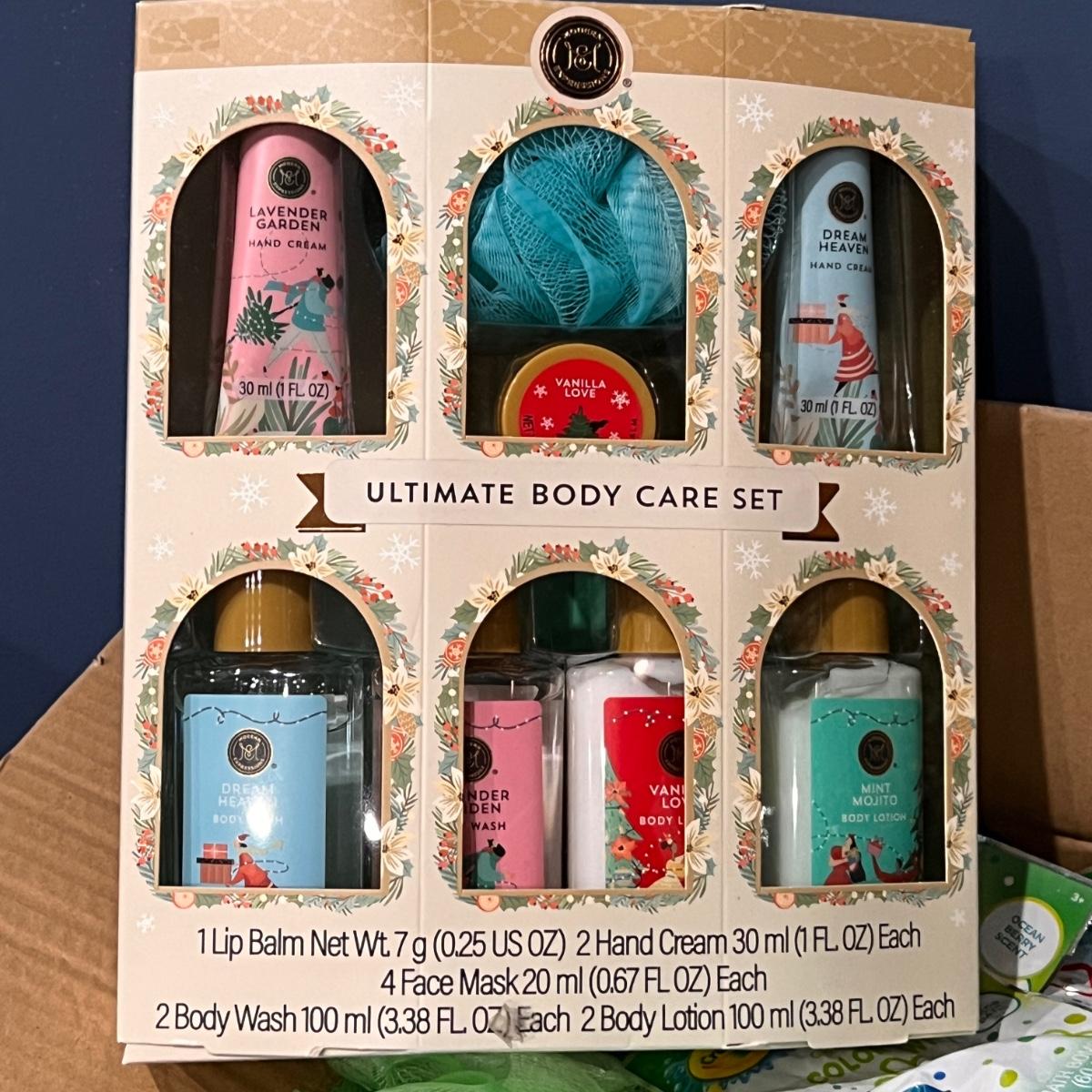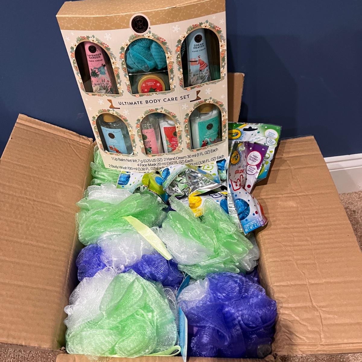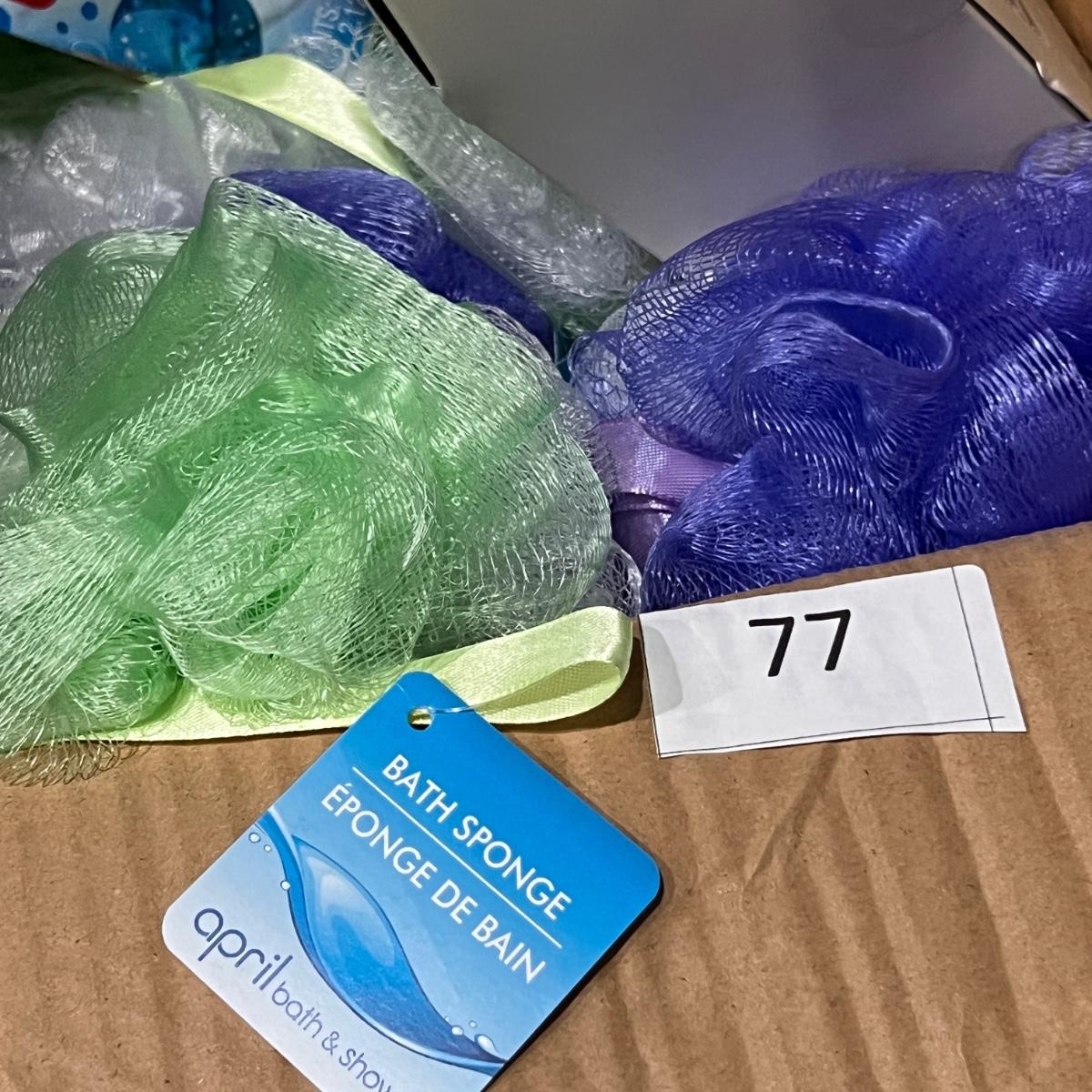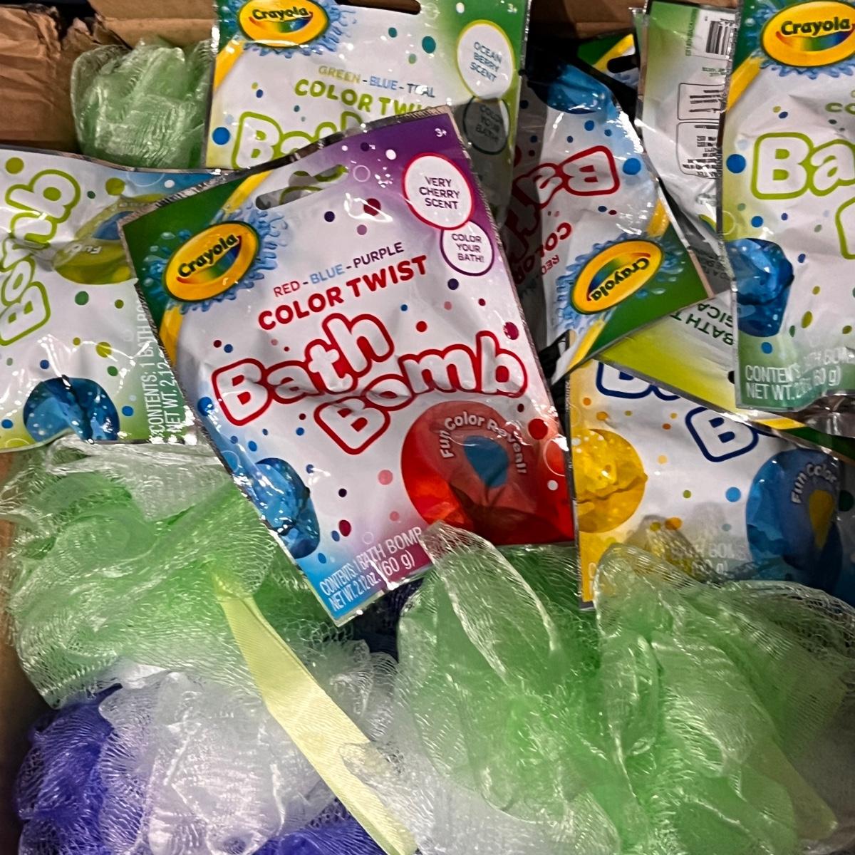 Opened box of bath shower sponge loofahs. Box says it has 36 but it looked like maybe 1 or 2 were missing. Lot of crayola colored bath bombs. Modern Expressions Ultimate Body Care Set Gift Set.