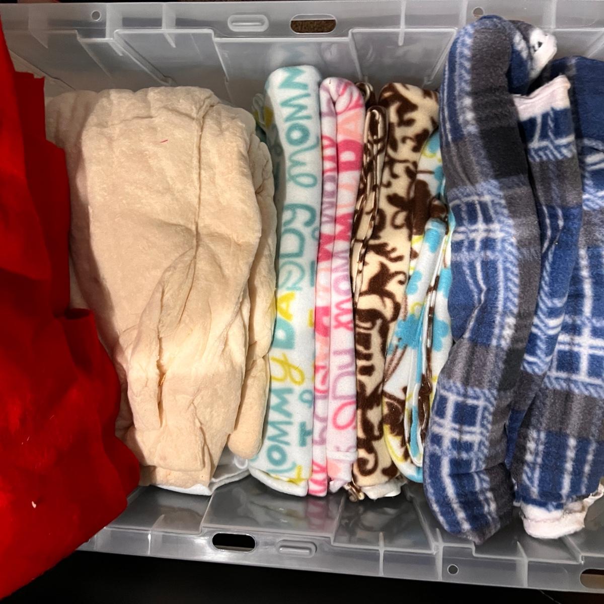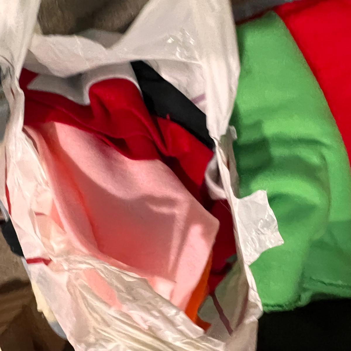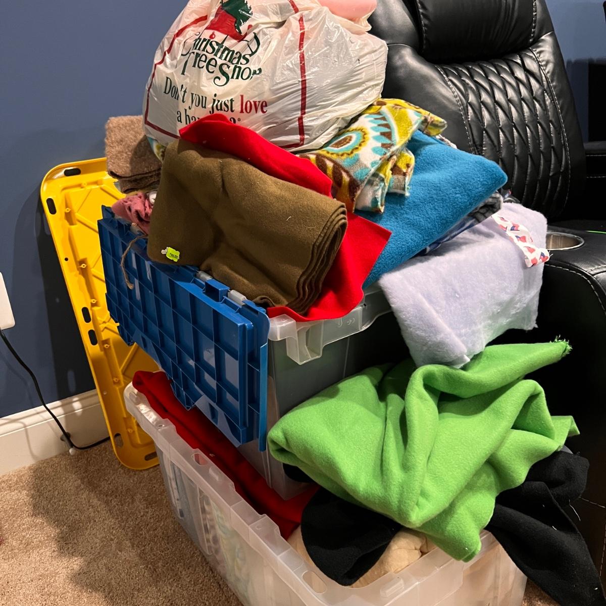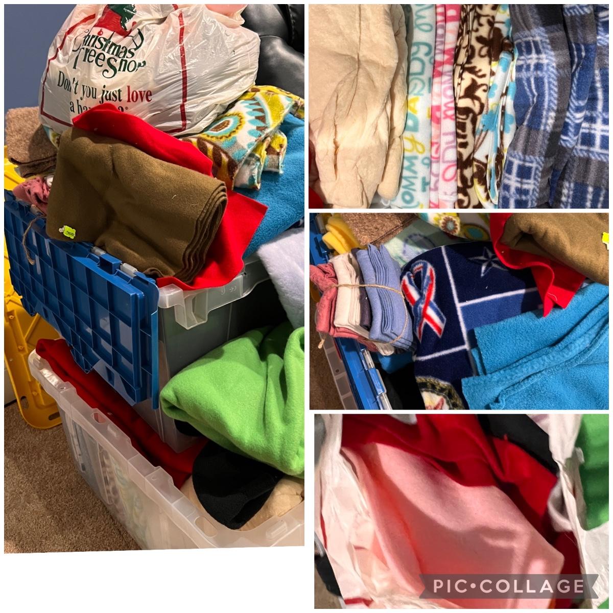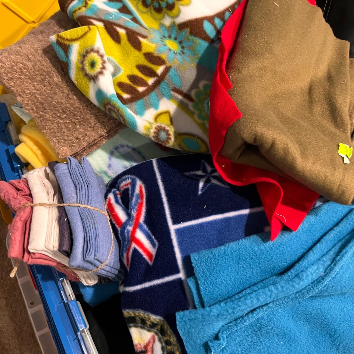 2 large storage containers and 1 bag filled with felt and fleece pieces, various sizes and prints, solids.