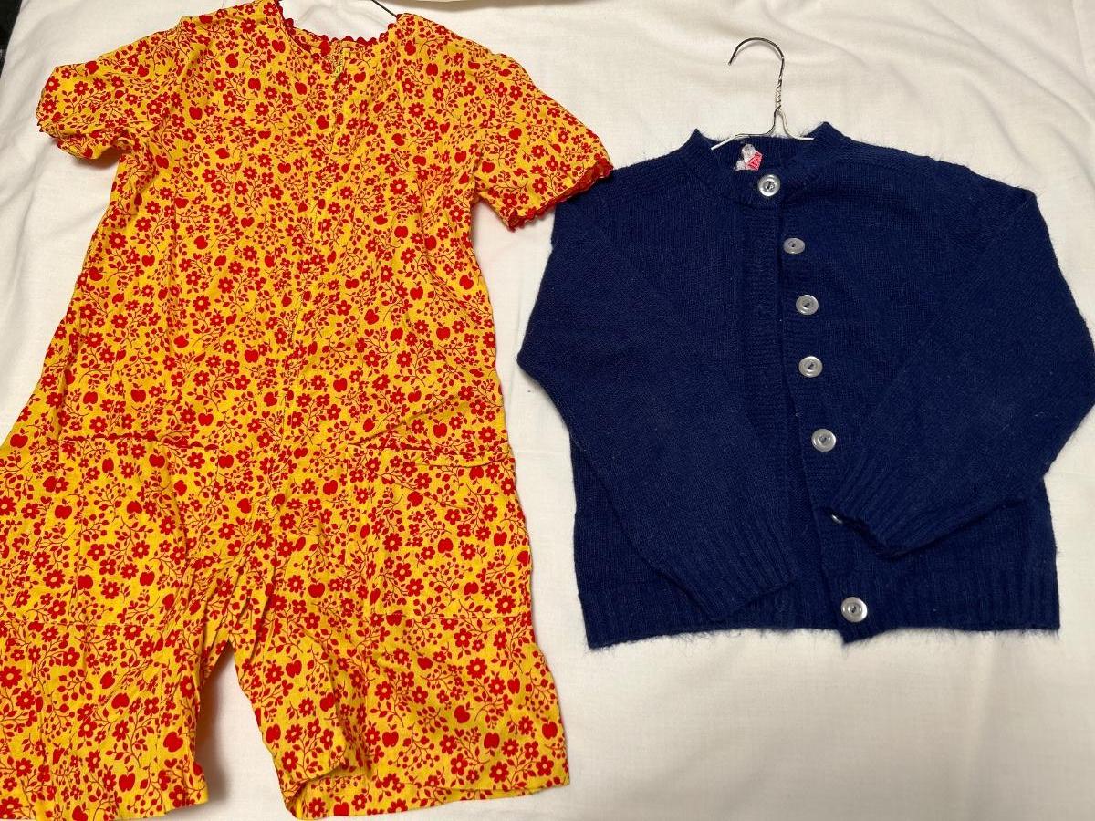 Yellow jumper with front zipper and pockets and navy blue sweater. Don’t know sizes.