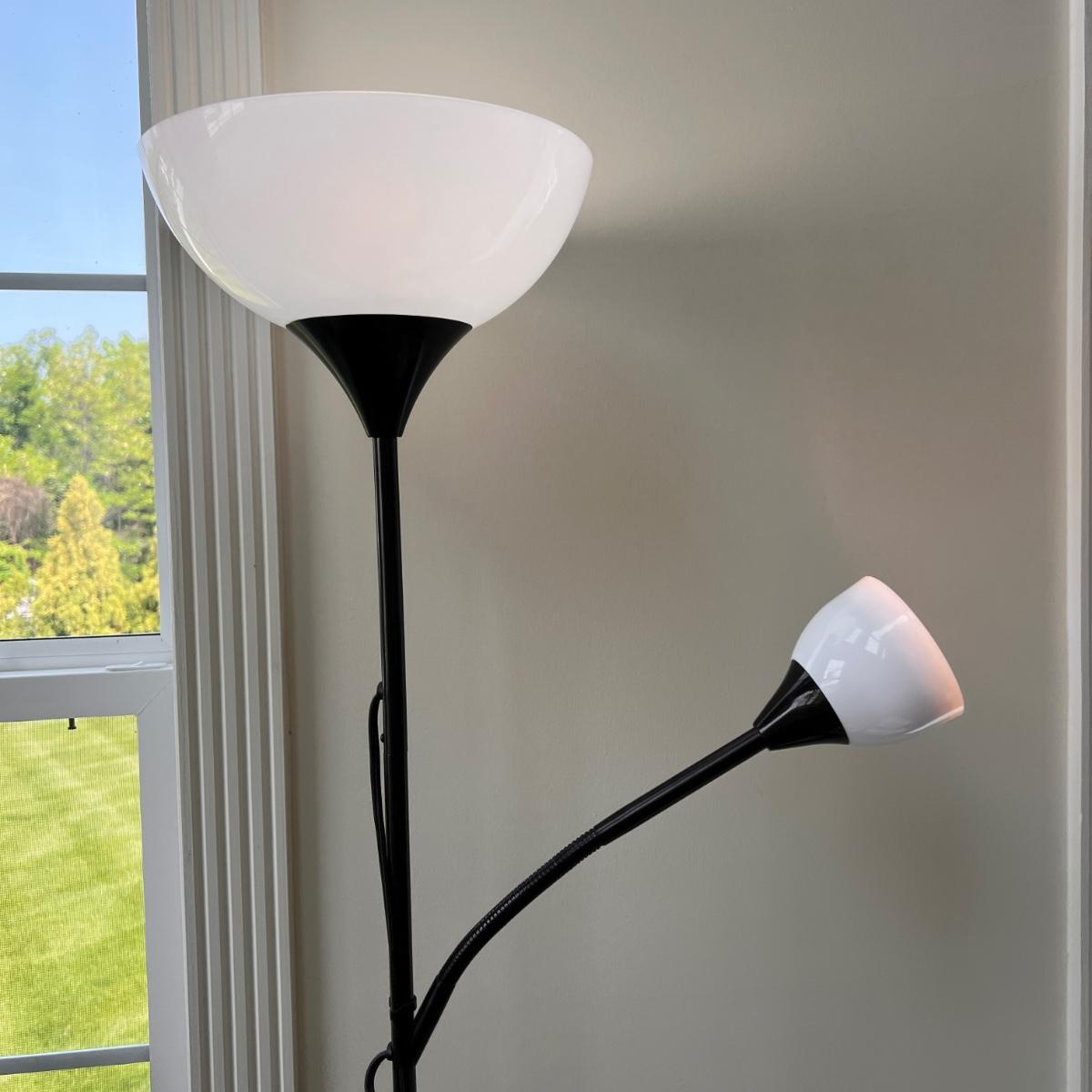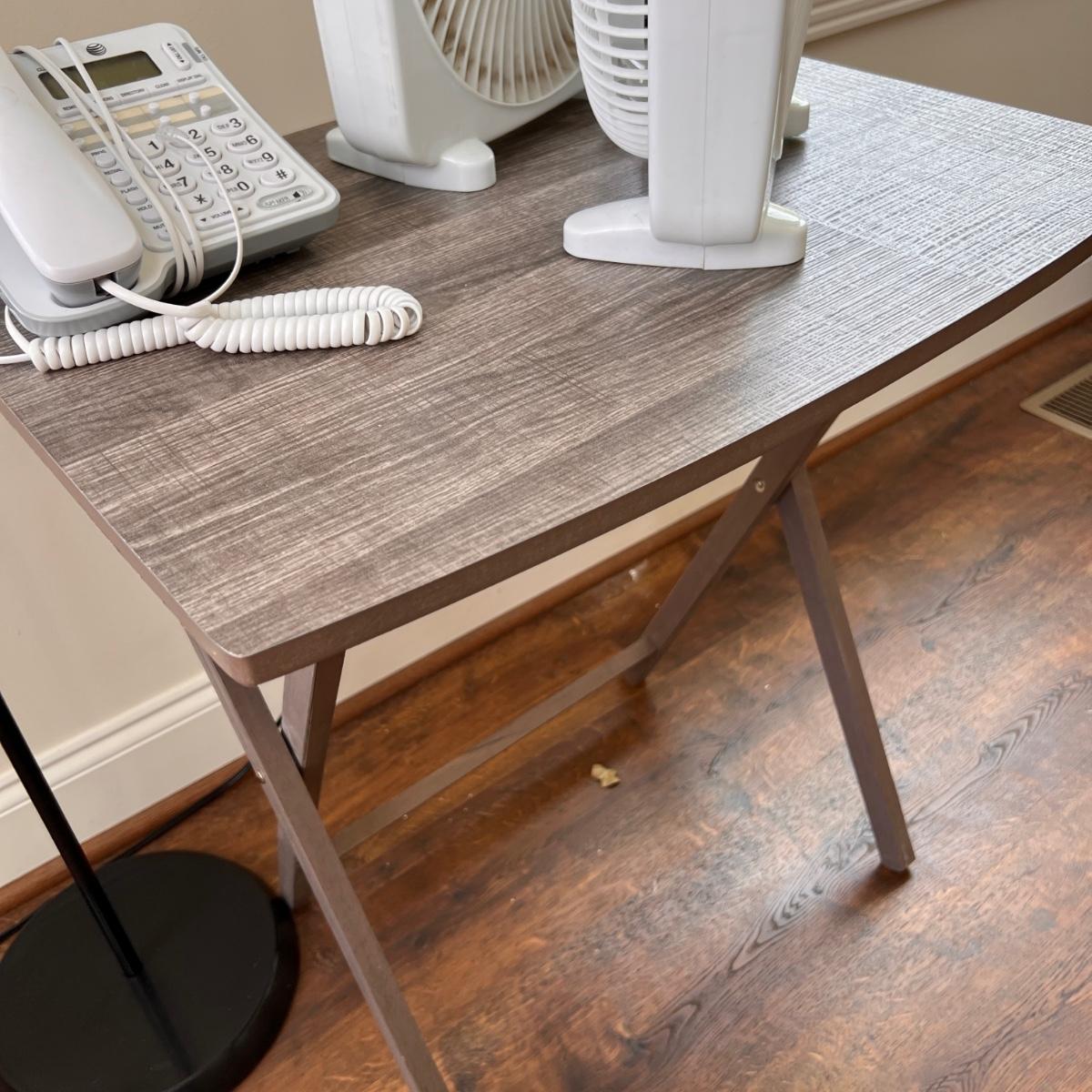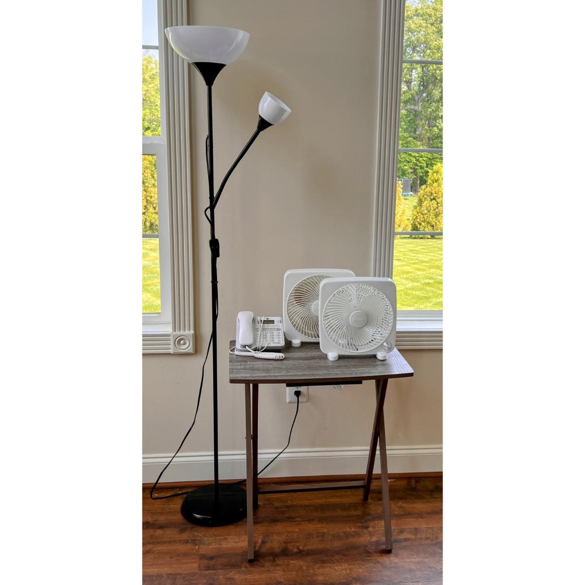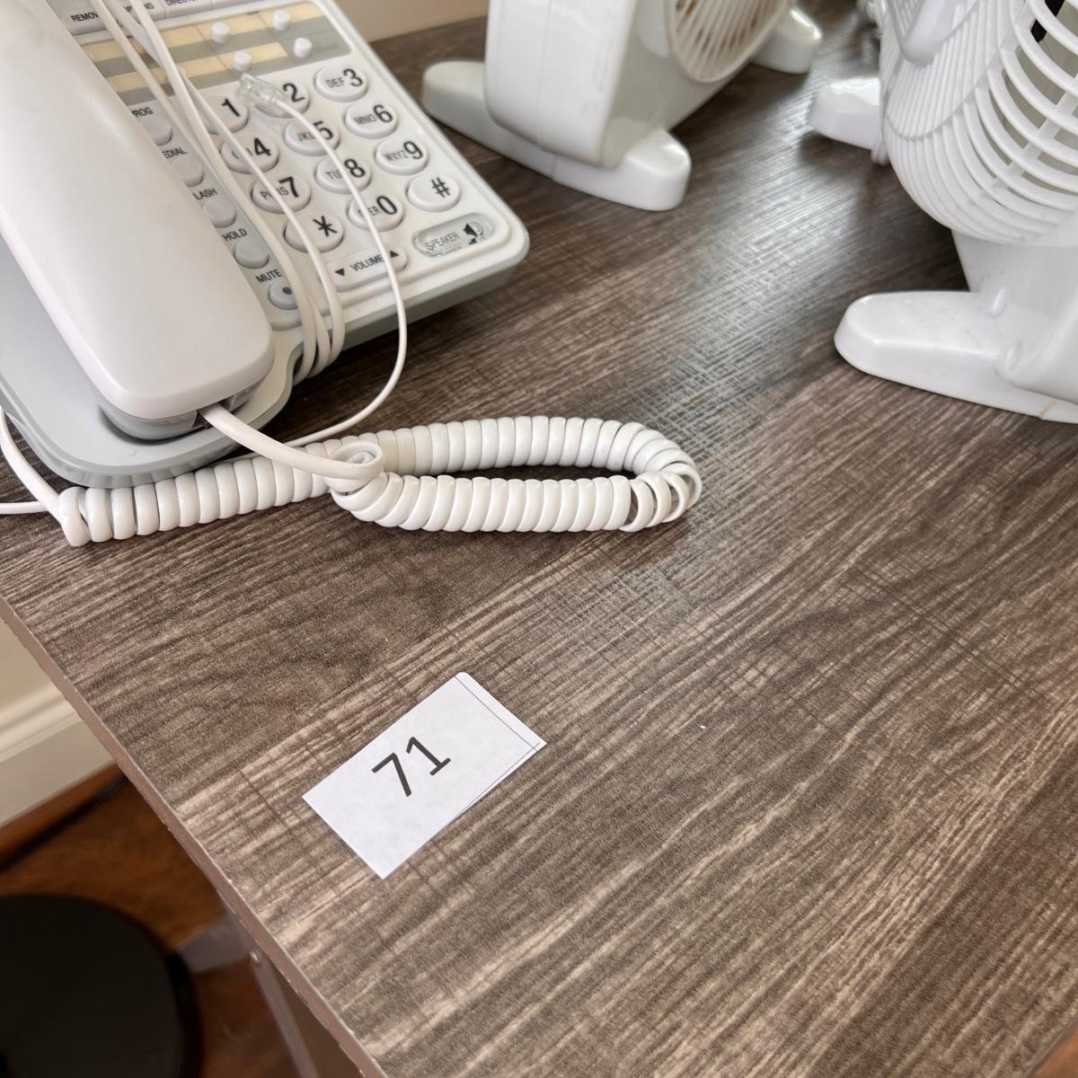 Lamp has 1 bendable small light, 2 massey desk fans, 1 AT&T landline phone, one grey faux wood folding table.