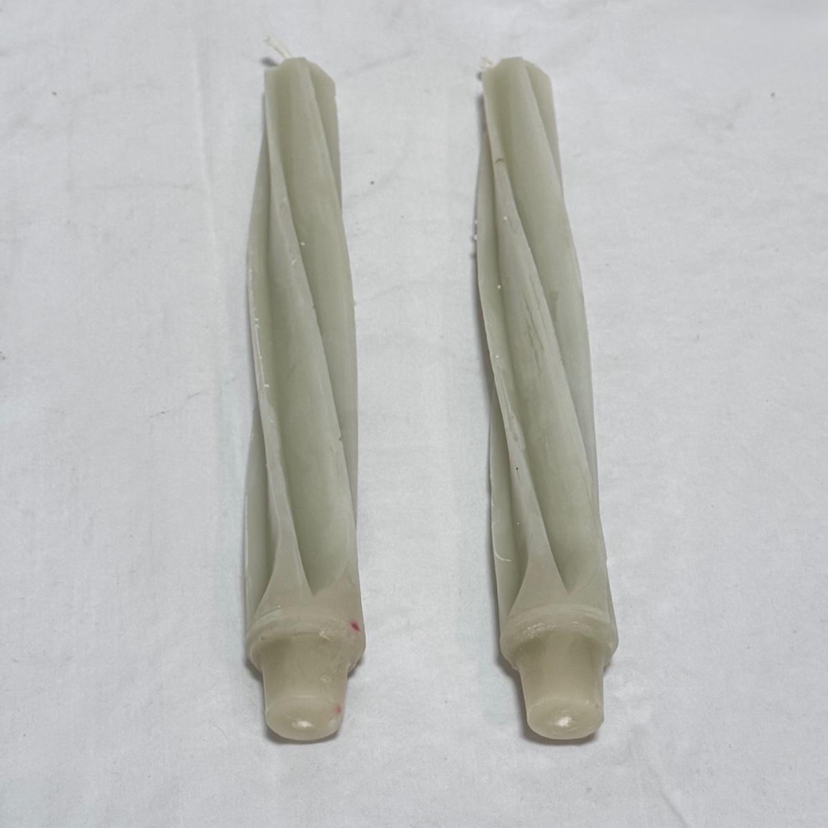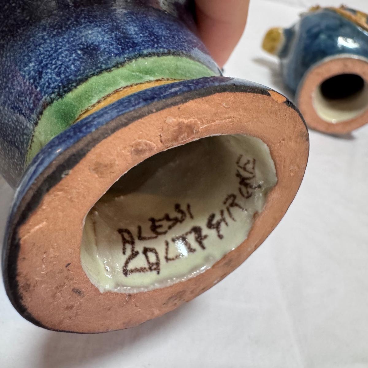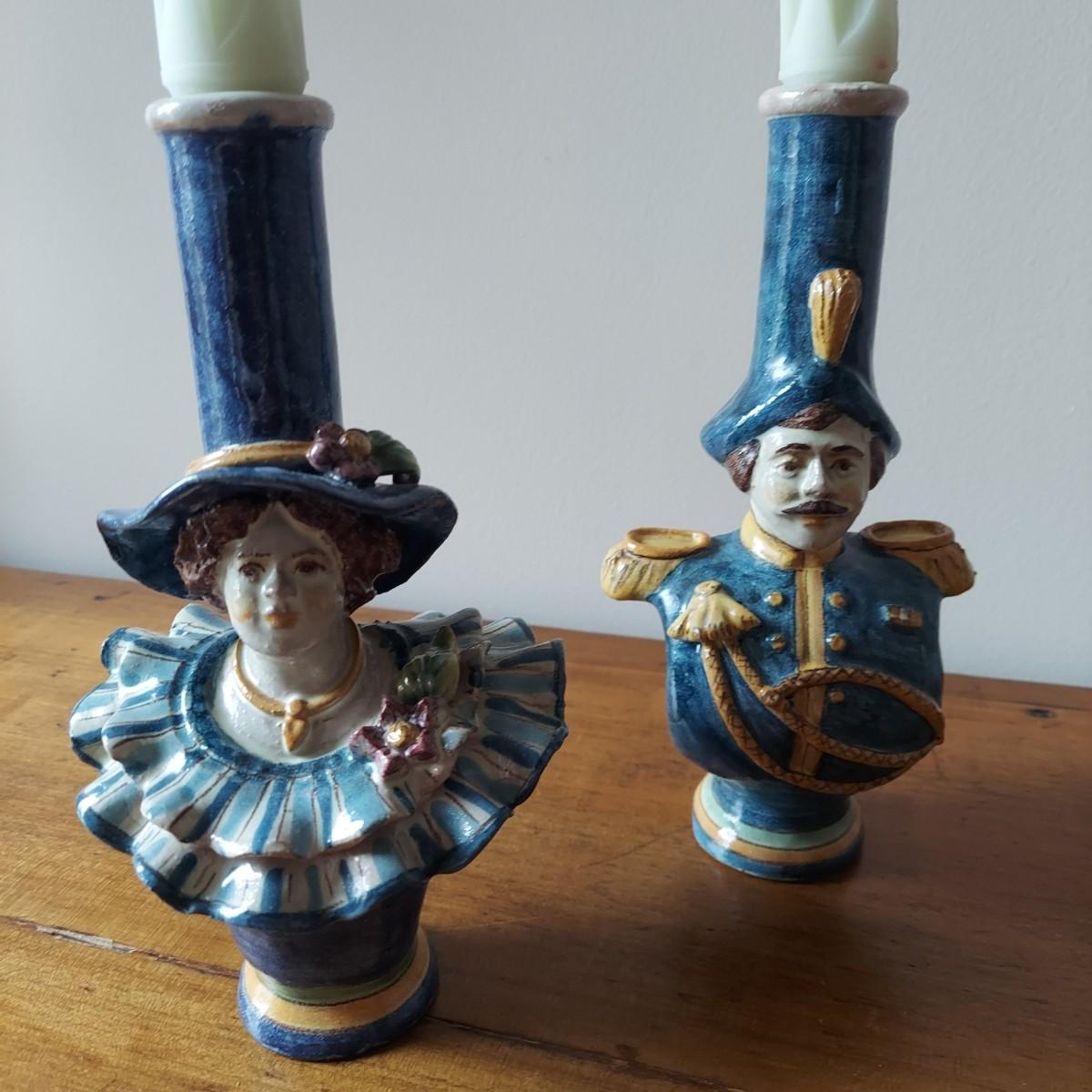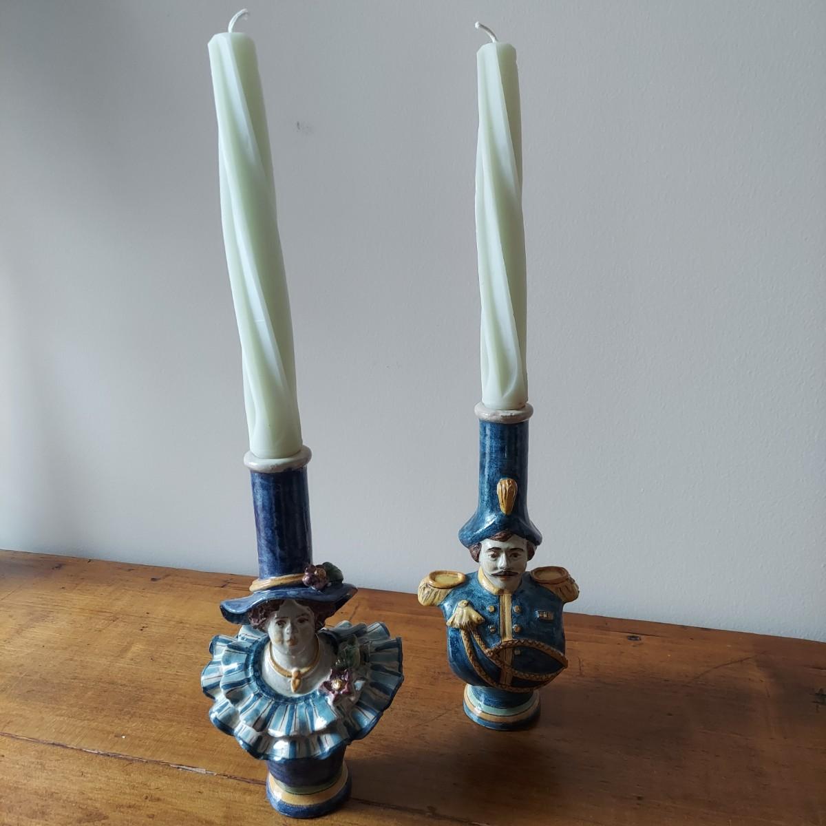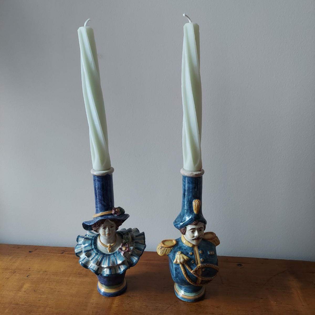 This lot includes two Sicilian ceramic candle sticks that appear to be by Giacomo Alessi. It also includes two light green candles. The candlesticks are both signed on the bottom. The lady candlestick is a bit larger than the other - it measures 4.95” x 4.95” x 9”H. Shipping available.