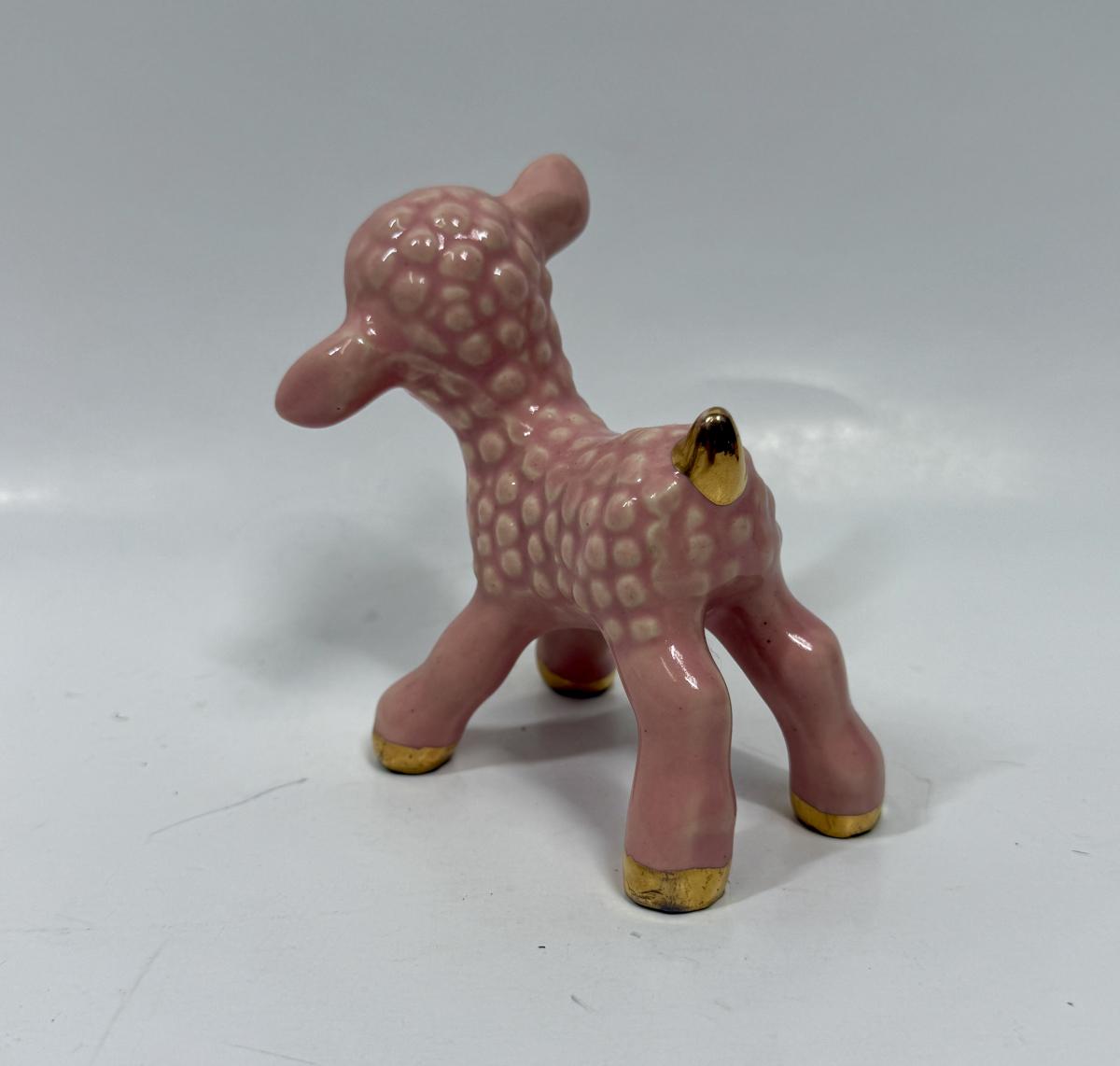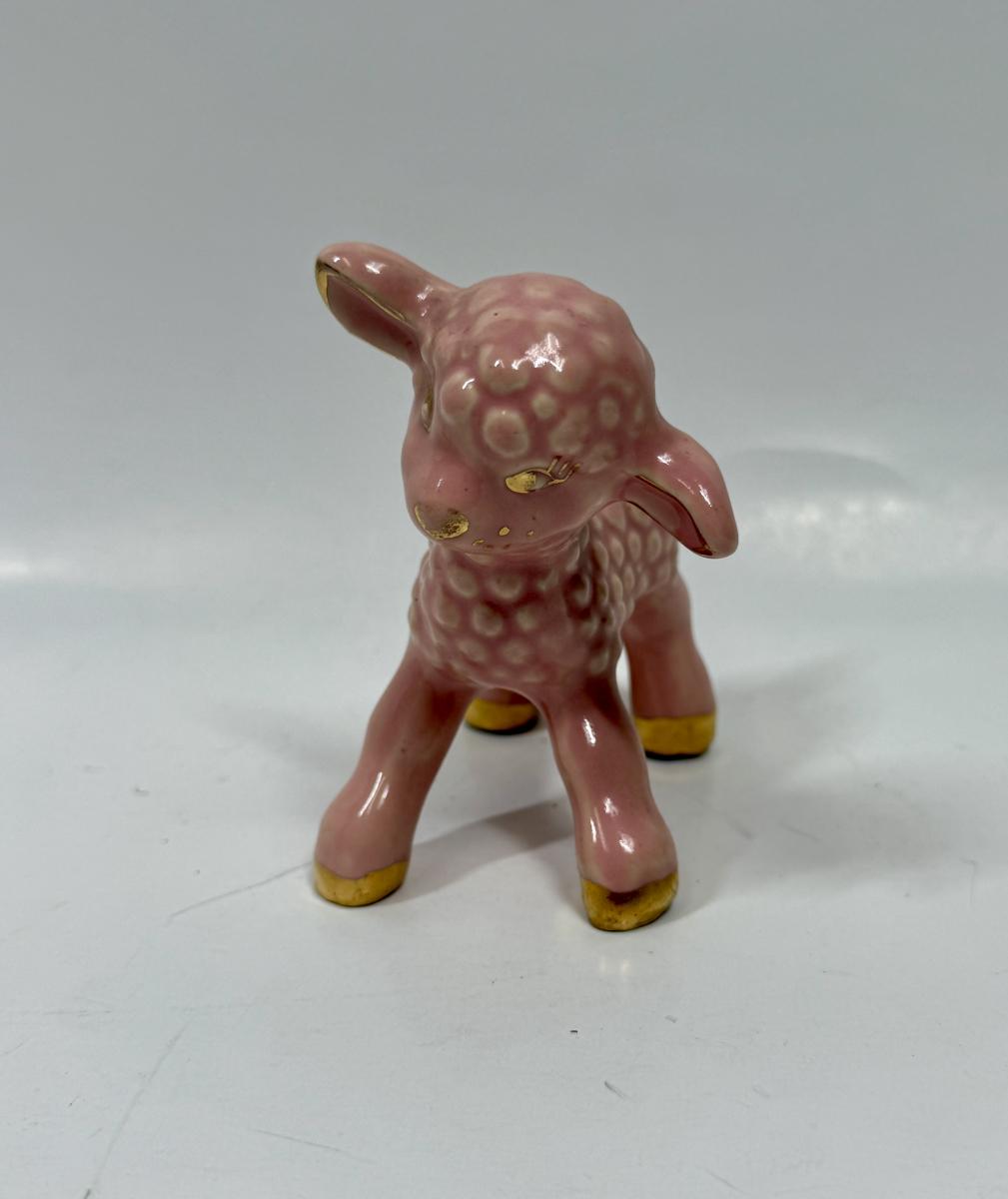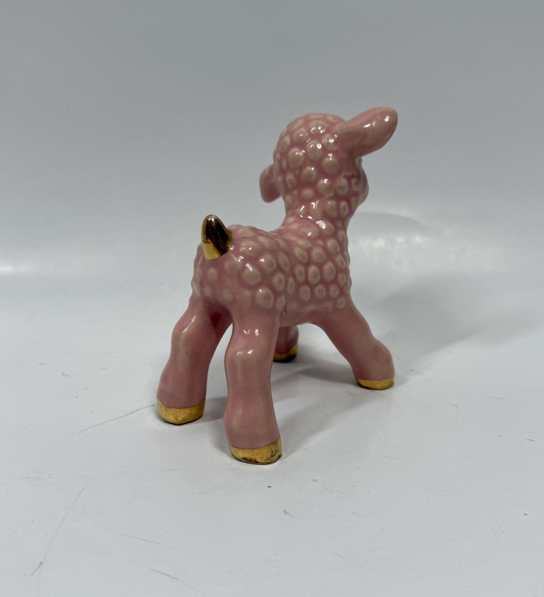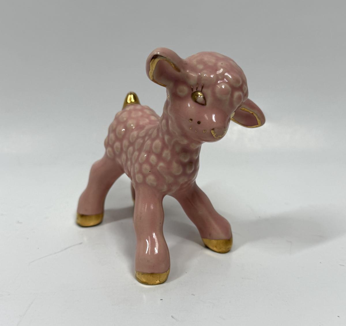 Vintage Pink Ceramic Baby Lamb Figurine, Trimmed in Gold Paint. Approx. 4" tall, good condition (no chips, cracks or crazing).