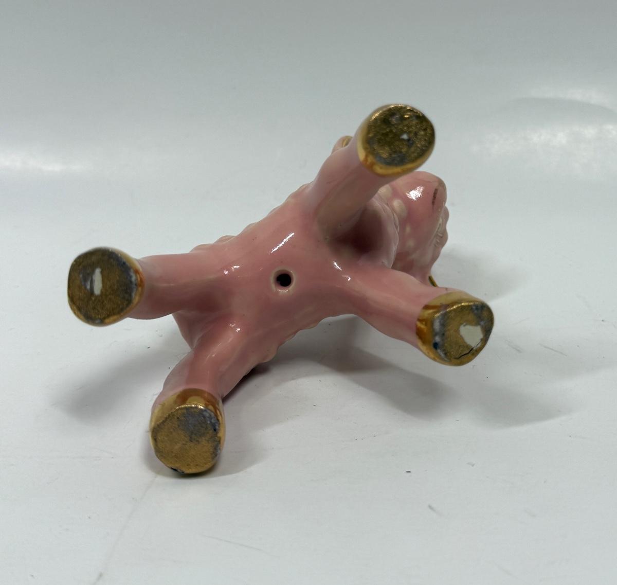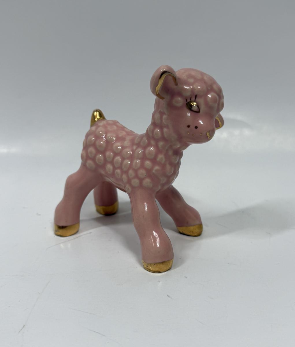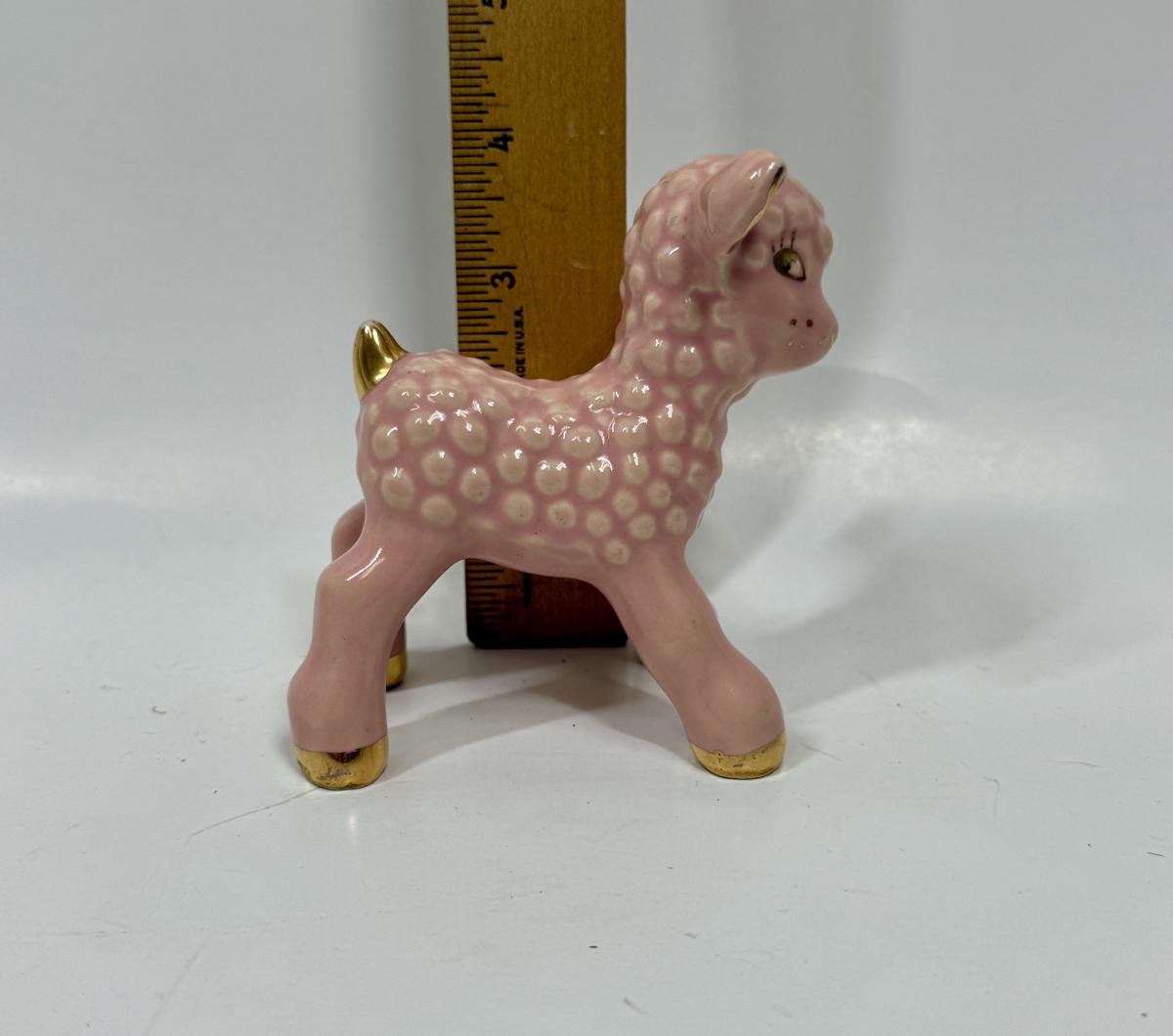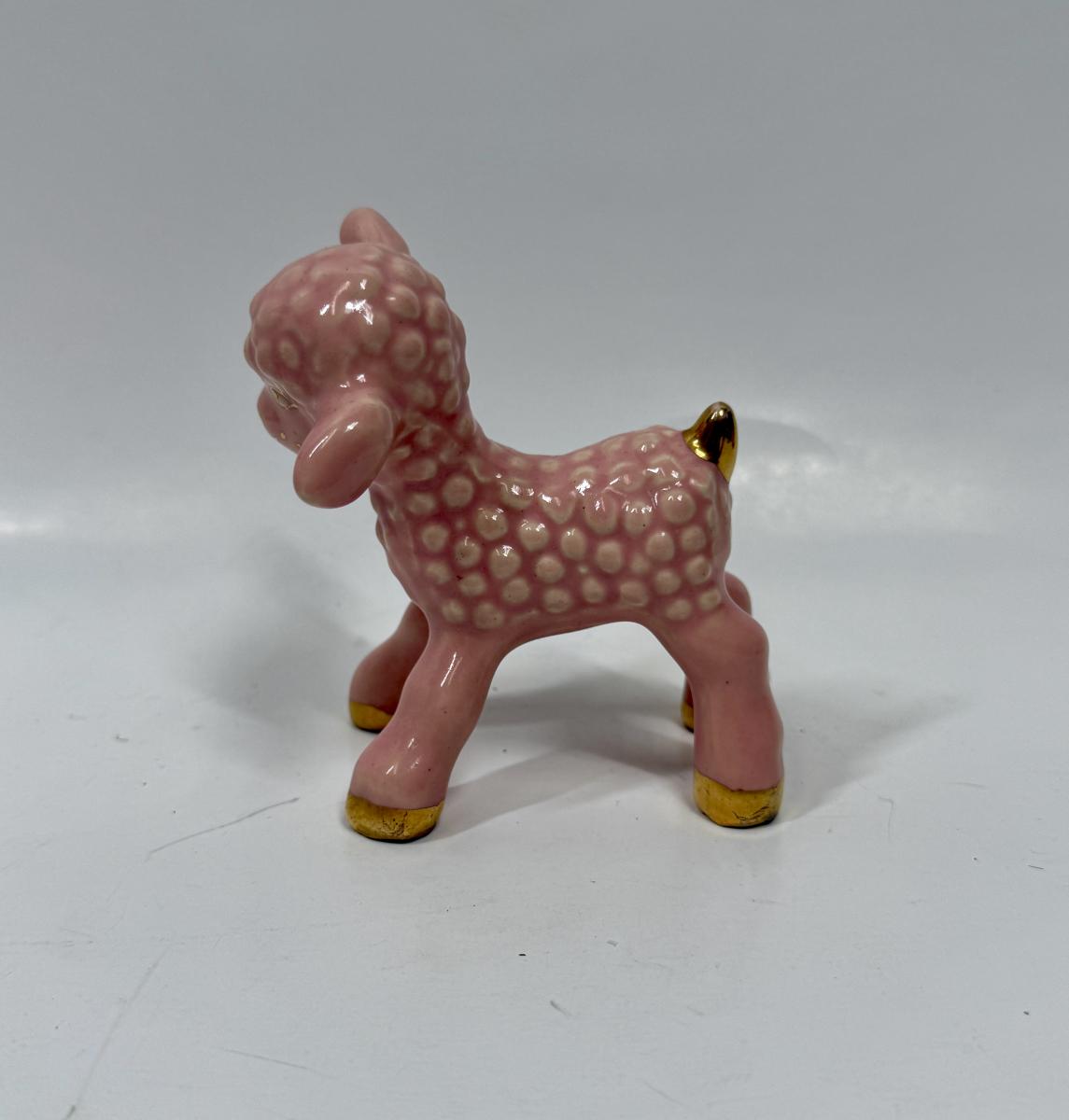 Vintage Pink Ceramic Baby Lamb Figurine, Trimmed in Gold Paint. Approx. 4" tall, good condition (no chips, cracks or crazing).