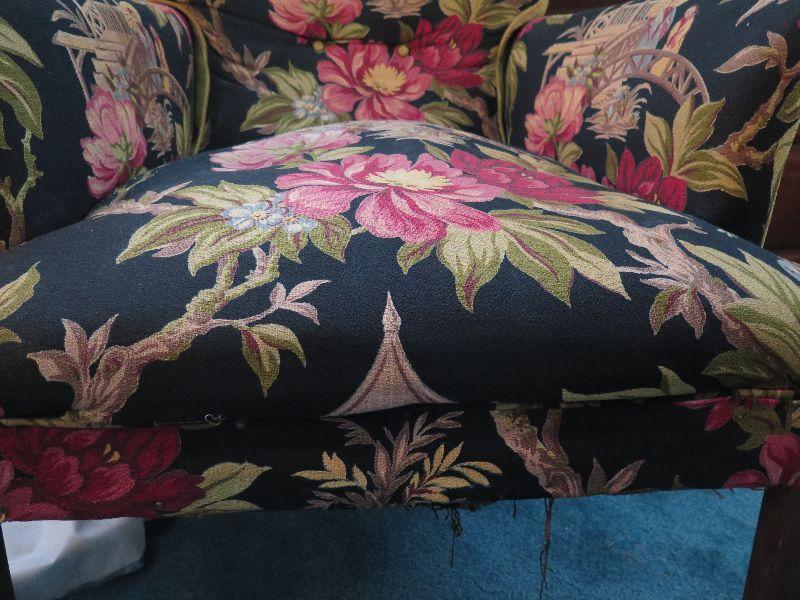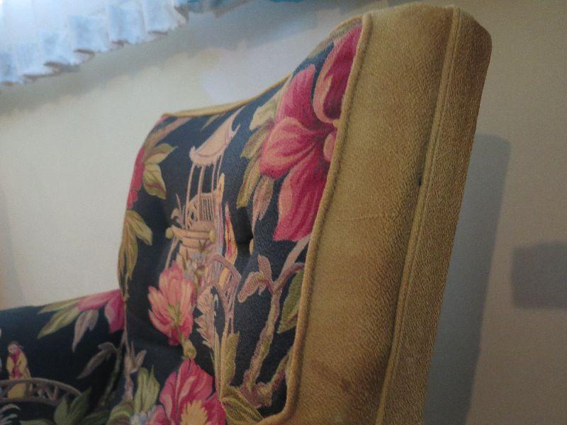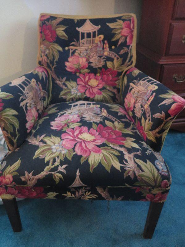 Vintage side chair is upholstered in an Asian themed fabric, but also has a custom slip cover. Please review all photos and read Terms and Conditions before placing a bid. Pick up is Wednesday, November 20 from 4-7pm and Saturday, November 23 from 9am-2pm in Mantua, New Jersey. All sales are final. All sales are as is, where is. Please bring all boxes, tools, and muscle needed to remove your items. Any photo props are not included. All measurements are approximate. Items come from dog-friendly home.