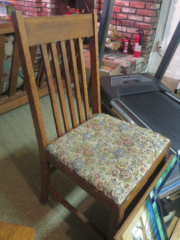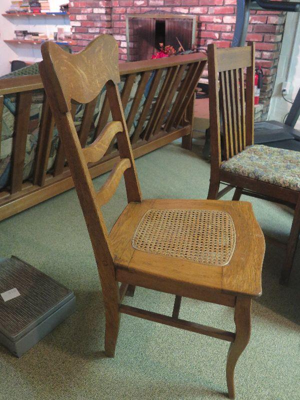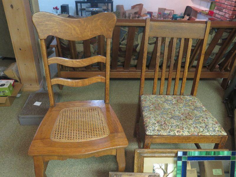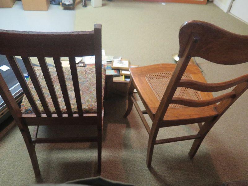 Two wooden side chairs. One has caned seat and the other is padded and upholstered. Normal wear.