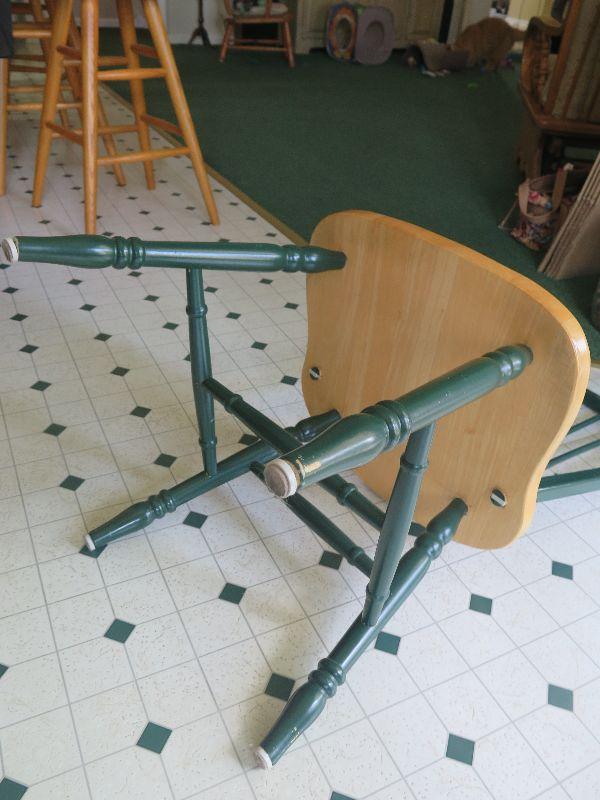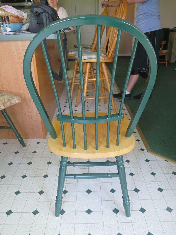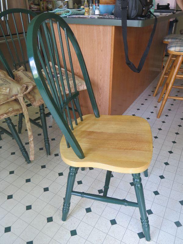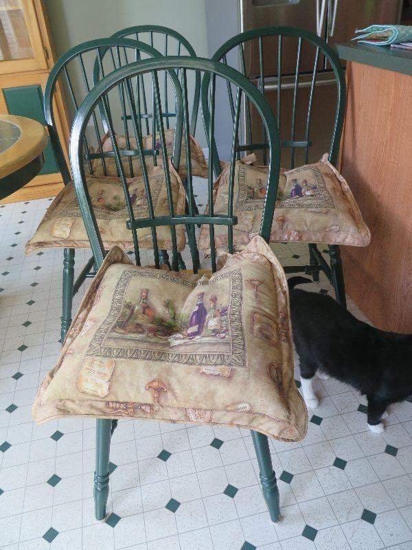 Four side chairs, natural wood with green painted back and legs. Includes cushions. Bring help to move. **Please read Terms and Conditions before placing a bid. Pick up is Wednesday July 31st, from 2 pm to 7pm in Sicklerville. All sales are final. All sales are as is, where is. Please review all photos. Any props included in photos are not included in listing. All measurements are approximate.
