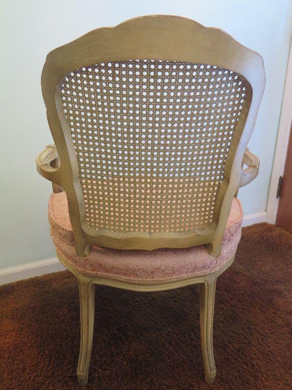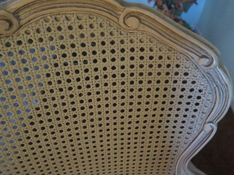 Pair of vintage French Provincial style accent chairs with padded seats and woven wicker backs. Wear noted. Please review all photos and read Terms and Conditions before placing a bid. Pick up is Wednesday, November 20 from 4-7pm and Saturday, November 23 from 9am-2pm in Mantua, New Jersey. All sales are final. All sales are as is, where is. Please bring all boxes, tools, and muscle needed to remove your items. Any photo props are not included. All measurements are approximate. Items come from dog-friendly home.