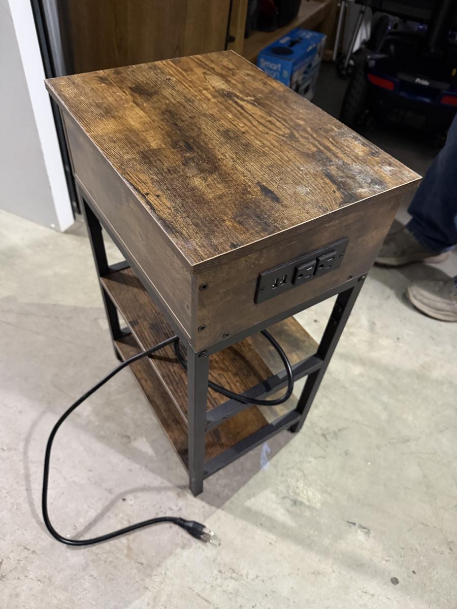 This table plugs into the wall and has an outlet on the side for you to plug in to