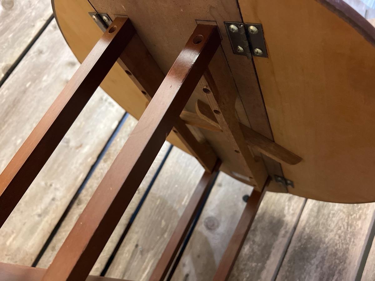 Versatile vintage wood table with cut out handles on each end of rectangular top. Two sides flip up to create a full rounded table or one side for a half moon. 24” tall, 24” round (includes handles). Some scratches and scuffs common to used furniture.