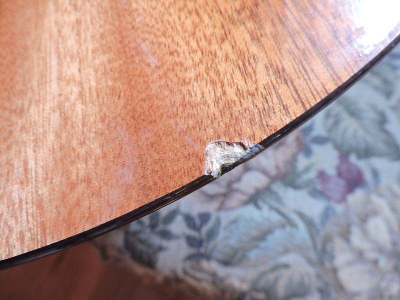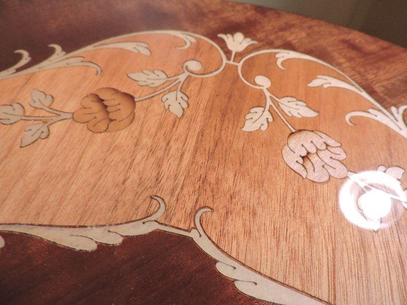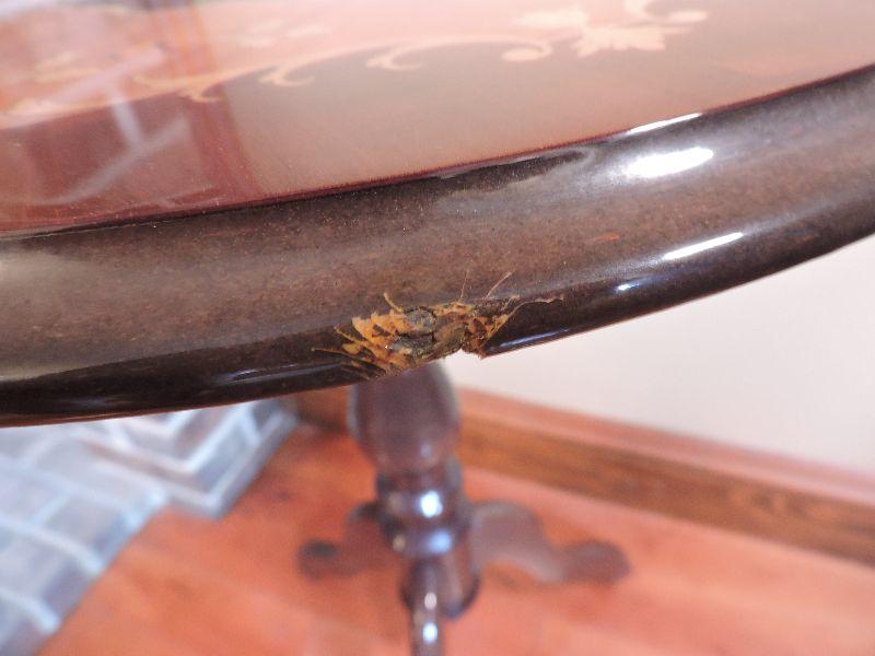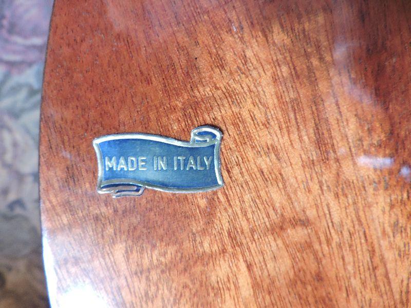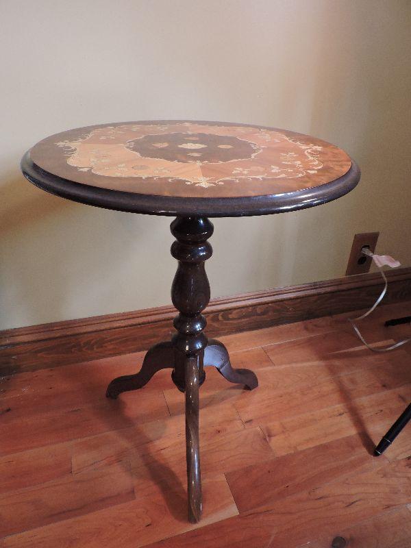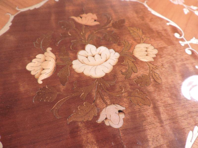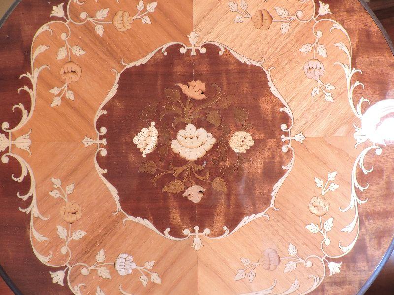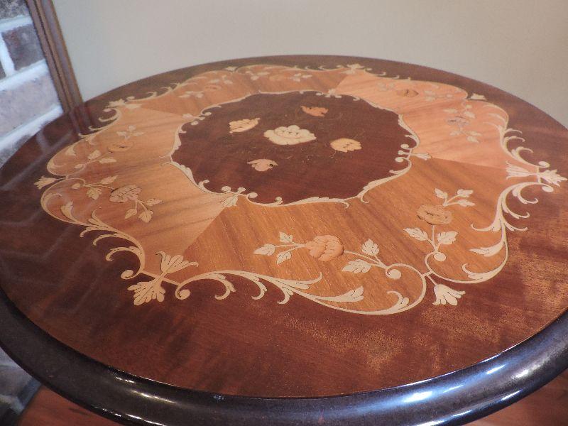 Inlaid wood side table made in Italy. Damage is pictured. Please read Terms and Conditions before placing a bid. Pick up is Friday, October 25th between 4 and 7, and Saturday, October 26th between 9 and 1. Props included in photos are not included in listing. All measurements are approximate. Comes from home with cats.