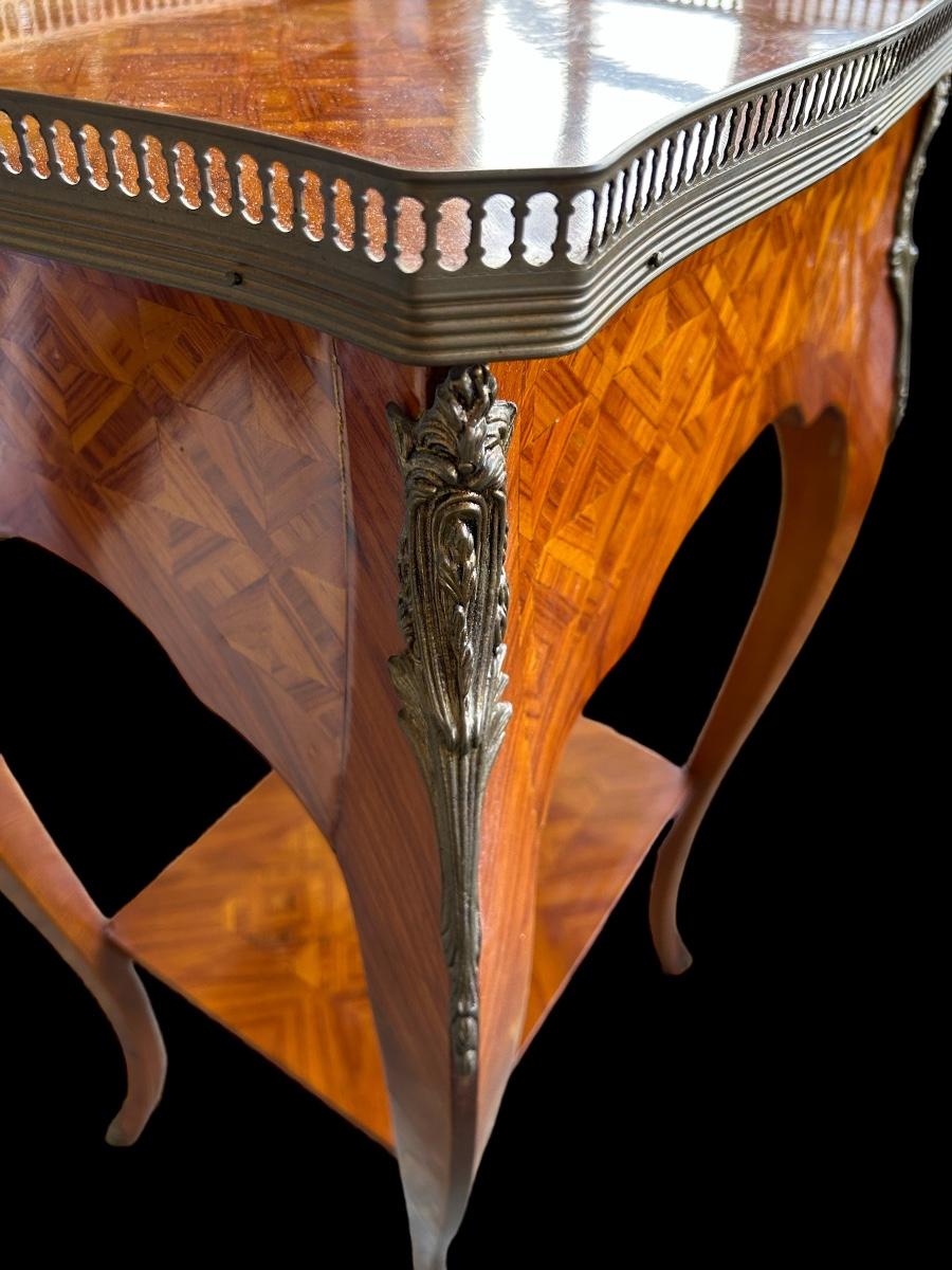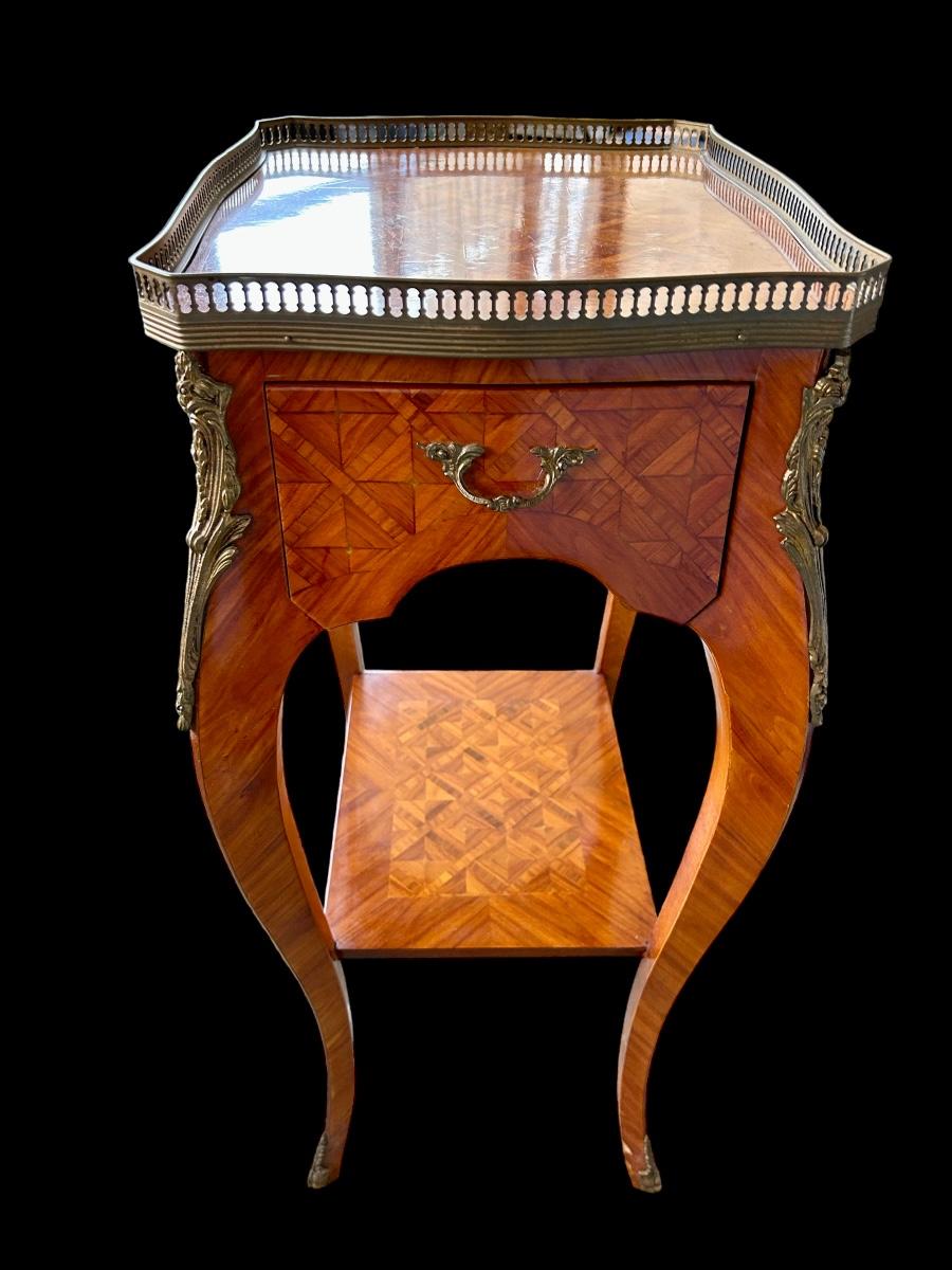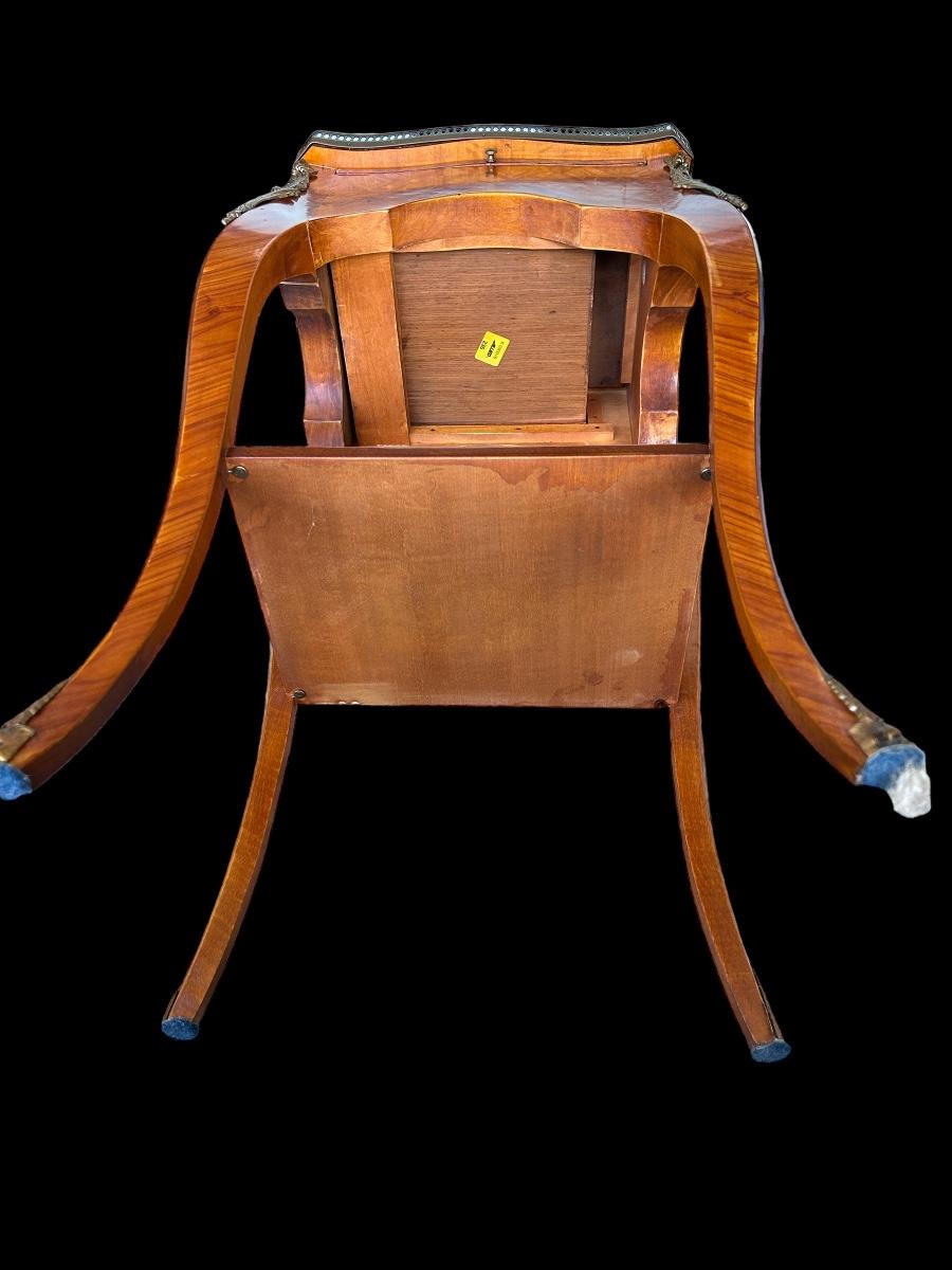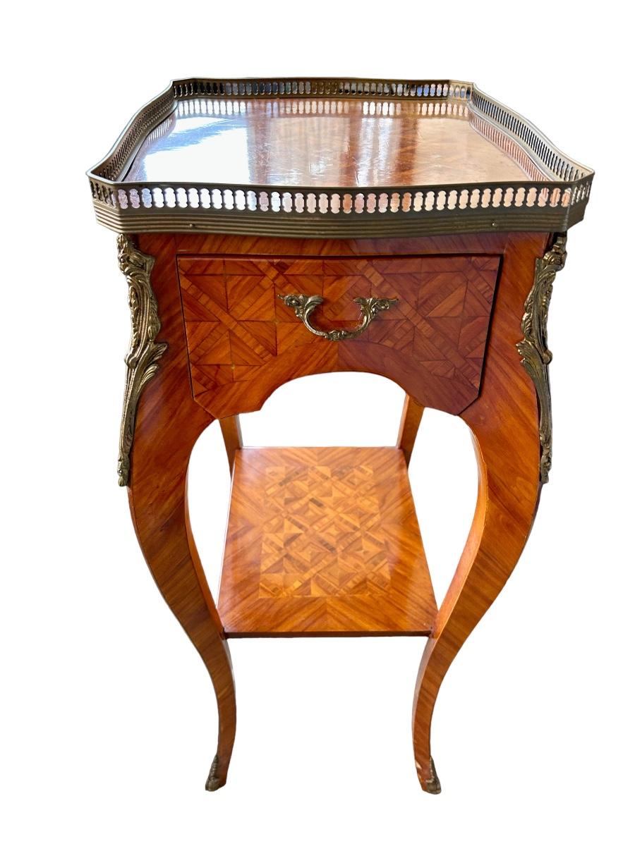 Gorgeous French style side table with beautiful detail and craftsmanship is finished on all 4 sides. Aged brass hardware. The table was purchased from and Antique dealer in Atlanta, Georgia.