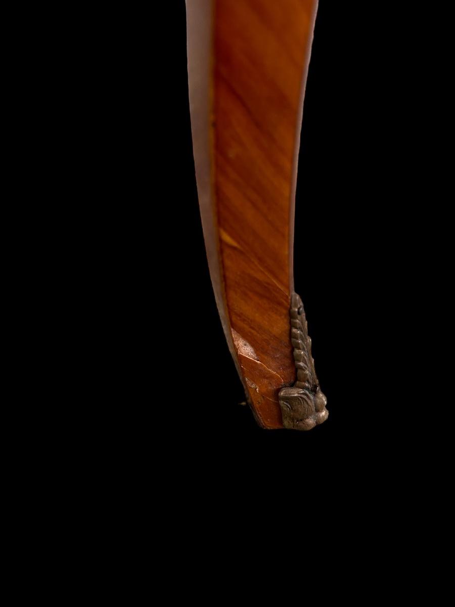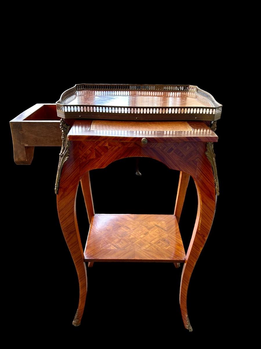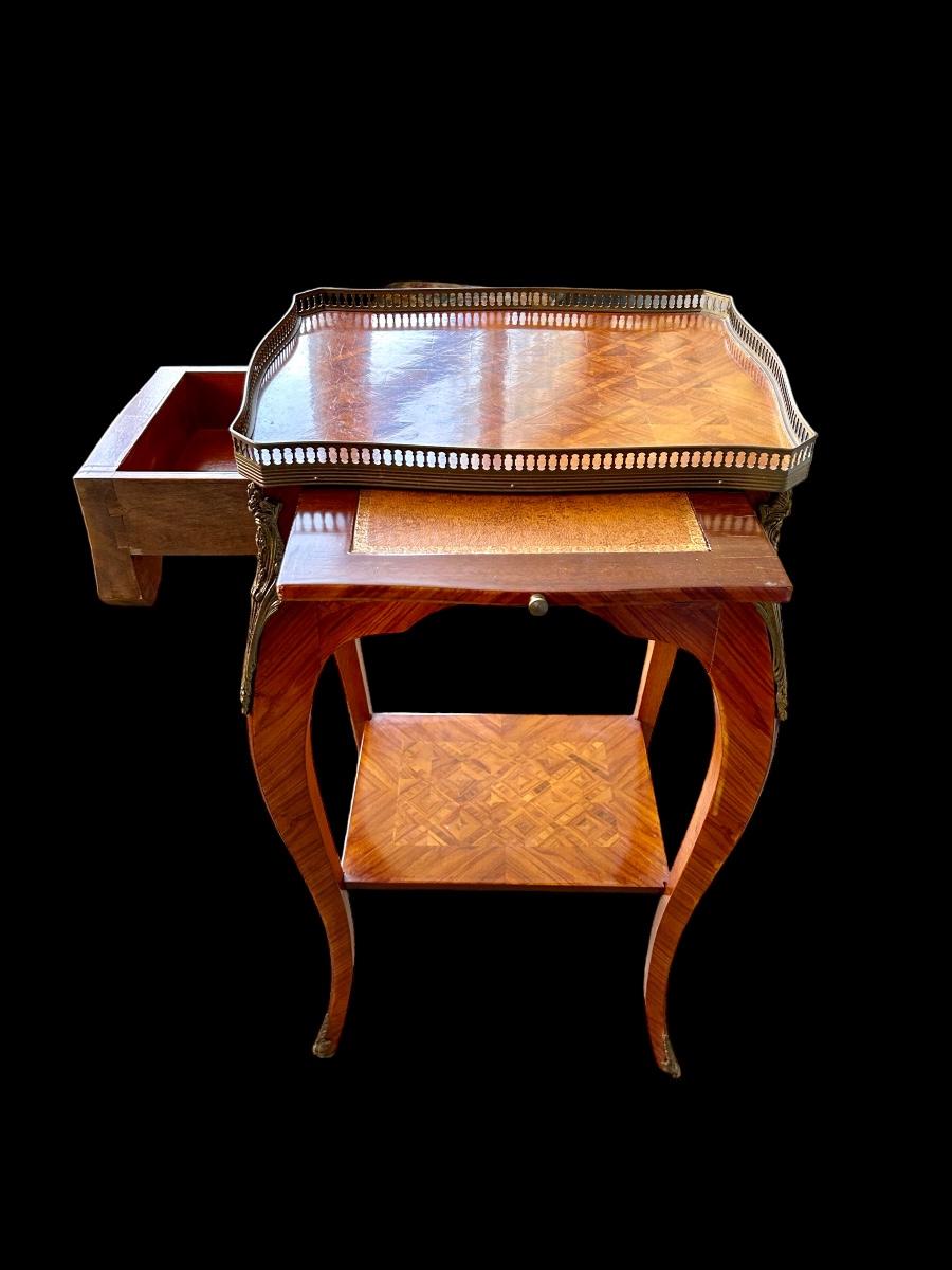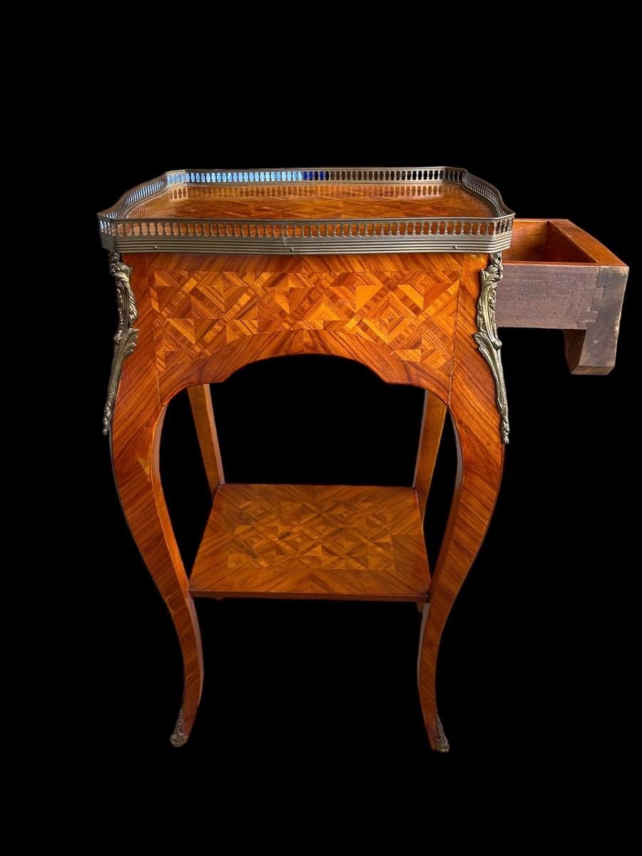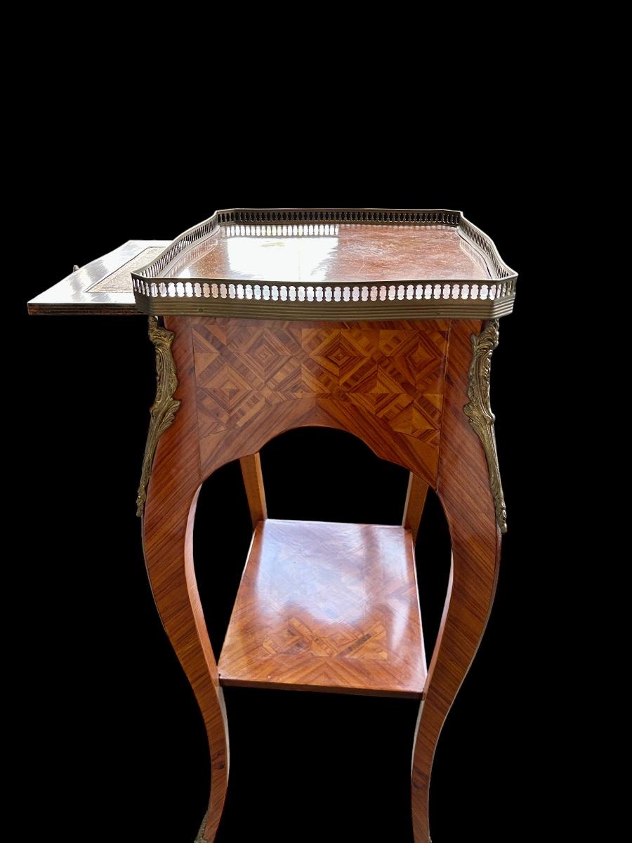 Gorgeous French style side table with beautiful detail and craftsmanship is finished on all 4 sides. Aged brass hardware. The table was purchased from and Antique dealer in Atlanta, Georgia.
