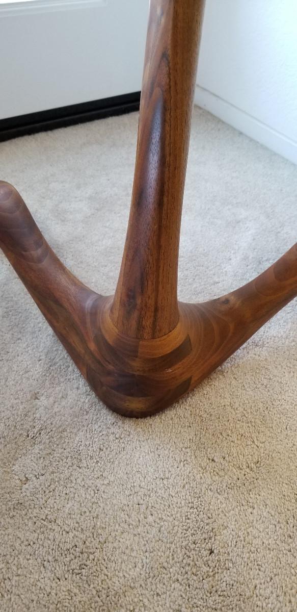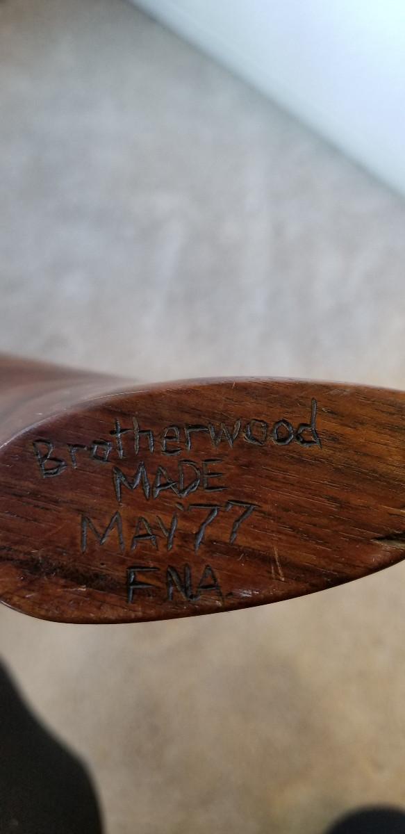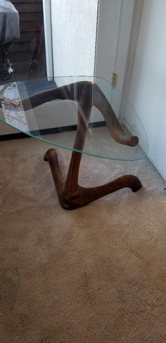 Side Table "Wishbone" style. Dimensions - Glass top - 29 1/4" w X 19 1/4" d X 1/4" thick. Legs - 24 1/4" h X 26 1/4" w X 16 3/4" d. Makers Mark: "Brotherwood Made May '77 F.N.A.". Item condition - appears to show normal use commensurate with its age.