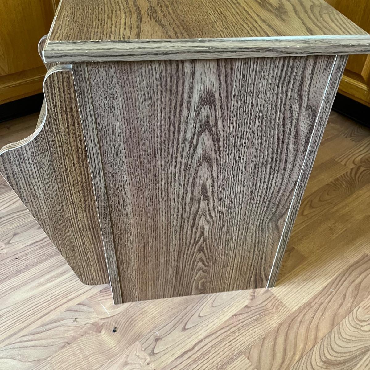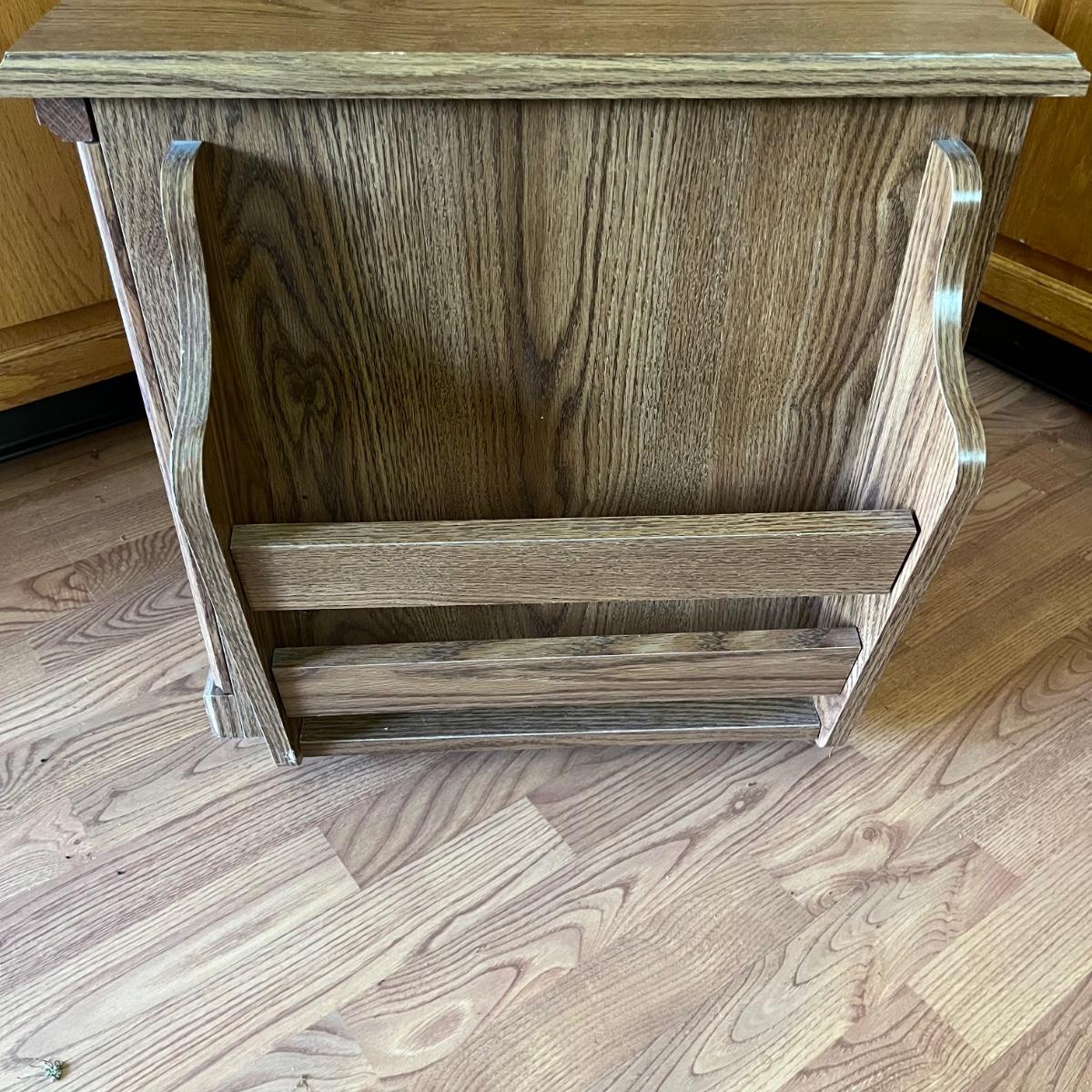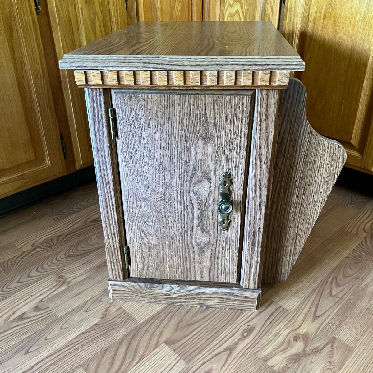 Lot includes a Press board side table with a built in magazine rack and slide out shelf and cabinet underneath. Table measures 18.5” x 21” x 20.5”.