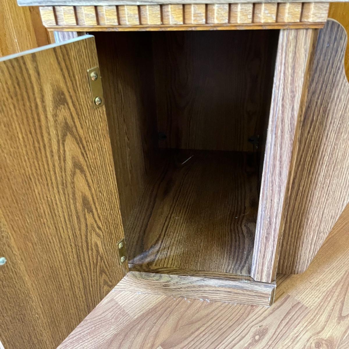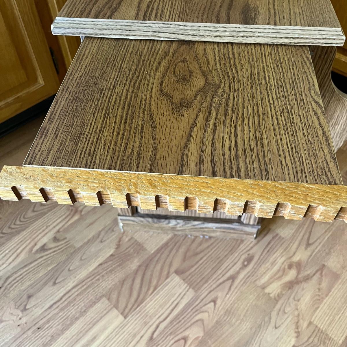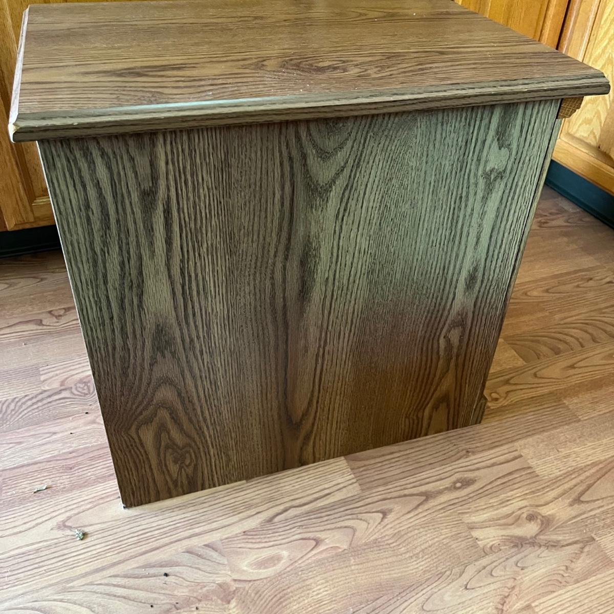 Lot includes a Press board side table with a built in magazine rack and slide out shelf and cabinet underneath. Table measures 18.5” x 21” x 20.5”.
