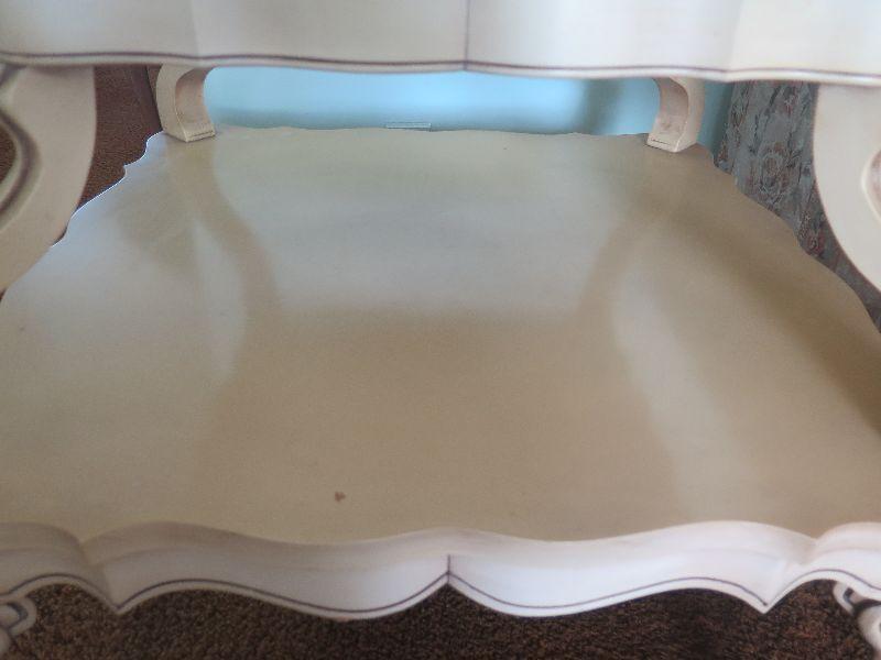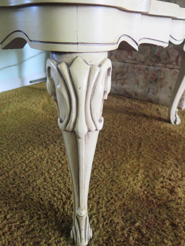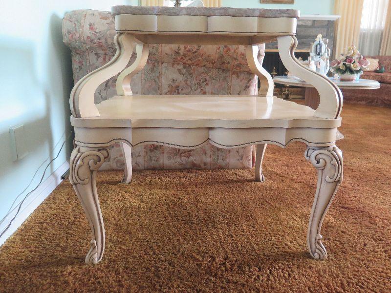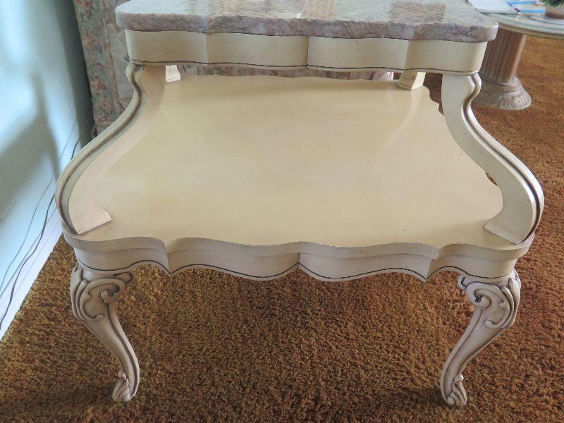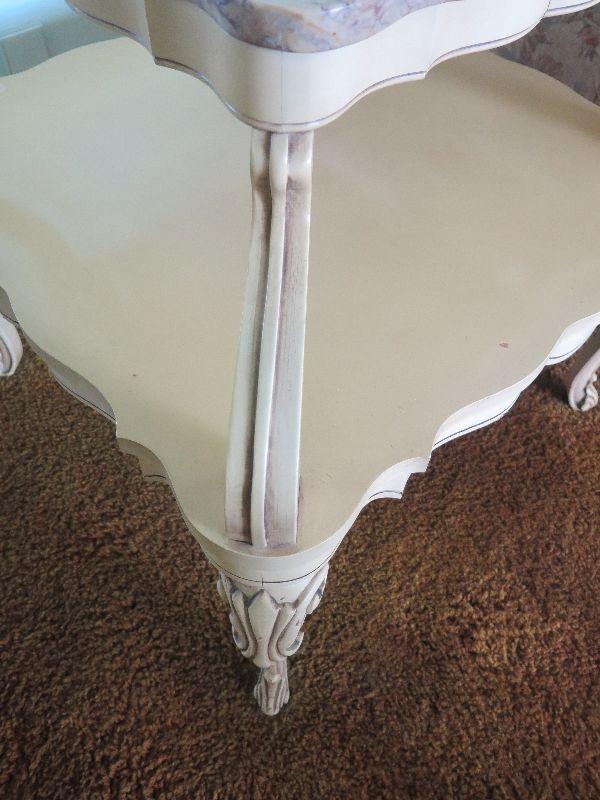 Pair of vintage, two-tiered side tables with ornate carved legs and marble top in French Provincial style. Please review all photos and read Terms and Conditions before placing a bid. Pick up is Wednesday, November 20 from 4-7pm and Saturday, November 23 from 9am-2pm in Mantua, New Jersey. All sales are final. All sales are as is, where is. Please bring all boxes, tools, and muscle needed to remove your items. Any photo props are not included. All measurements are approximate. Items come from dog-friendly home.