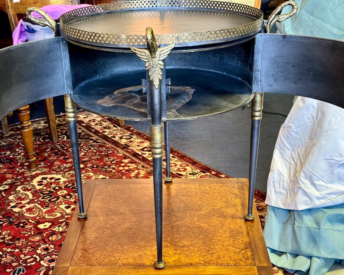 This unusual vintage table has a removeable serving tray, two opening doors, brass gallery trim on try, brass swan head detail.