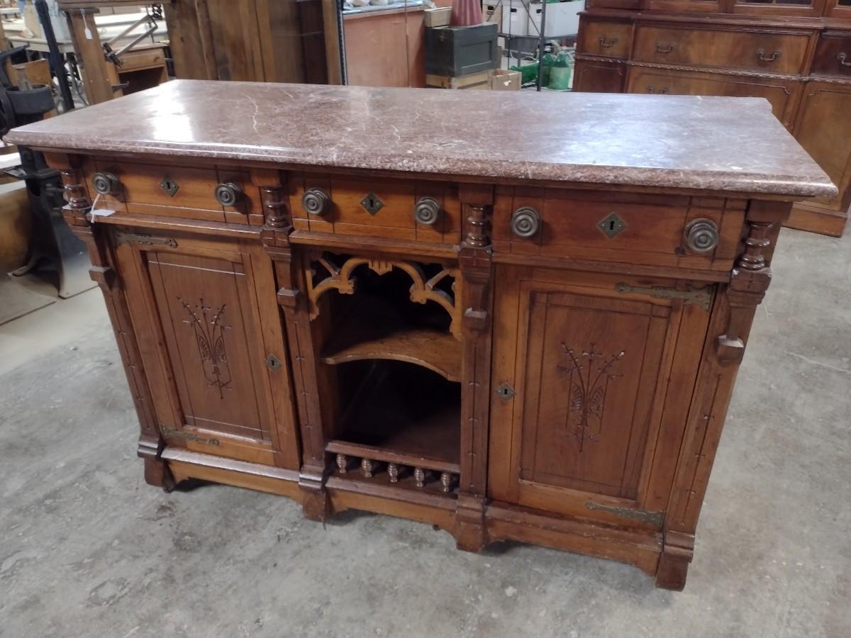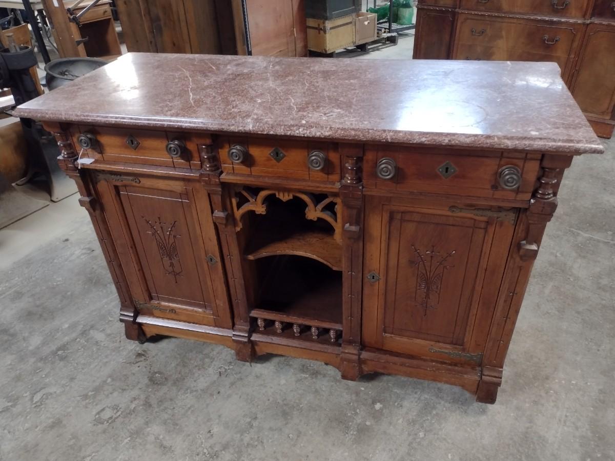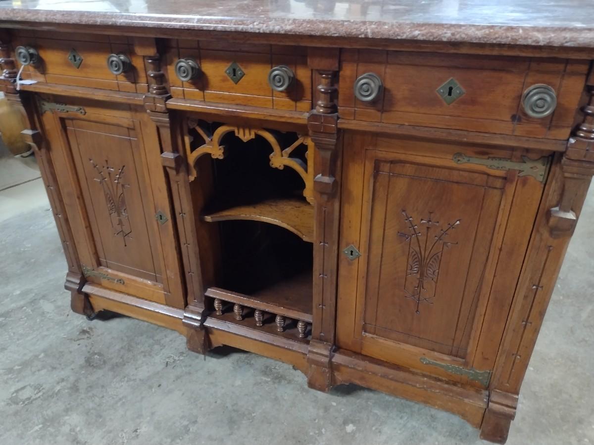 Antique Eastlake Design Walnut Finish Marble Top Sideboard