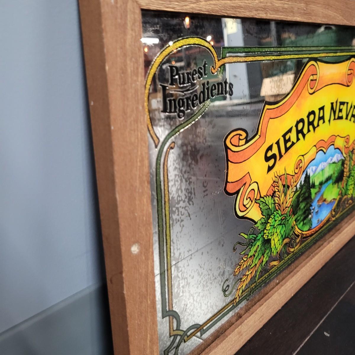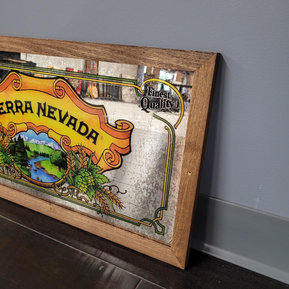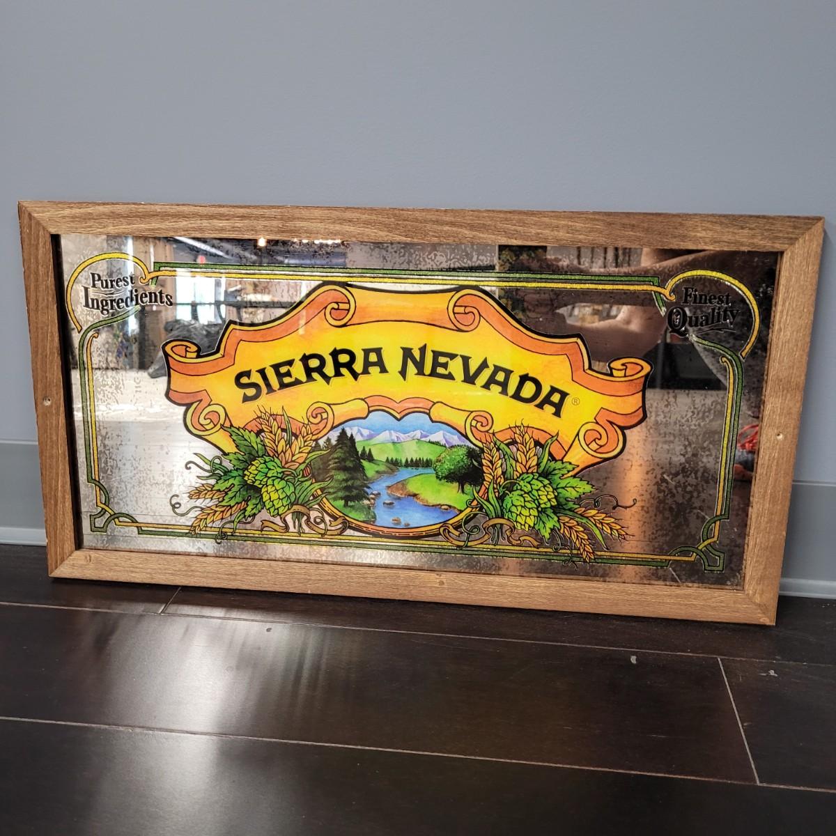 Sierra Nevada mirror in wooden frame. Spotting throughout mirror, some knicks in frame (see pictures). Measures approximately 24.5" x13". Shipping available.
