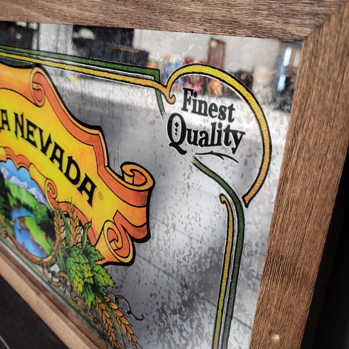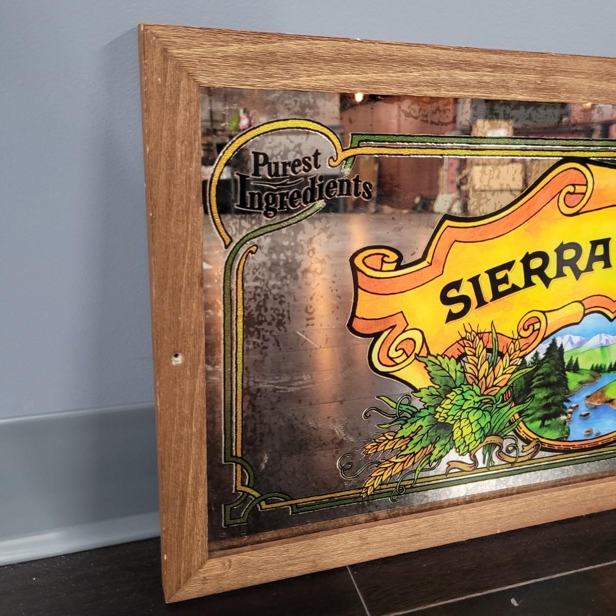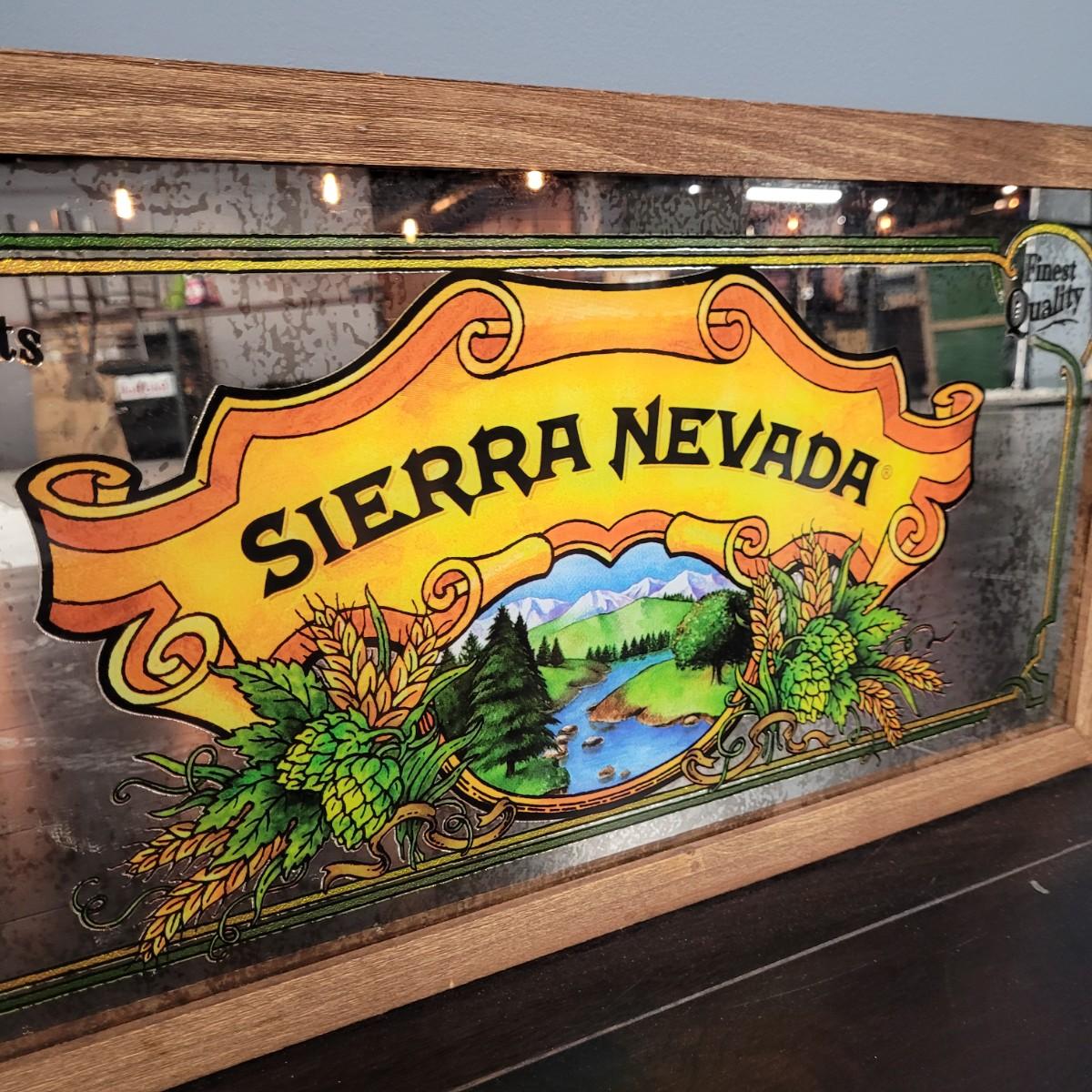 Sierra Nevada mirror in wooden frame. Spotting throughout mirror, some knicks in frame (see pictures). Measures approximately 24.5" x13". Shipping available.
