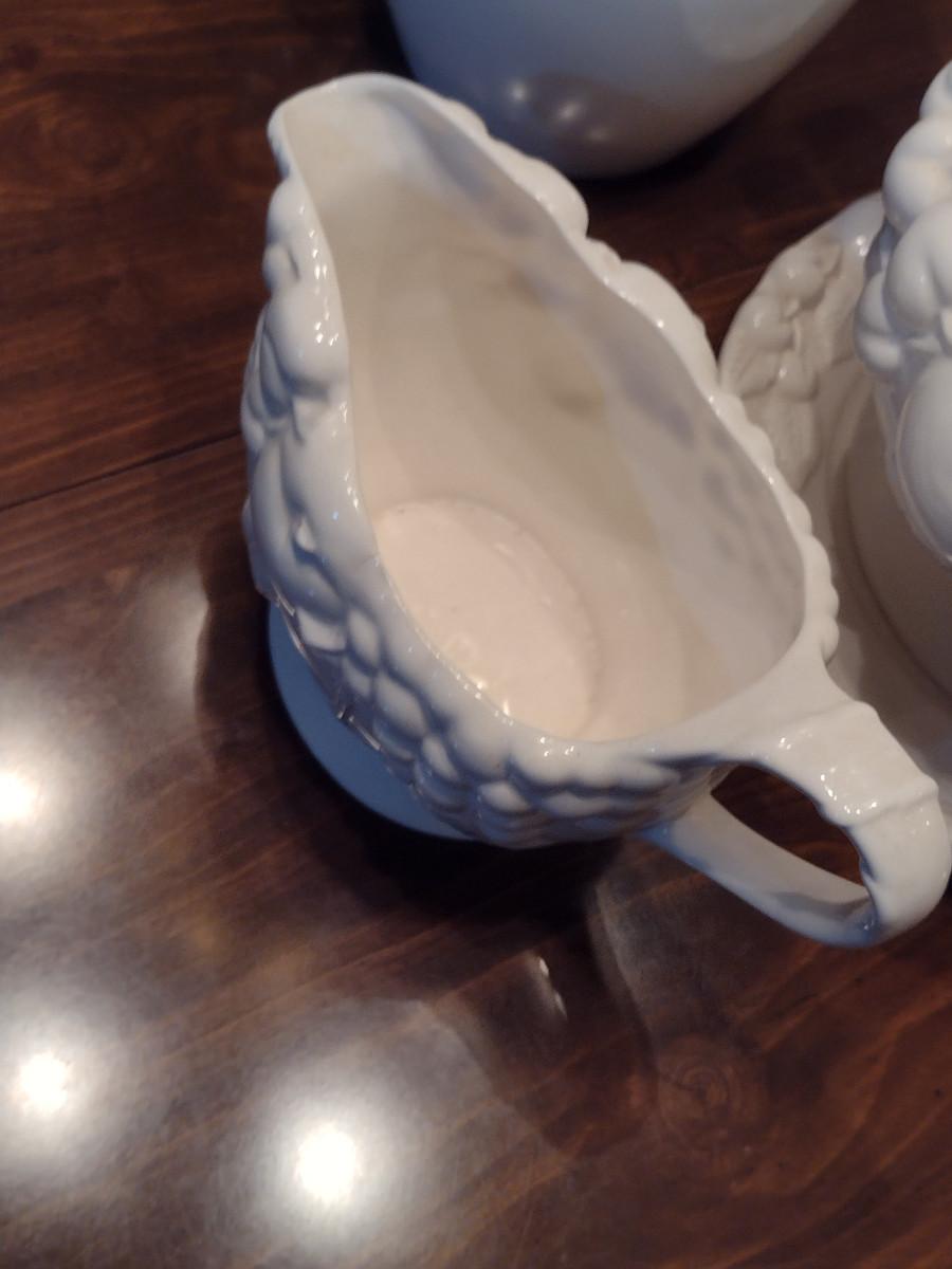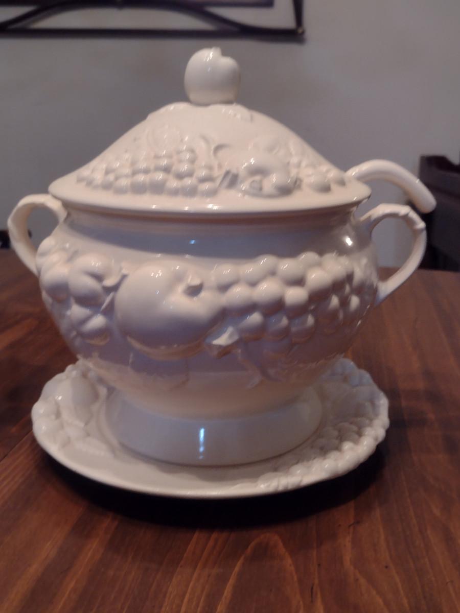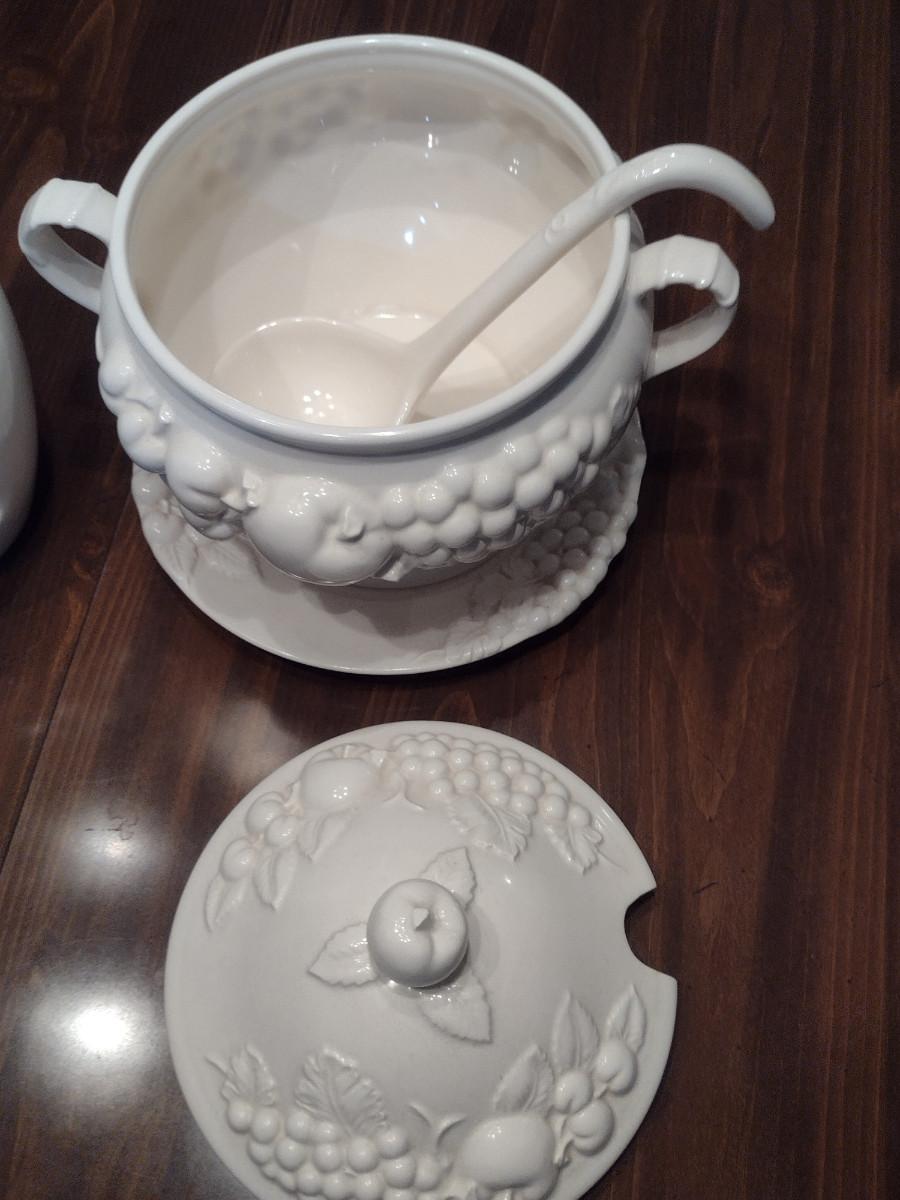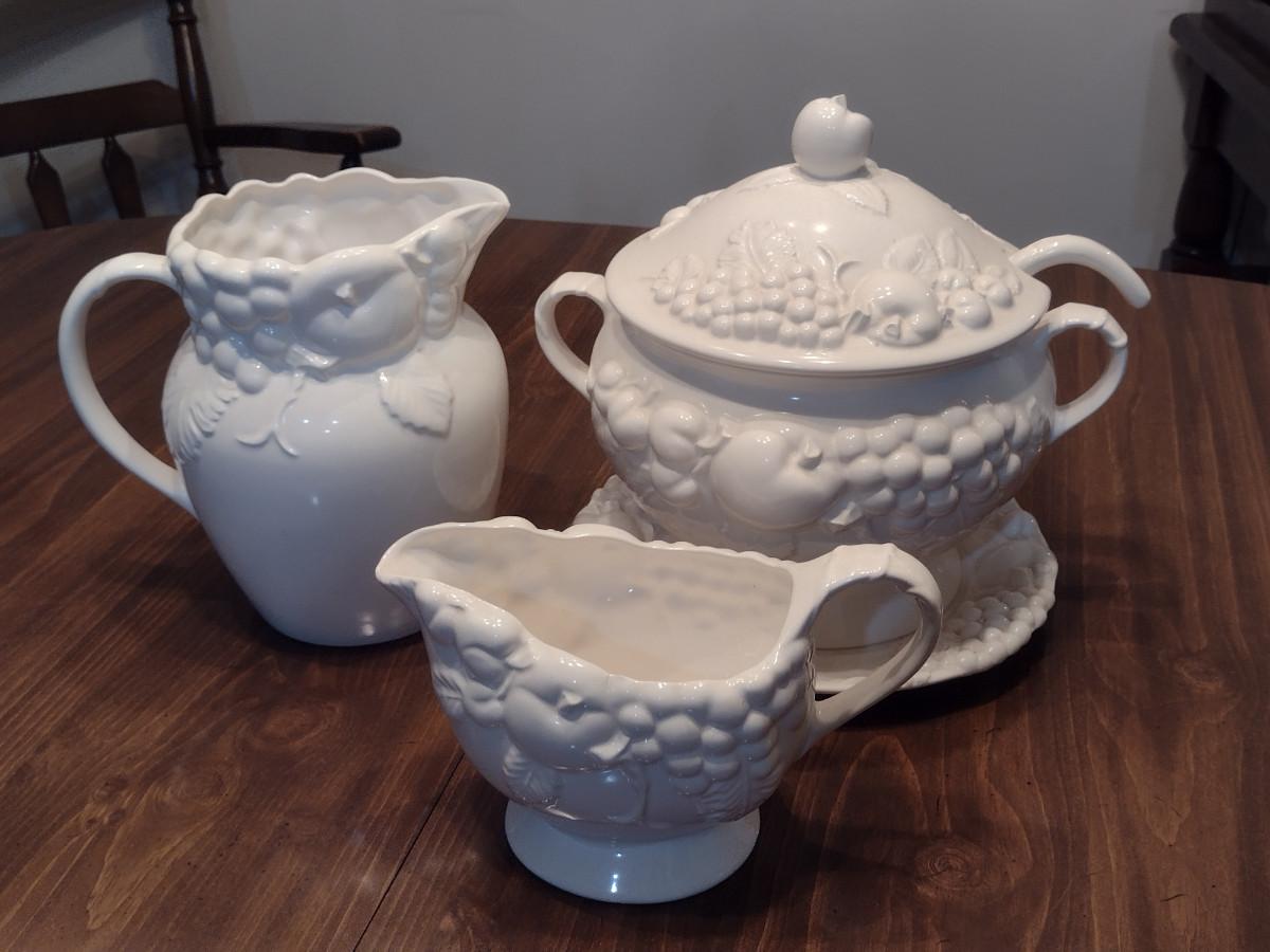 Sig Japanese Porcelain- Three Pieces- Gravy Boat, Pitcher, Covered Soup Taurine with Plate and Ladle. Gravy boat has small crack- please see all pictures for condition.
