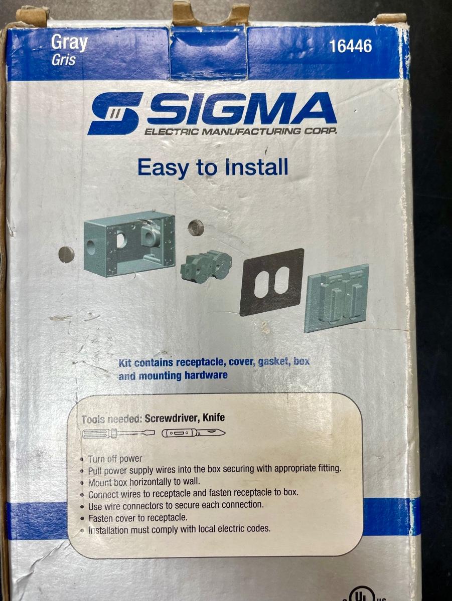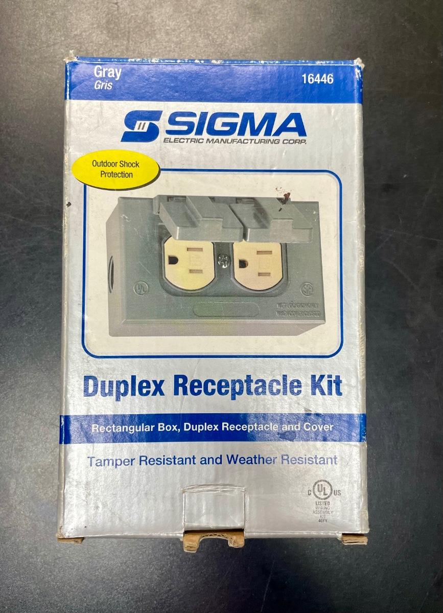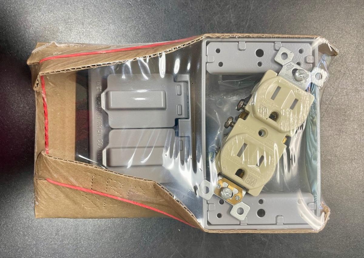 Outdoor use 2-plug electrical receptacle box kit, still in shrink wrap. Includes receptacle, box and cover.