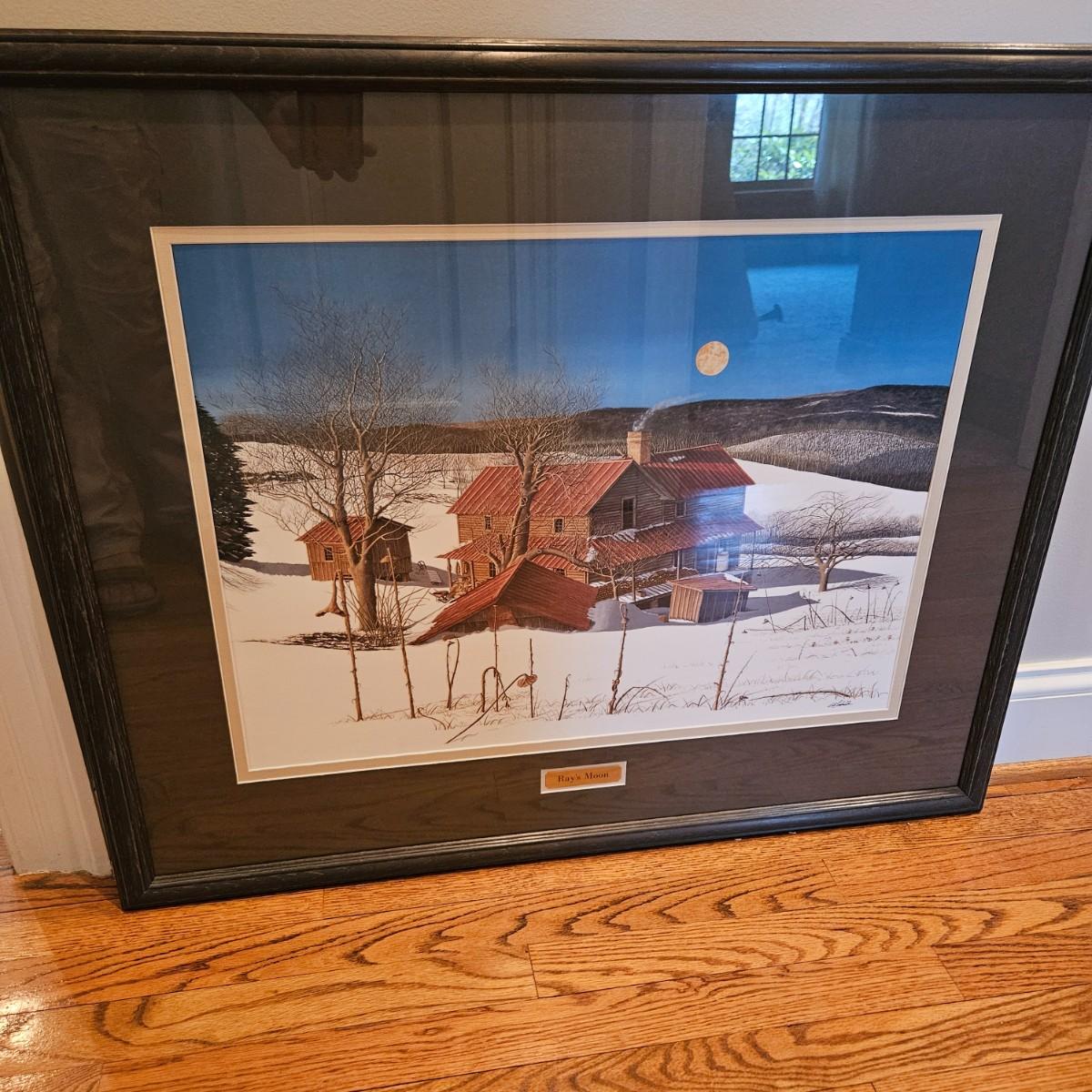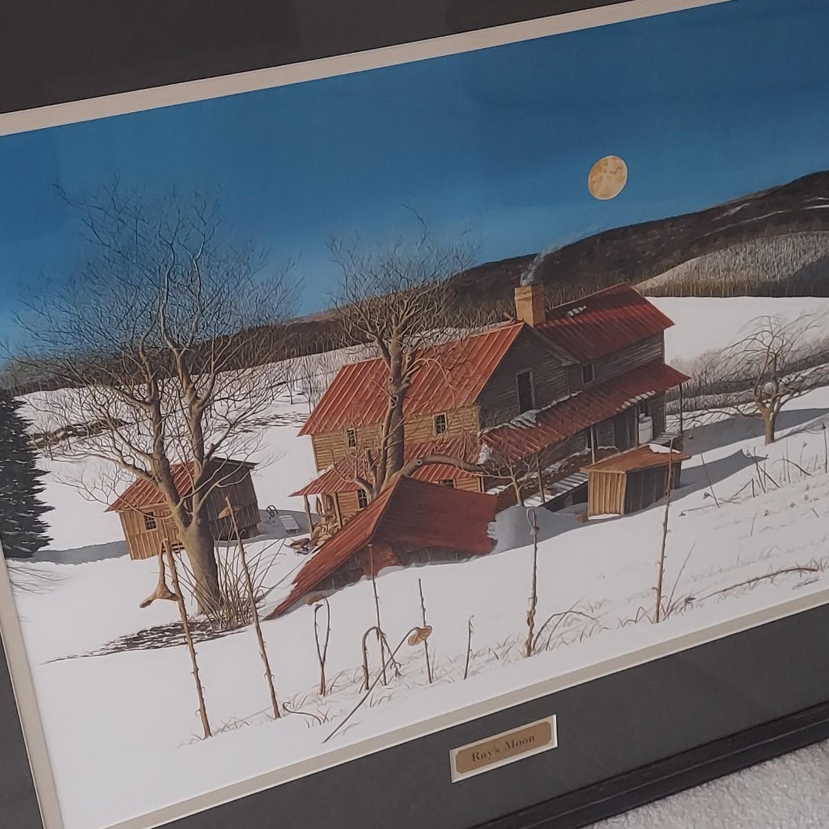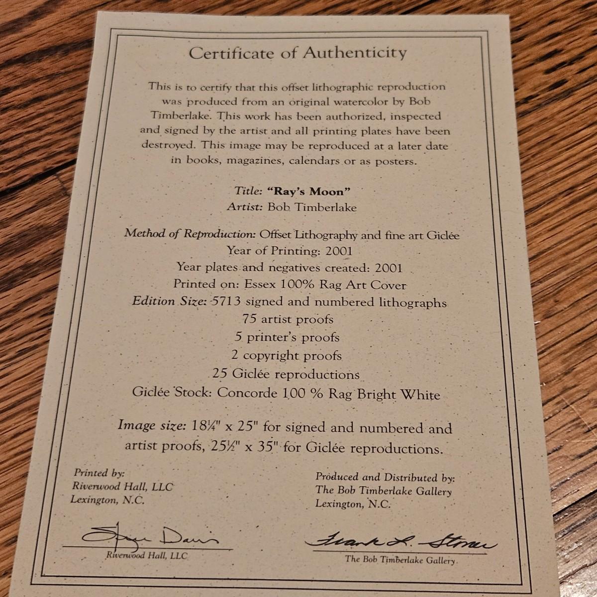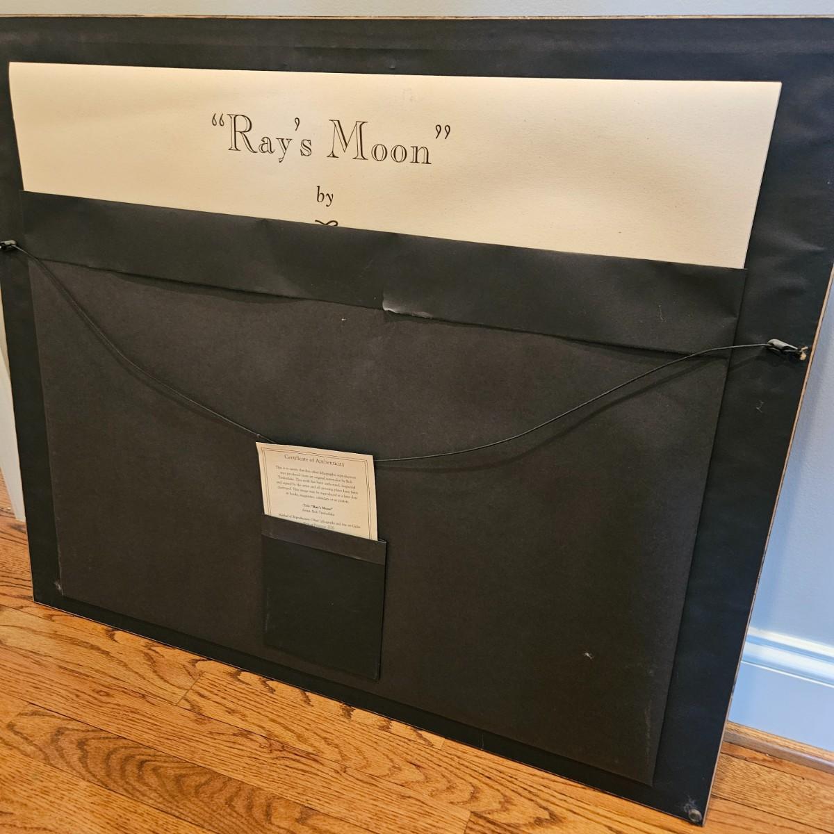 A signed and framed print by Bob Timberlake titled "Ray's Moon". It is framed in a solid wood frame with a black stain that is double matted with a brass plaque of the title. It includes the print sleeve and a certificate of authenticity. The frame measures approximately 35" x 29.5"H. Shipping available