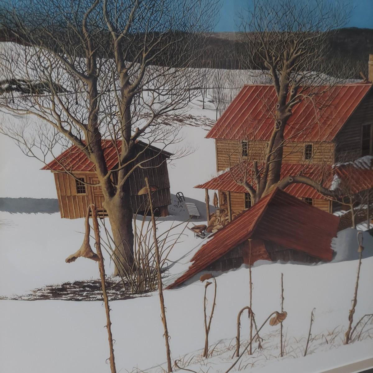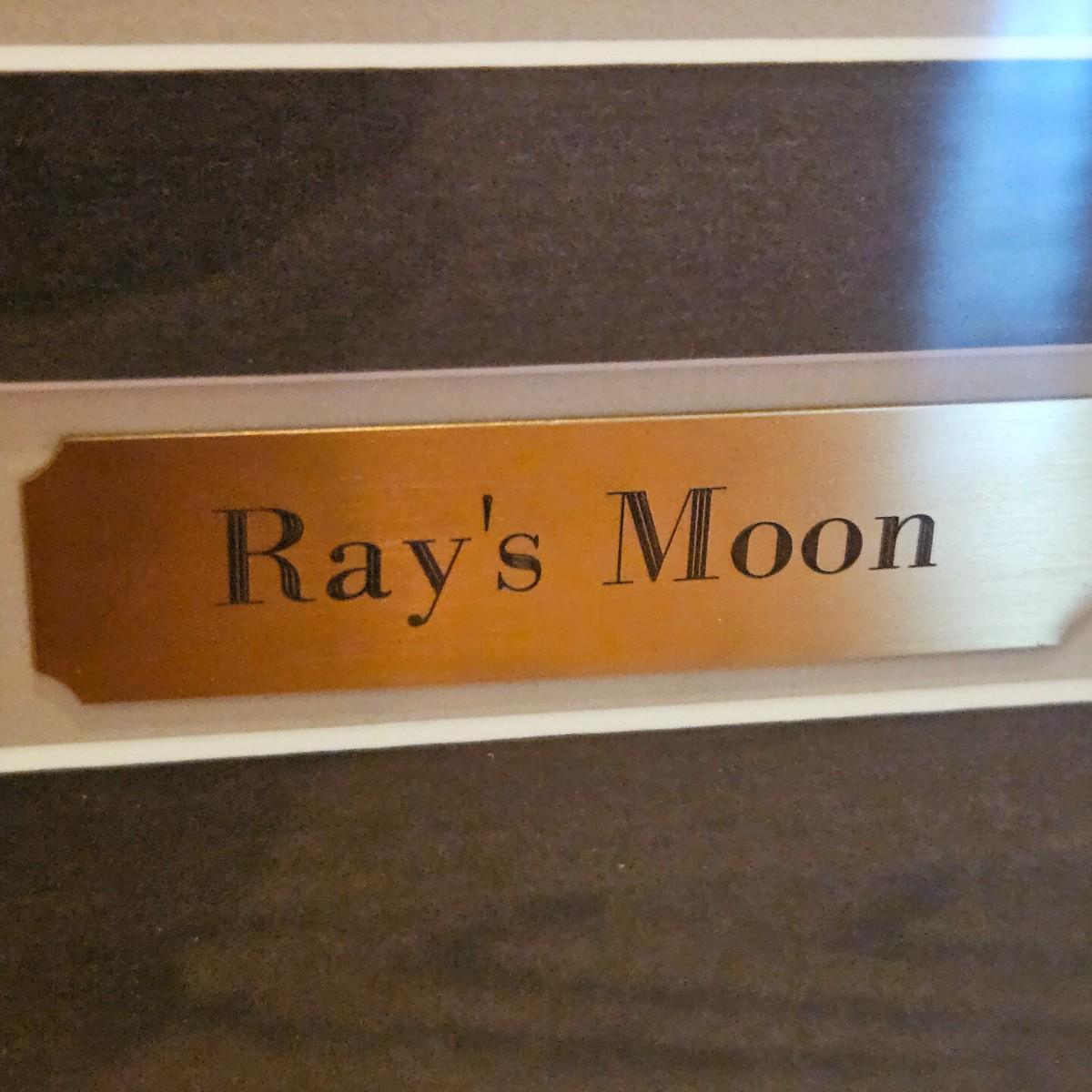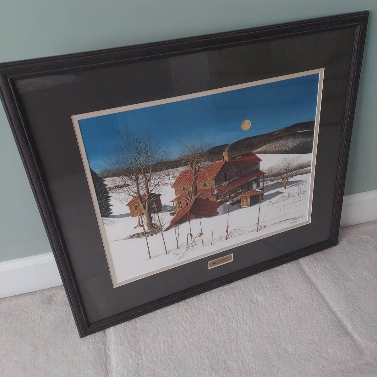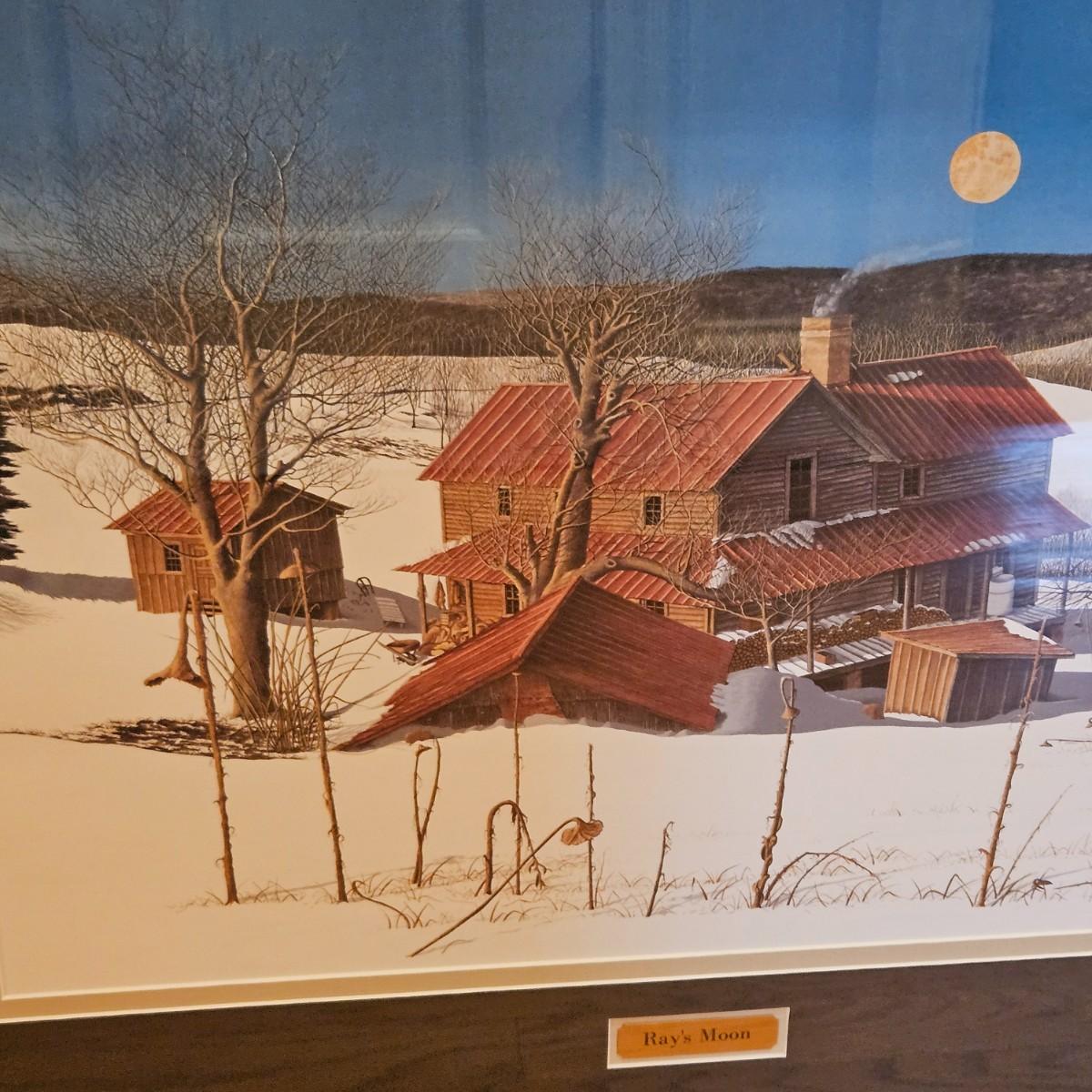 A signed and framed print by Bob Timberlake titled "Ray's Moon". It is framed in a solid wood frame with a black stain that is double matted with a brass plaque of the title. It includes the print sleeve and a certificate of authenticity. The frame measures approximately 35" x 29.5"H. Shipping available