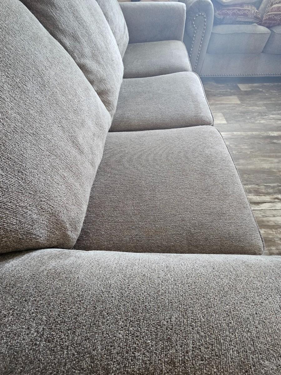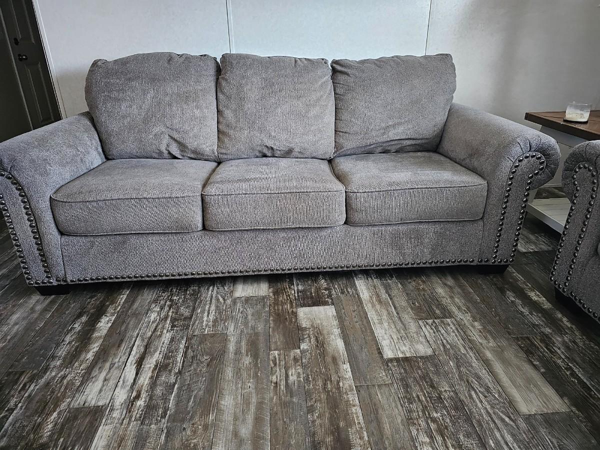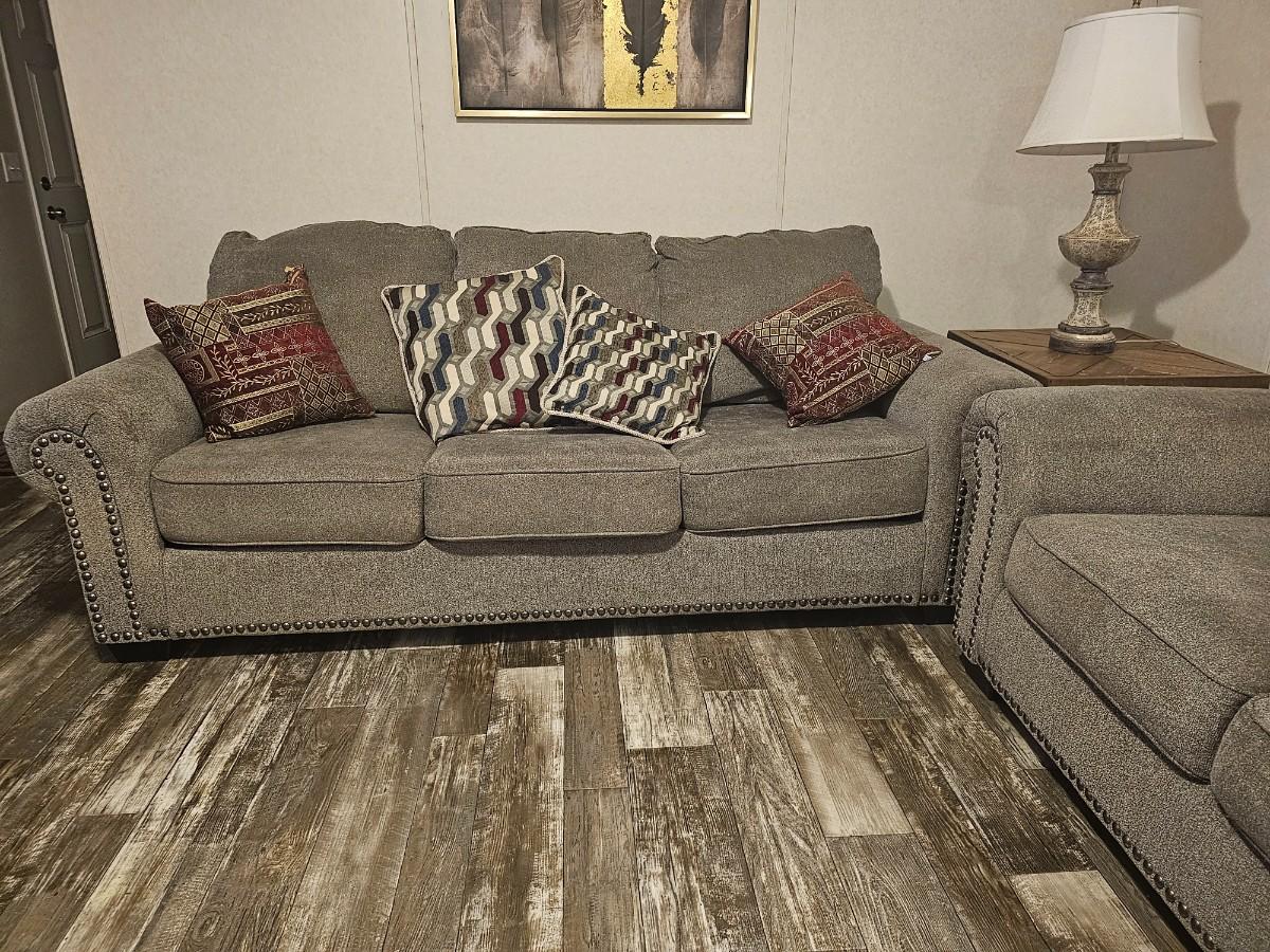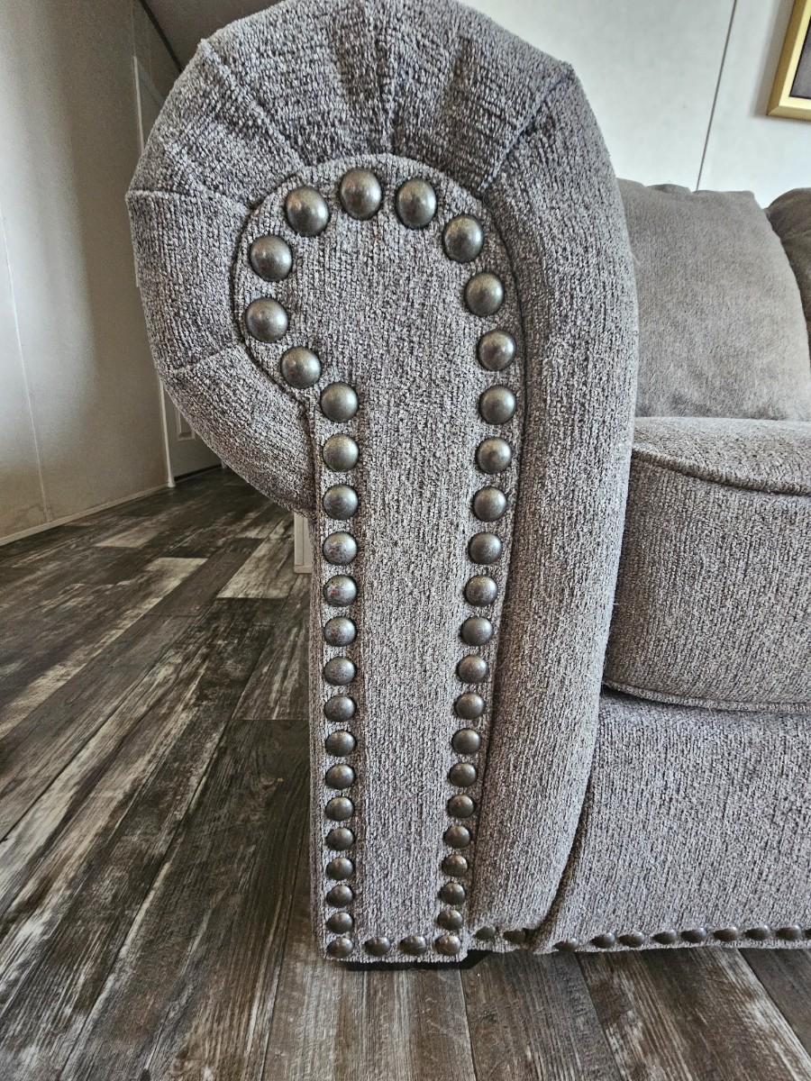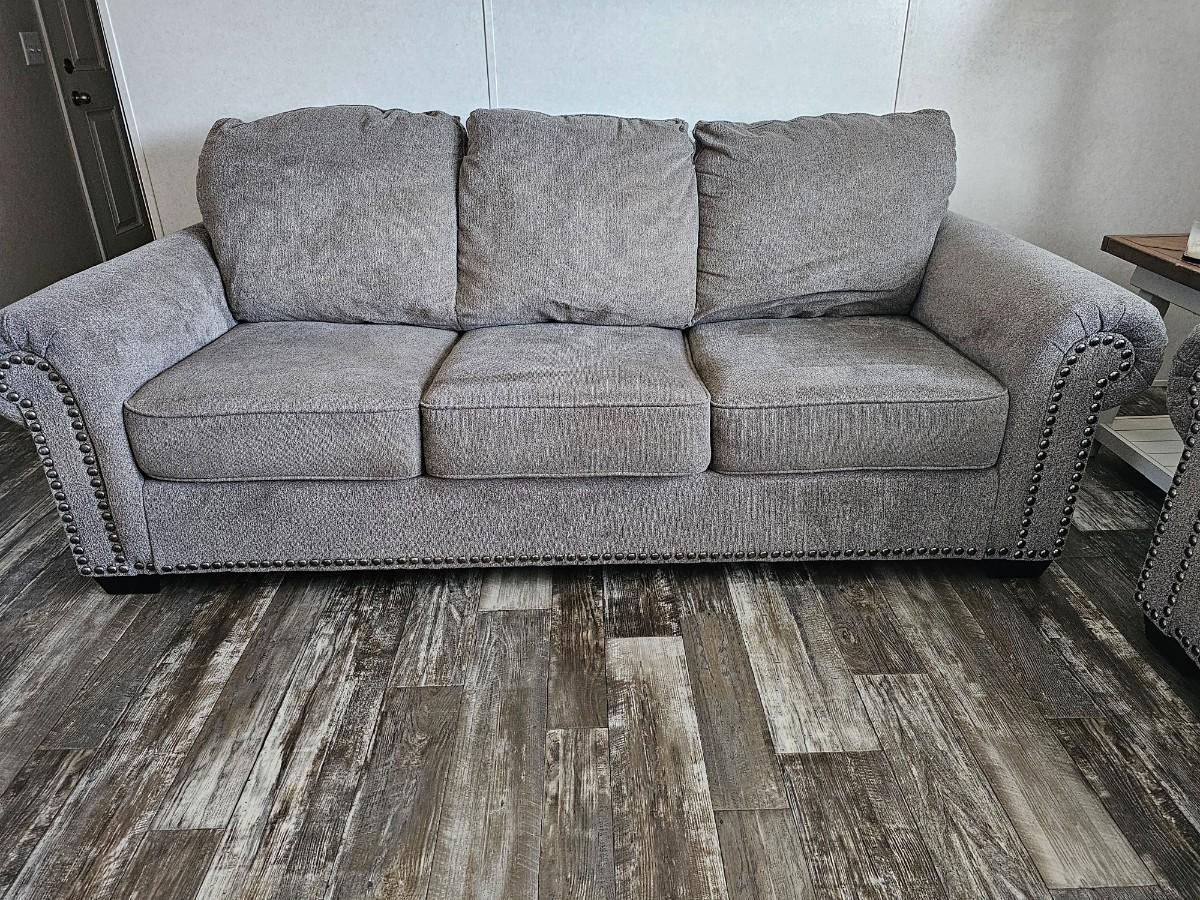 Only 3 years old. The Fermoy sofa’s timeless flair is easy to love. Curvaceous Charles of London arms beautifully go with the flow, as does this sofa’s rich pewter-tone upholstery for a new twist on neutral. Fine details including elegantly turned bun feet and four designer toss pillows perfect the aesthetic.