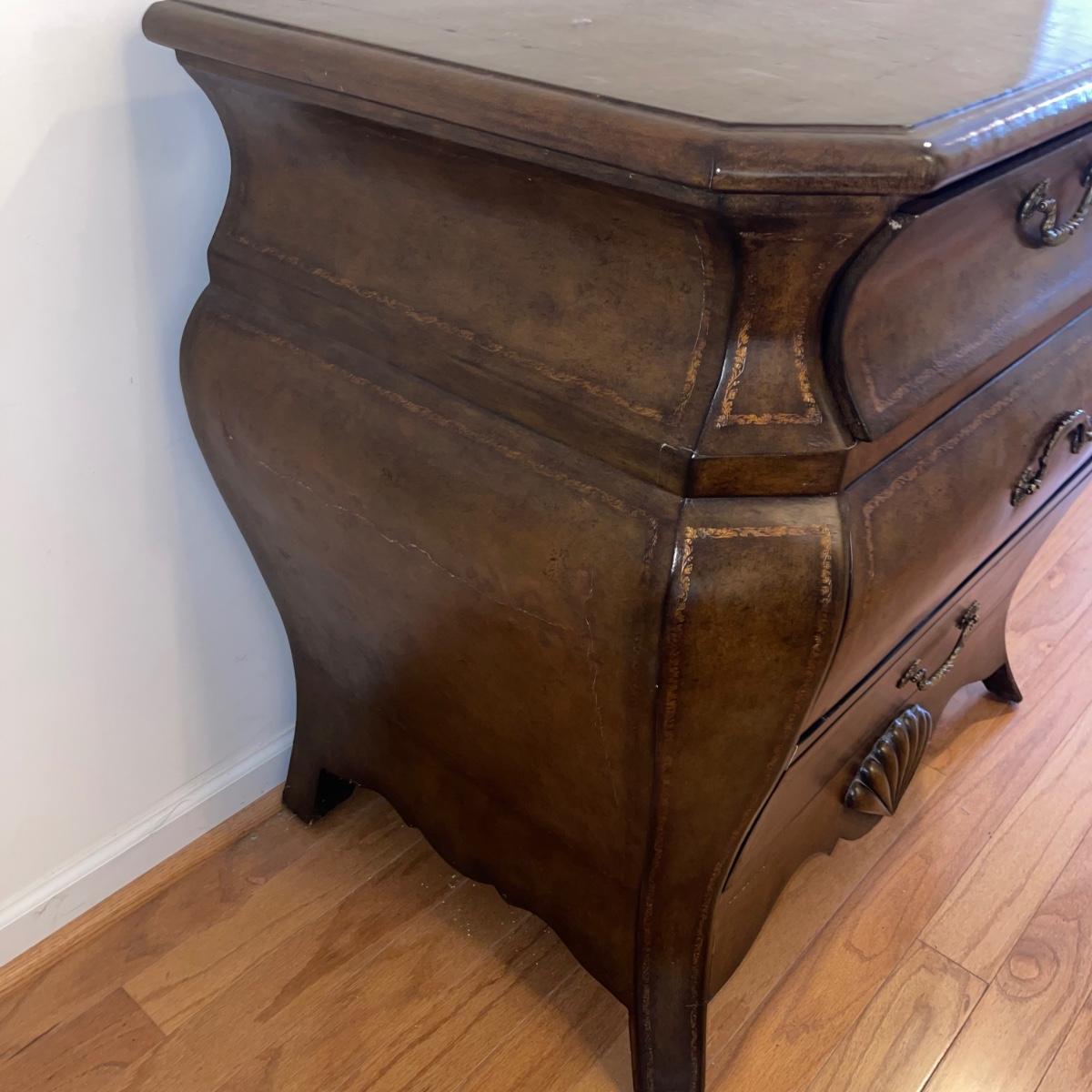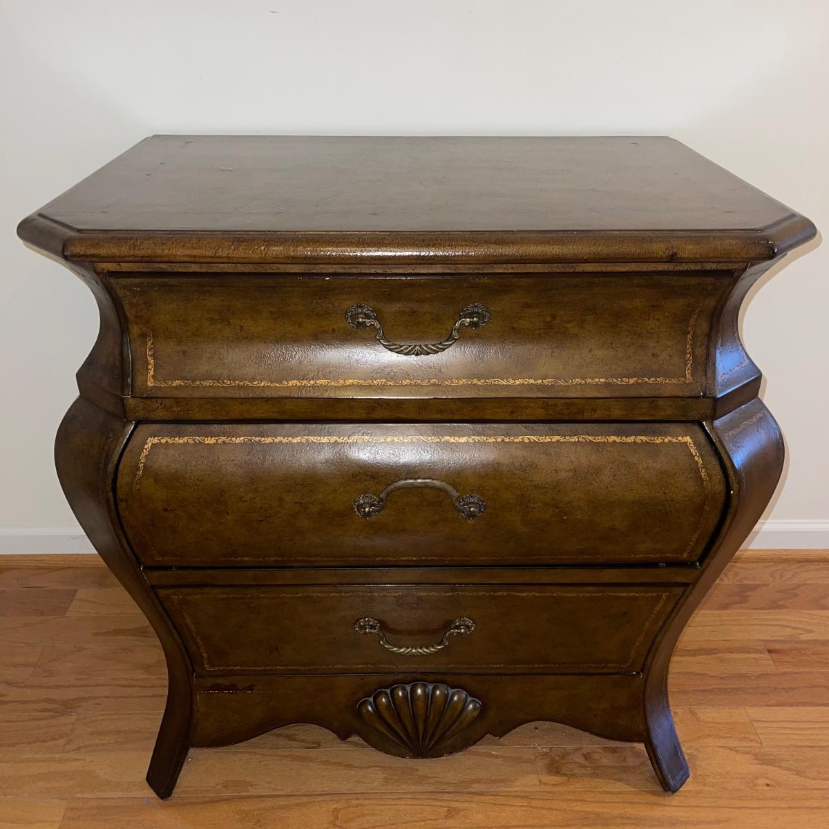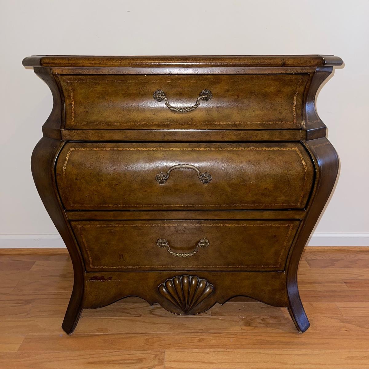 Three drawer dresser from Signatures by Heritage. It is a gold/brown color and is uniquely shaped. At its widest points, it measures 33” x 22.5” x 33”.