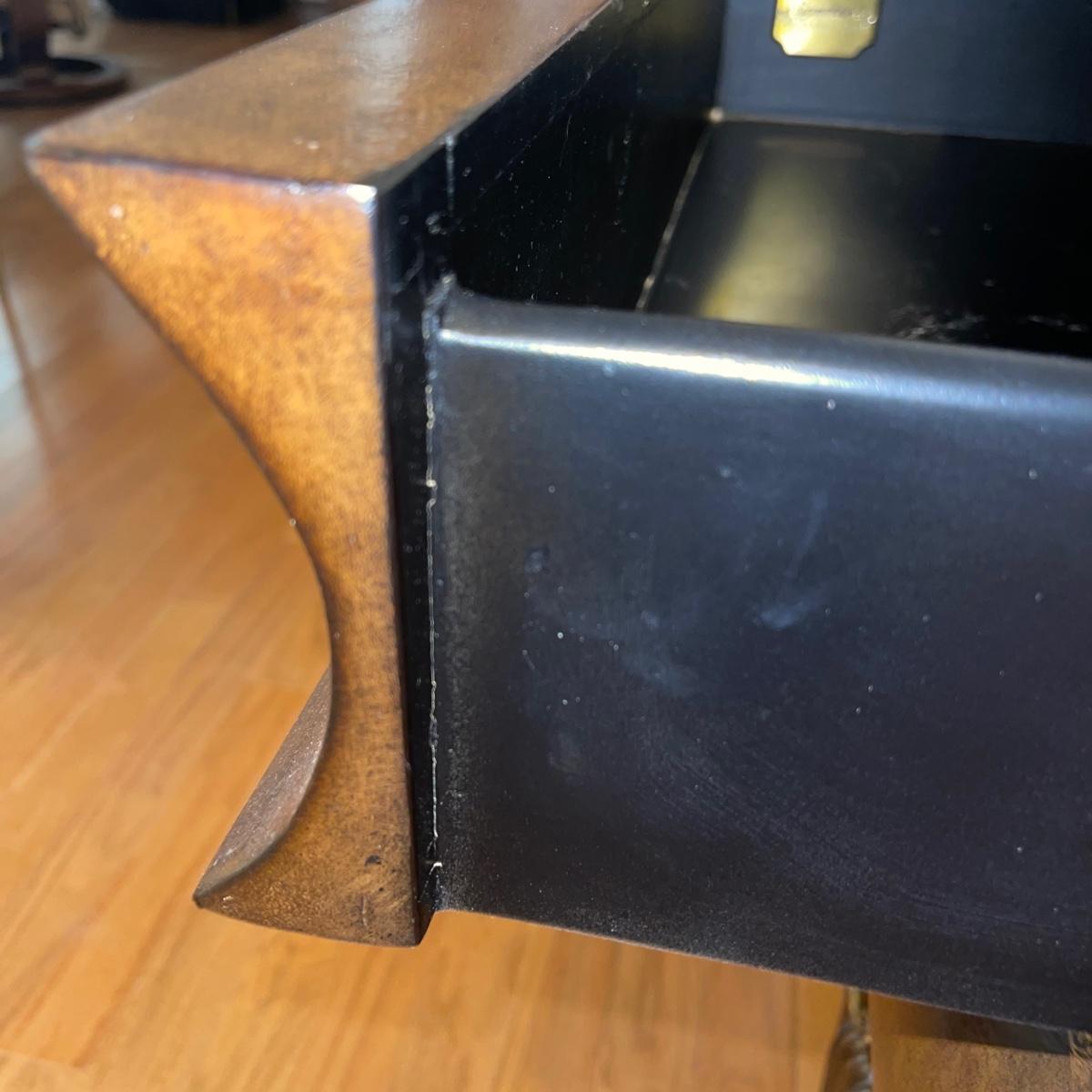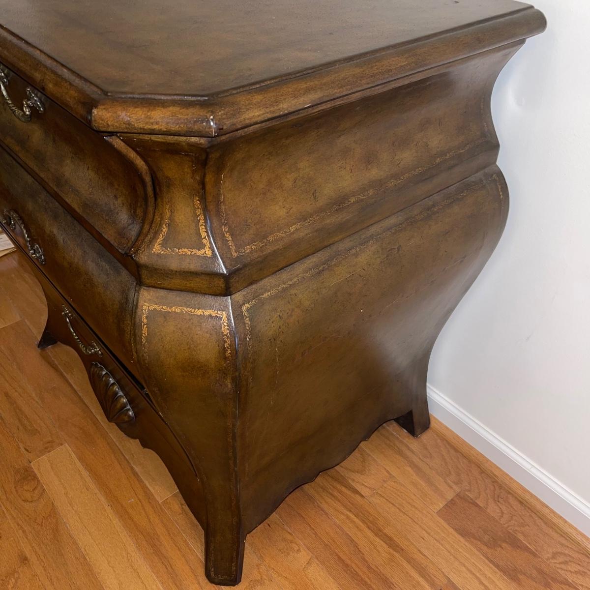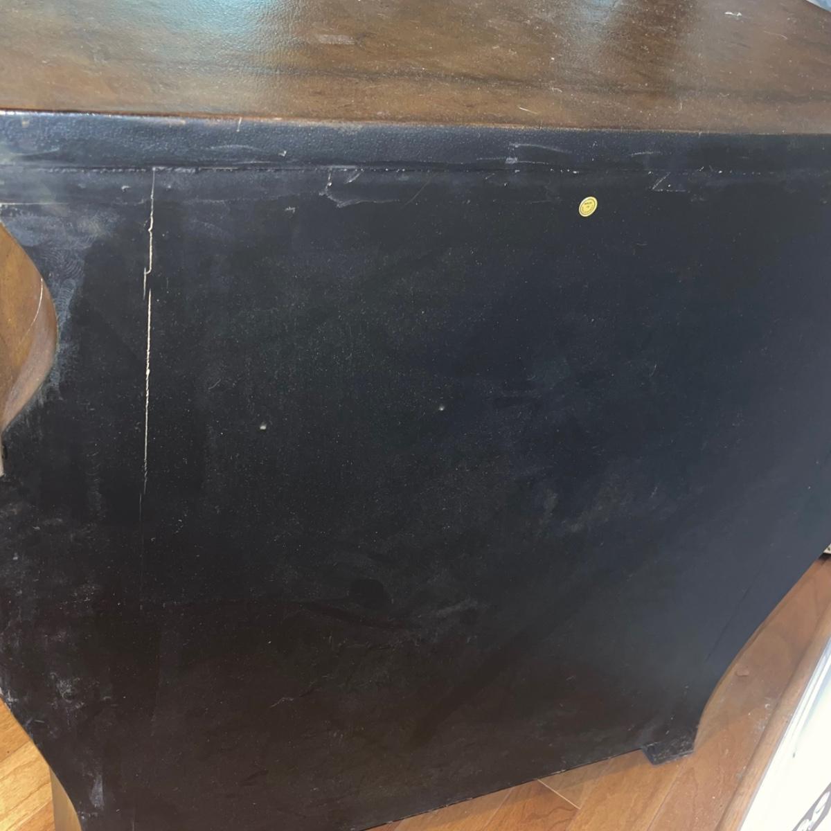 Three drawer dresser from Signatures by Heritage. It is a gold/brown color and is uniquely shaped. At its widest points, it measures 33” x 22.5” x 33”.